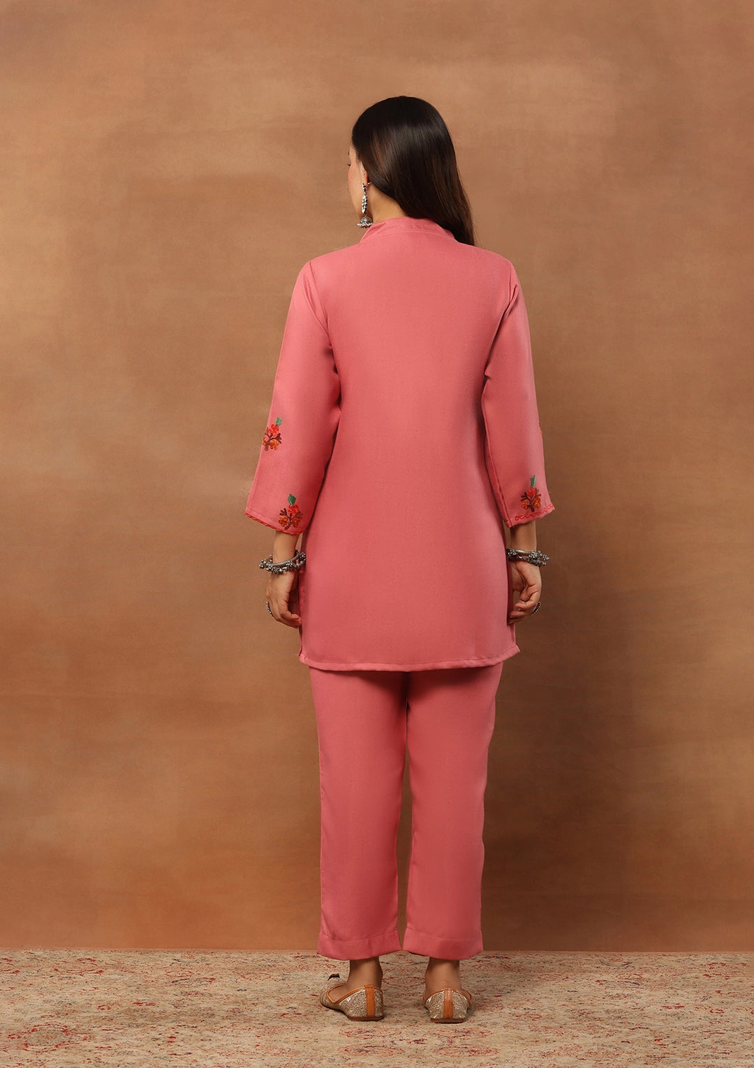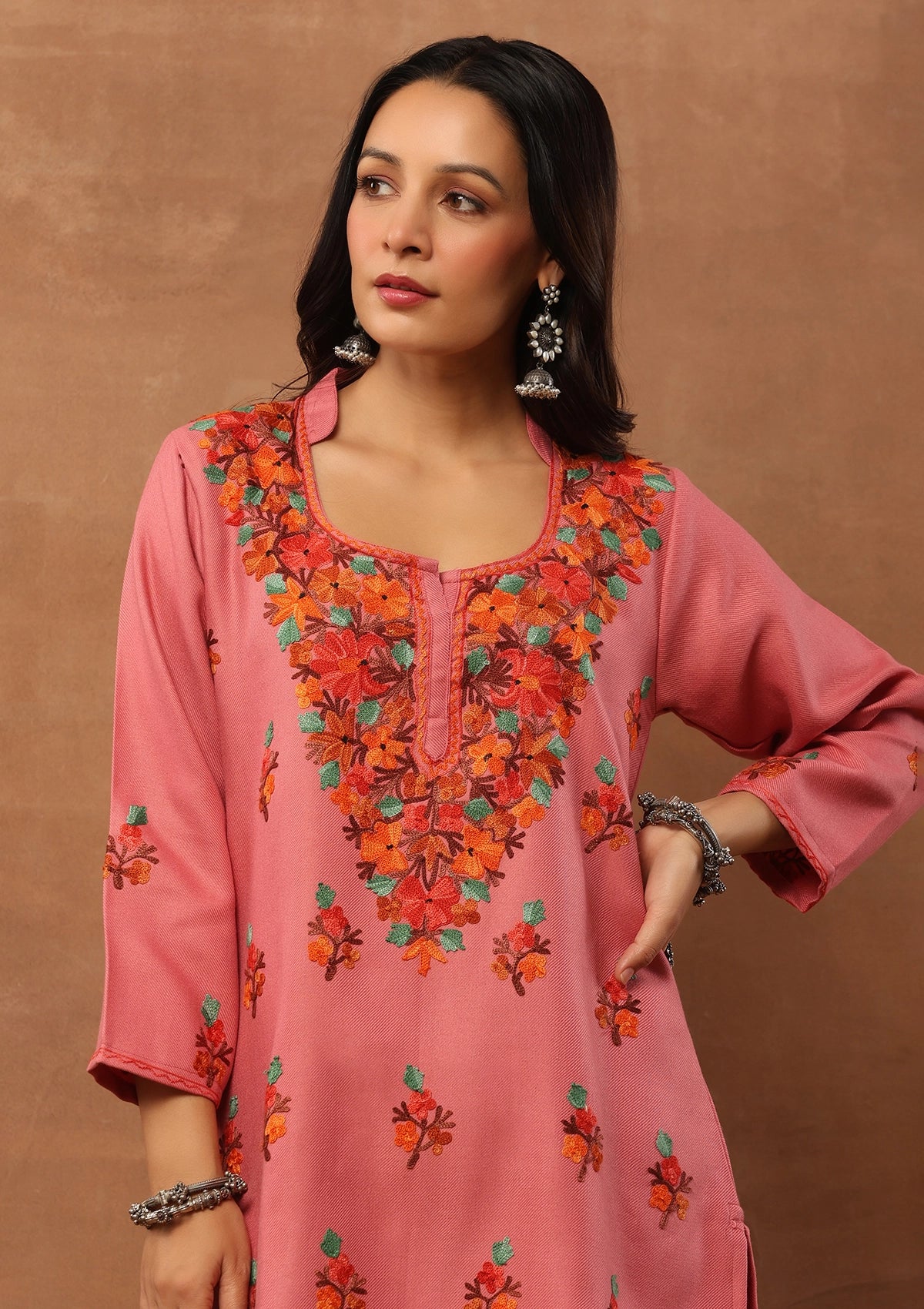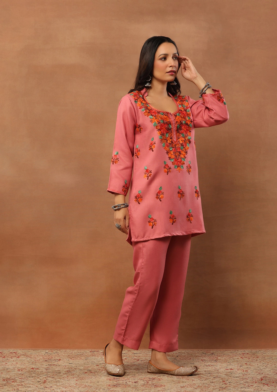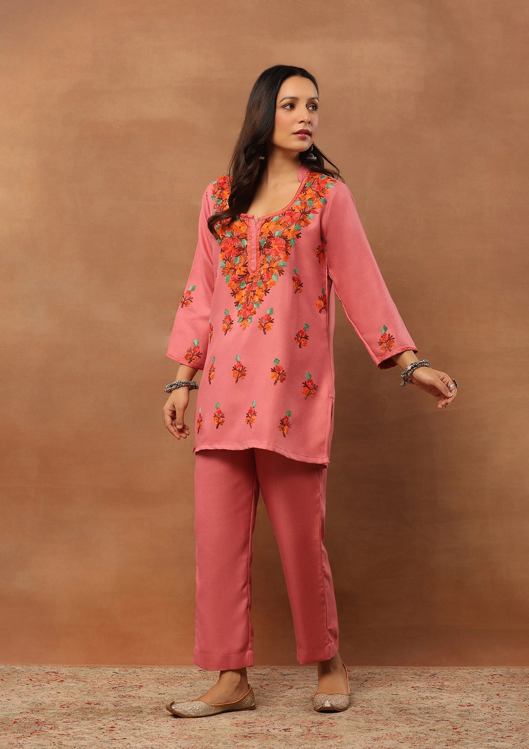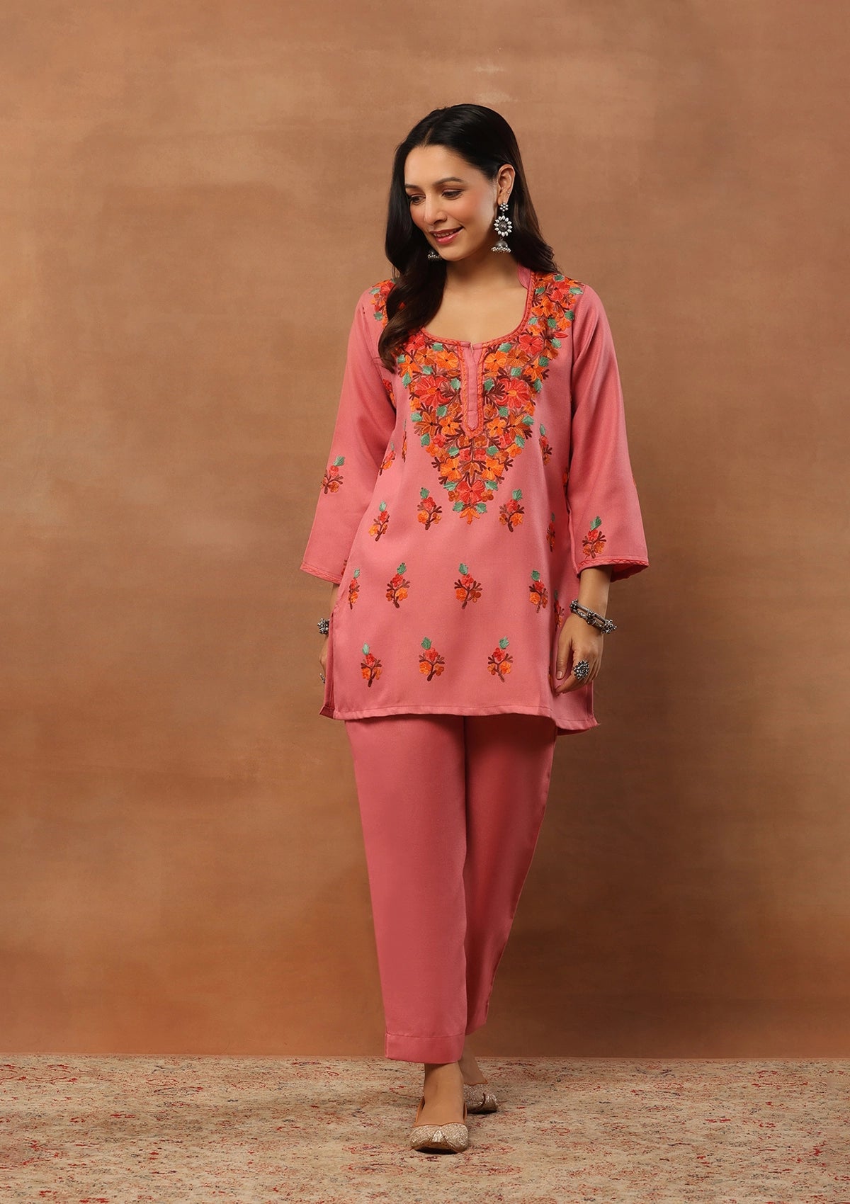HOC Woollen Aari Embroidered Solid Women's 2 PC Short Kurta Set - Pink