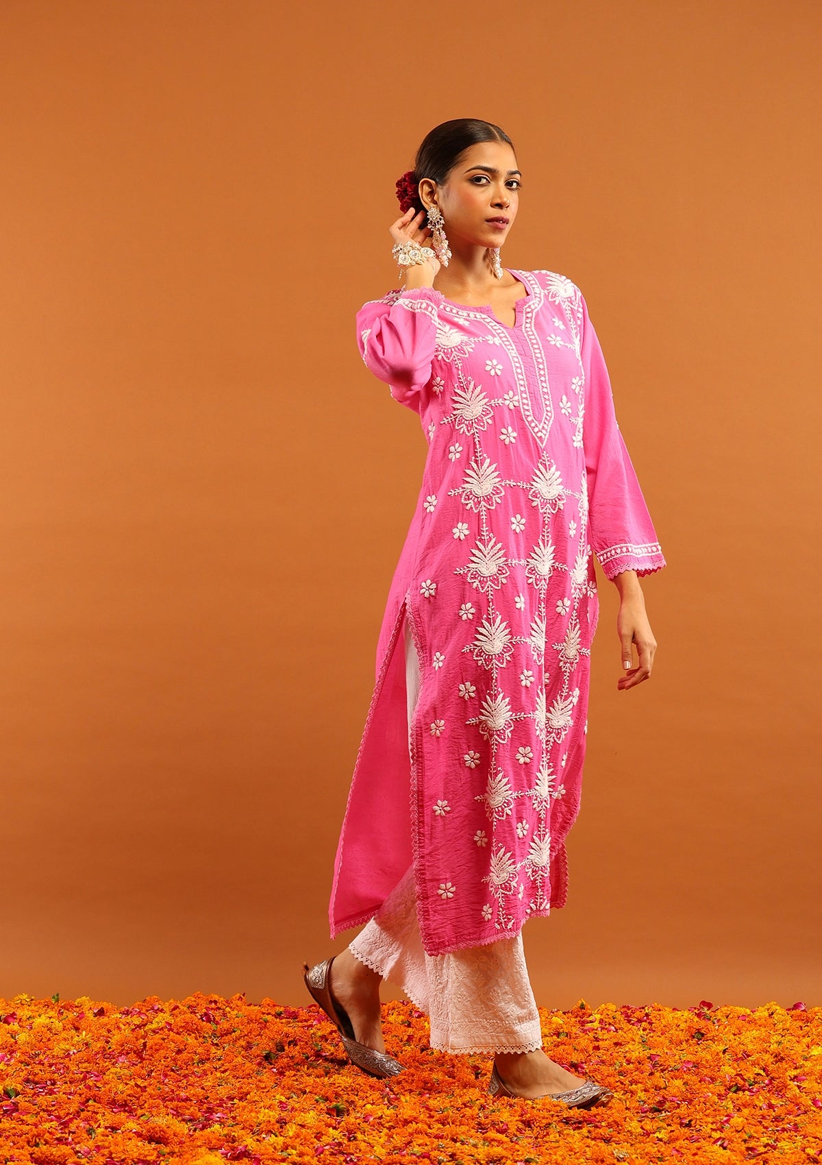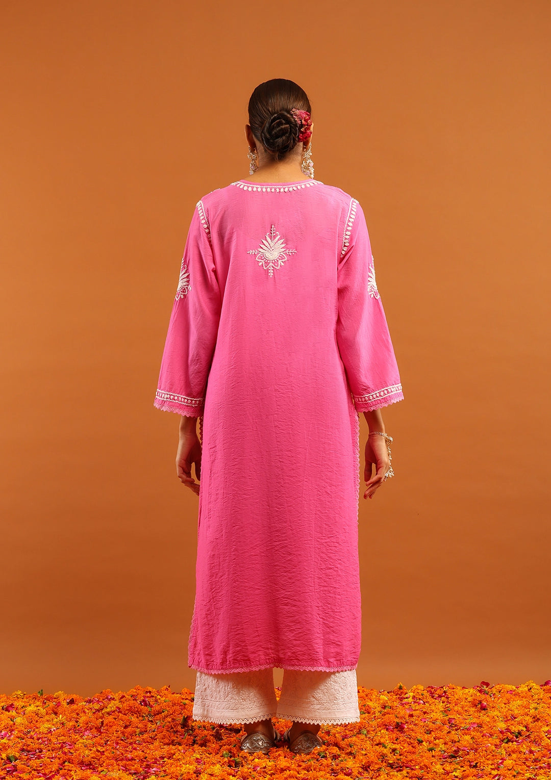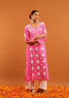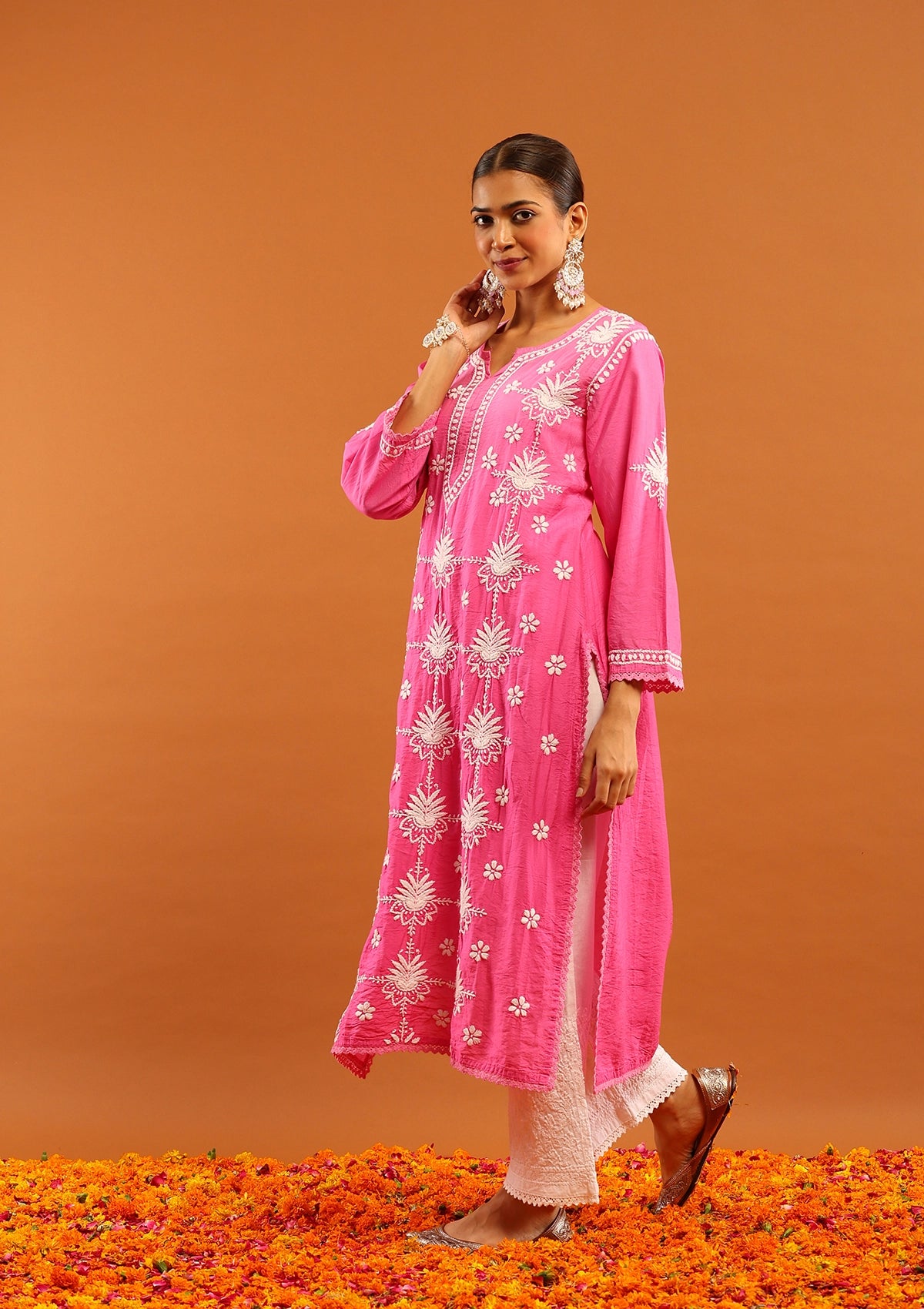 HOC Chanderi Chikankari Ombre Women's Long Kurta-Pink