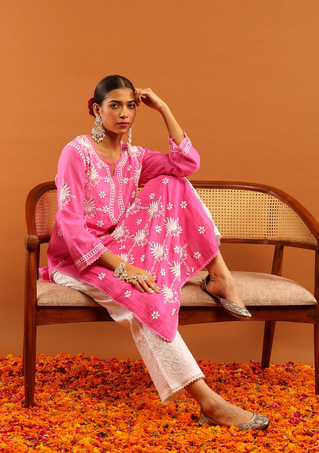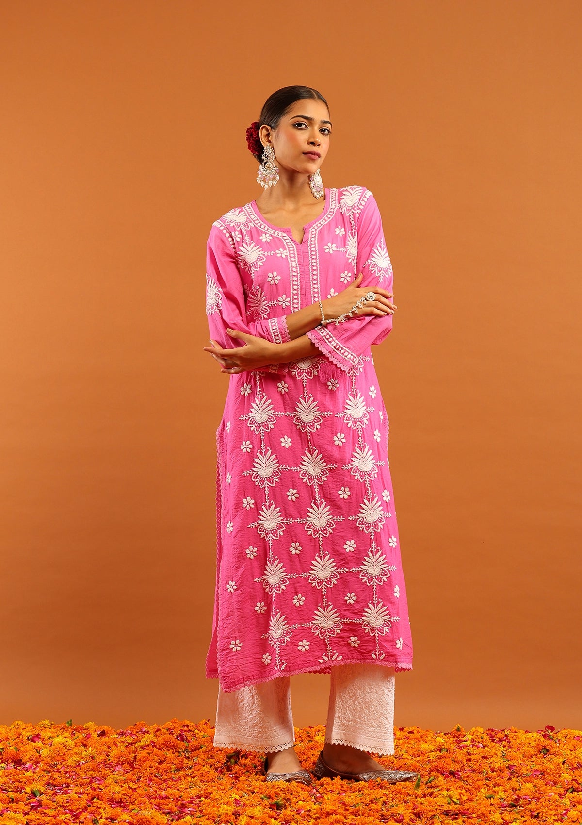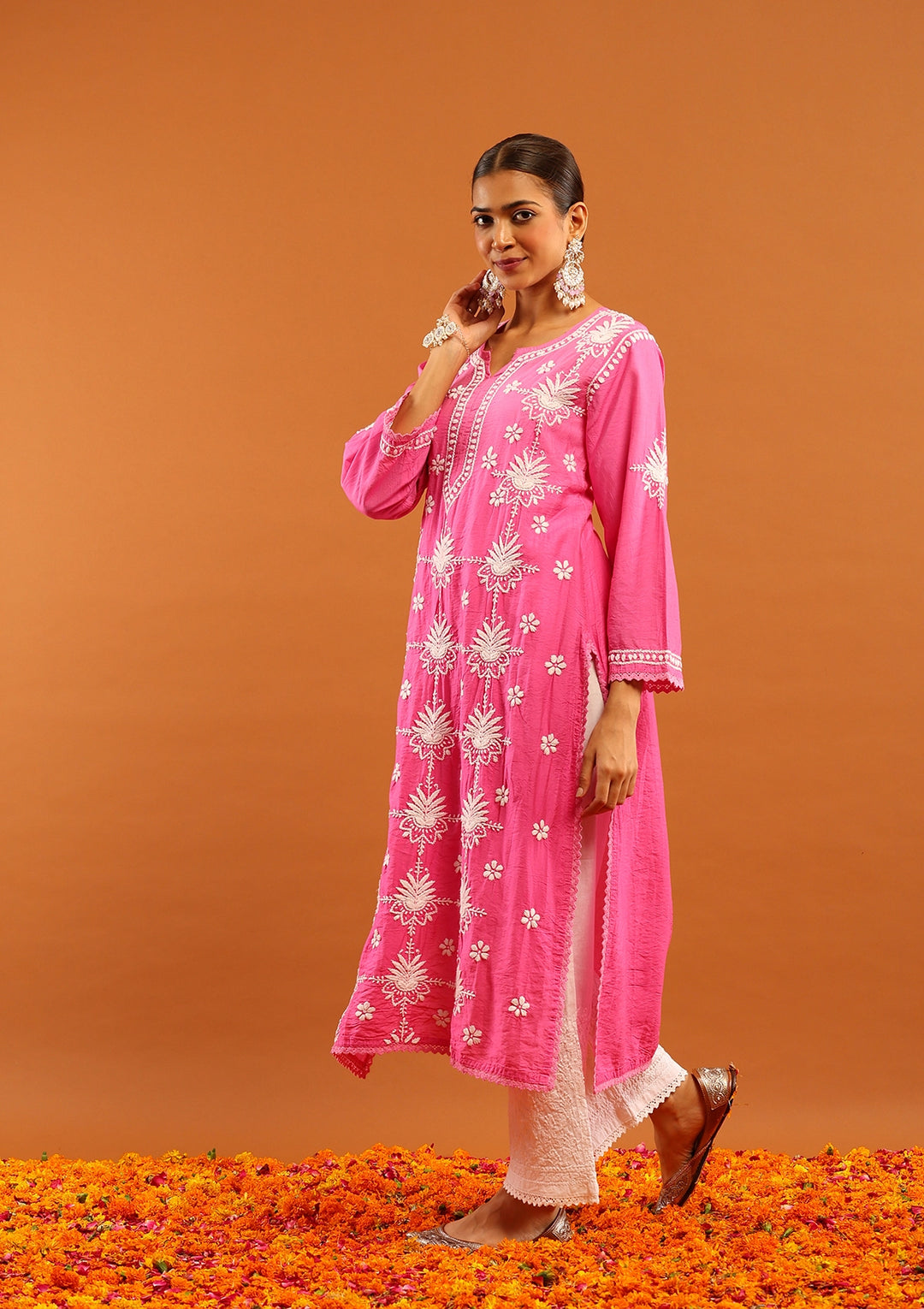 HOC Chanderi Chikankari Ombre Women's Long Kurta-Pink