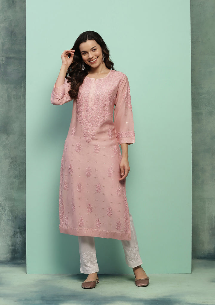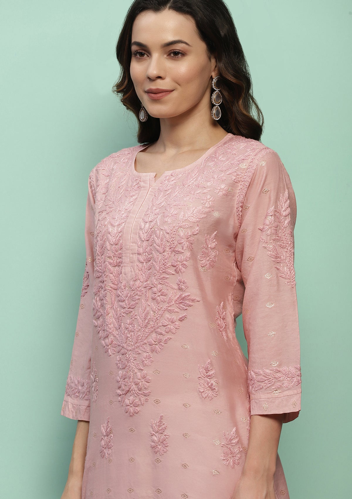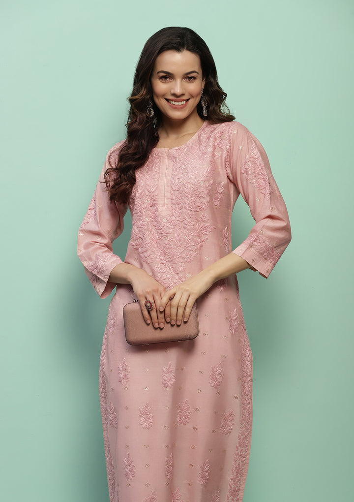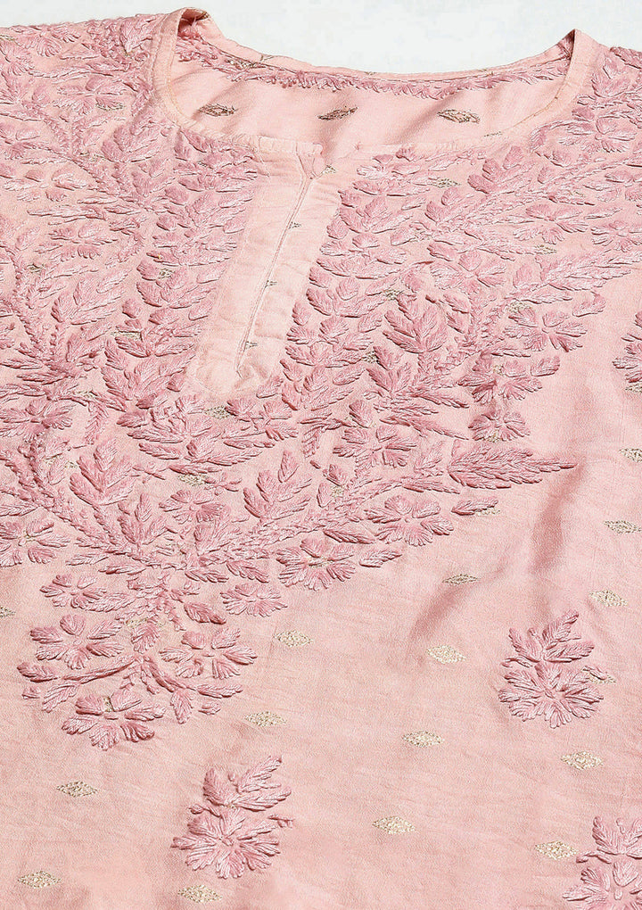 HOC Chanderi Chikankari Solid Women's Long Kurta - Dust Pink