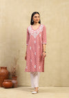 HOC Cotton Chikankari Printed Women's Long Kurta - Dust Pink