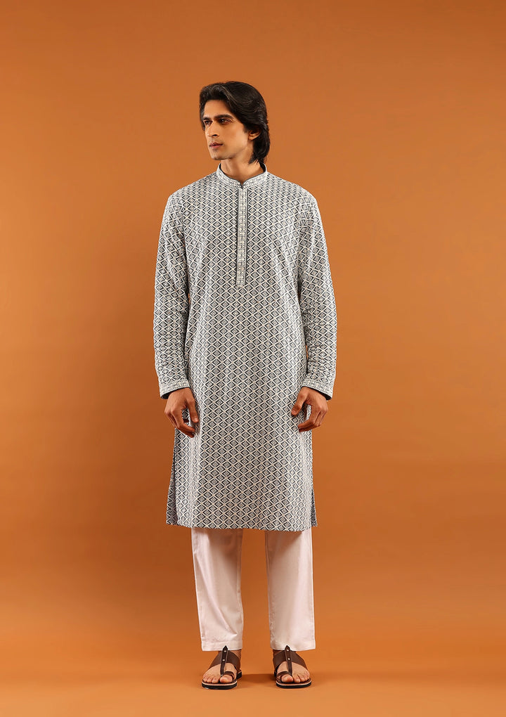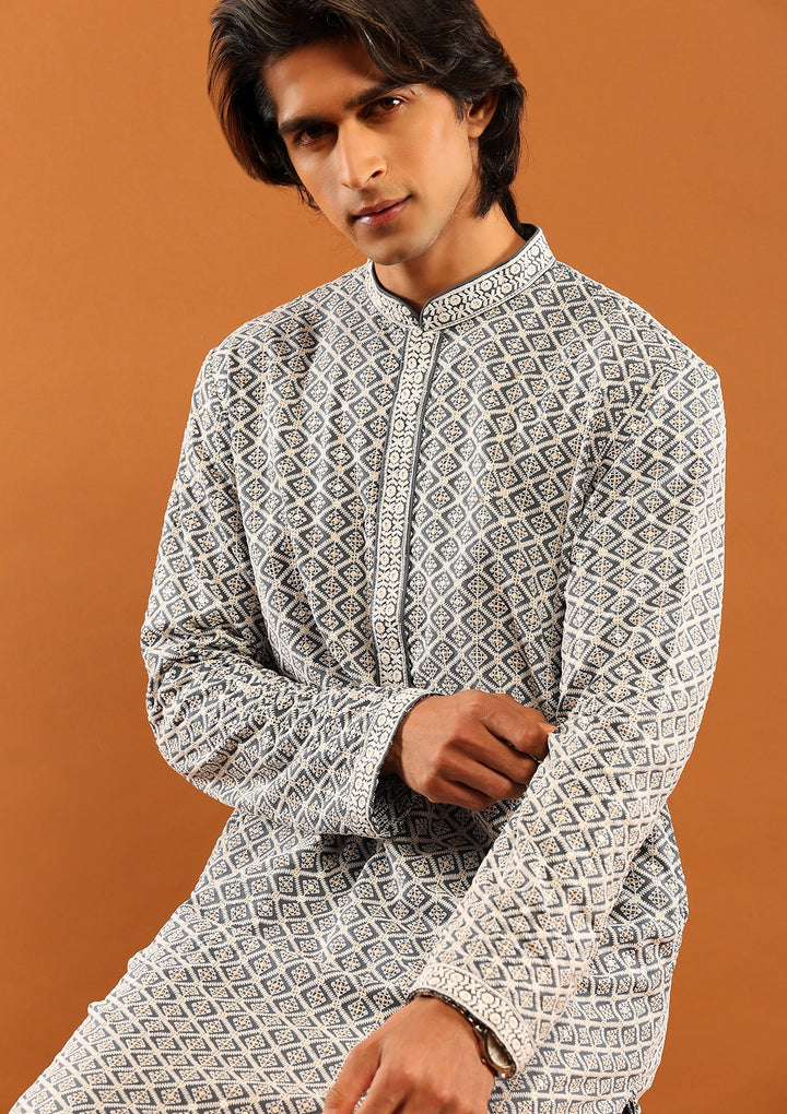 HOC Rayon Embroidered With Sequins Solid Men's Long Kurta- Grey