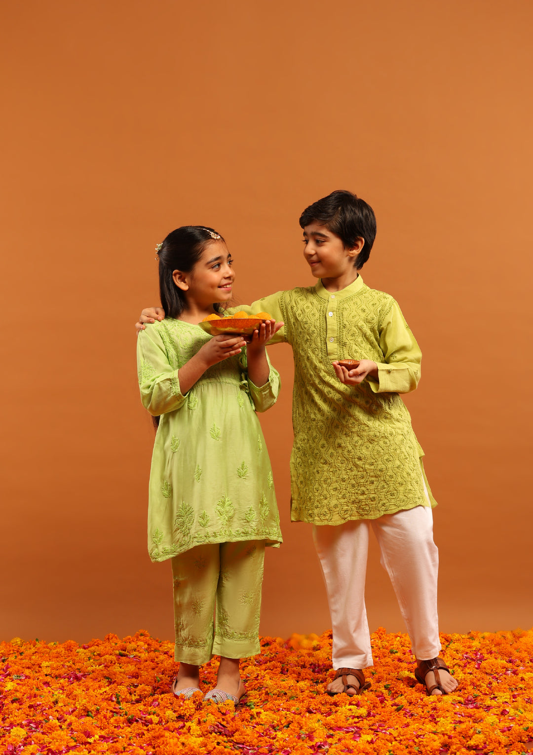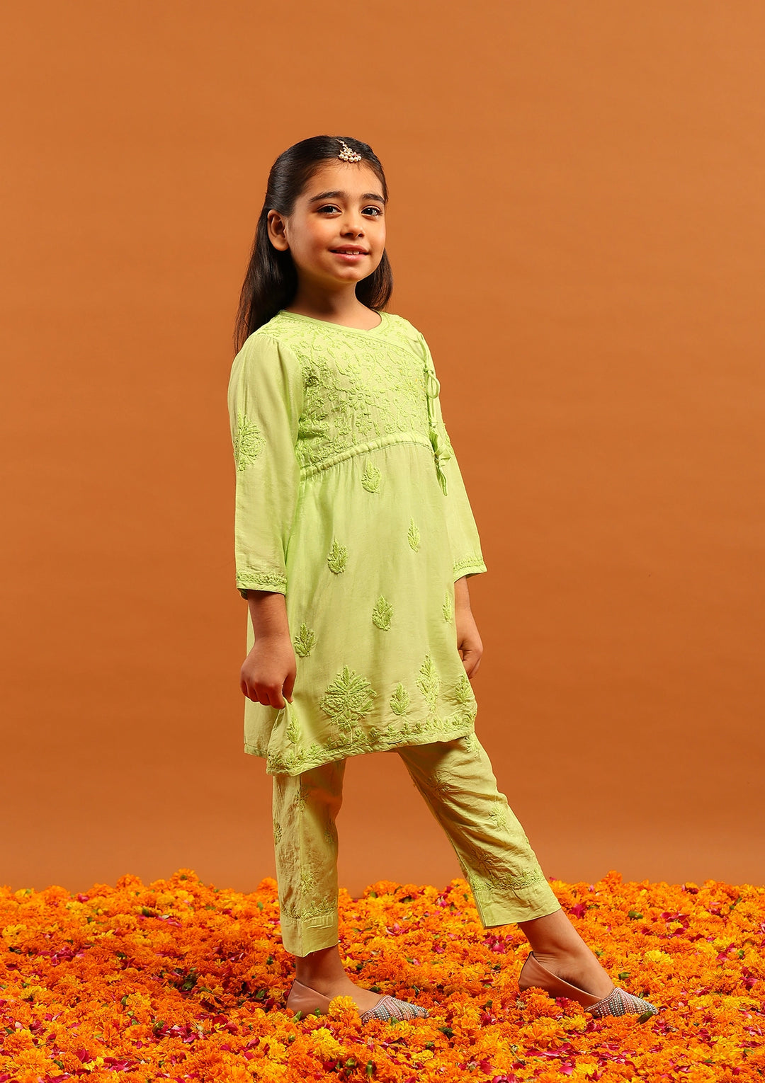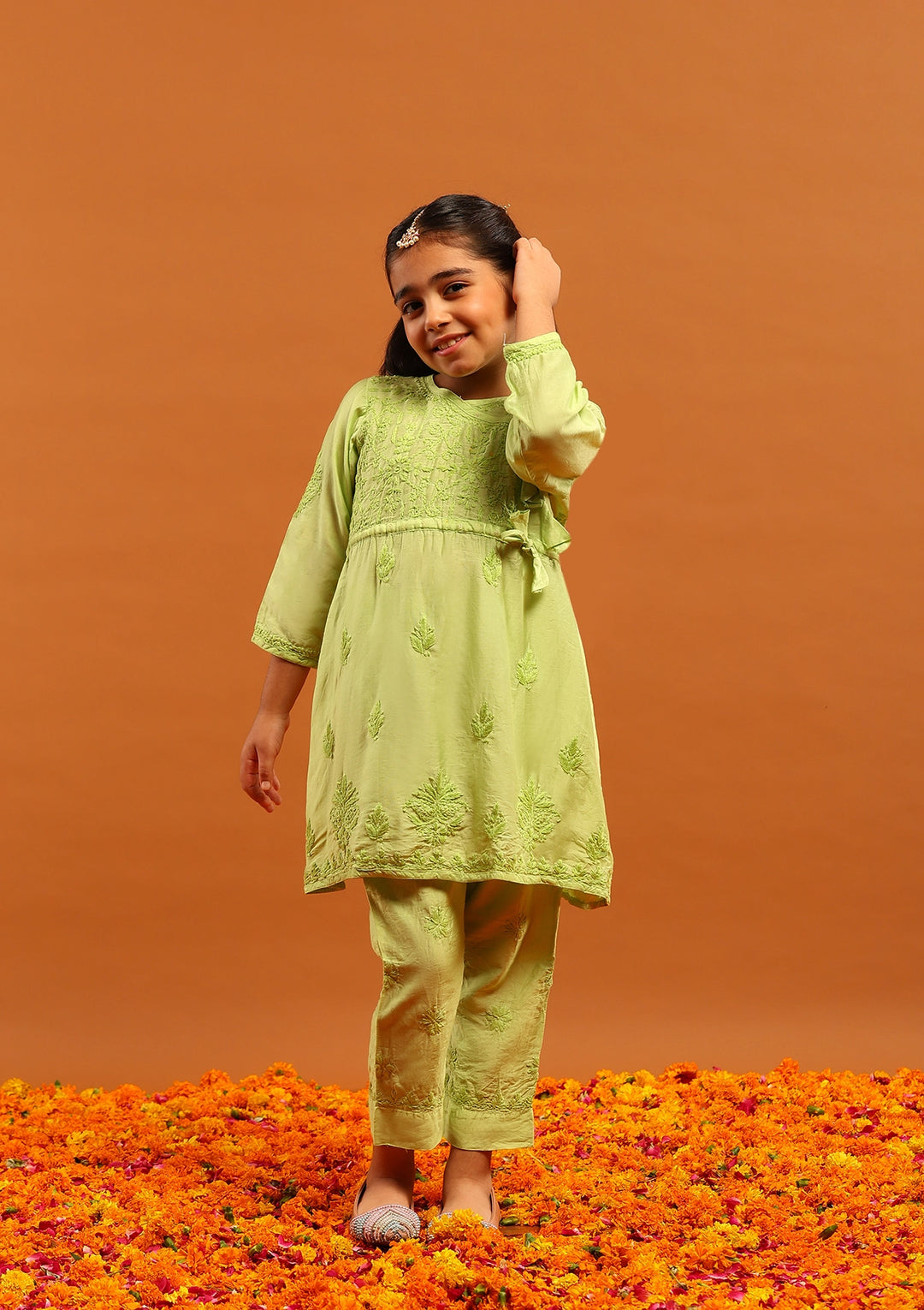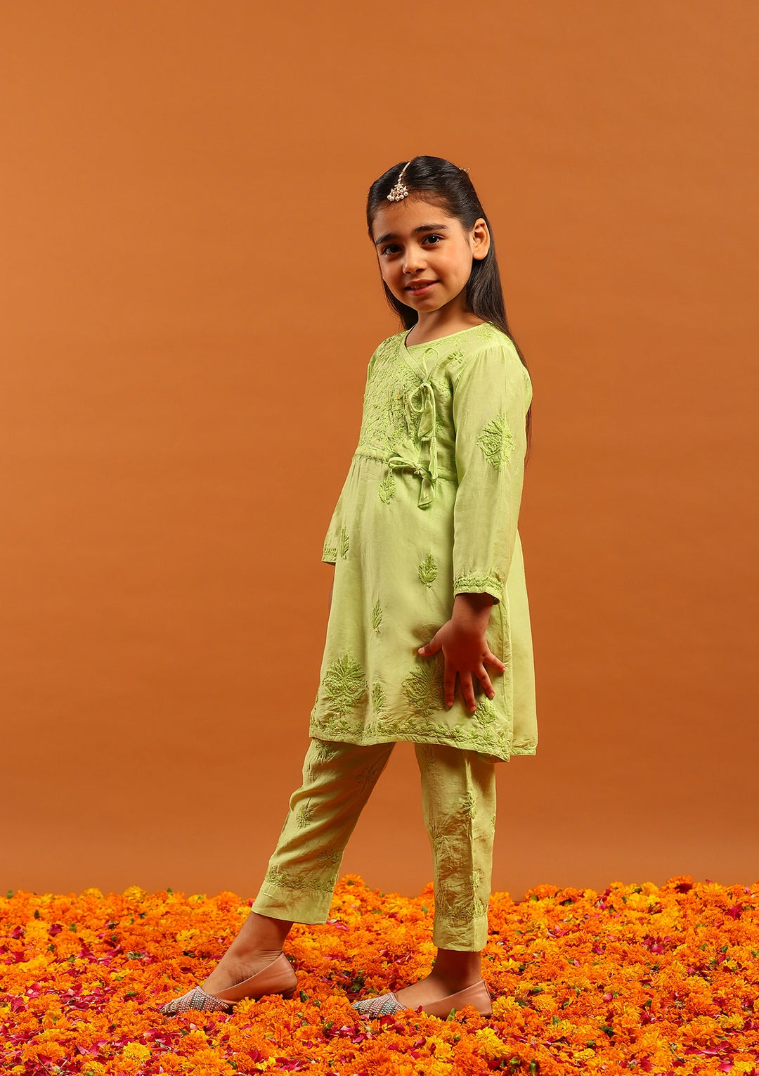 HOC Chanderi Chikankari Solid Girl's 2 PC Kurta Set Angrakha-Green