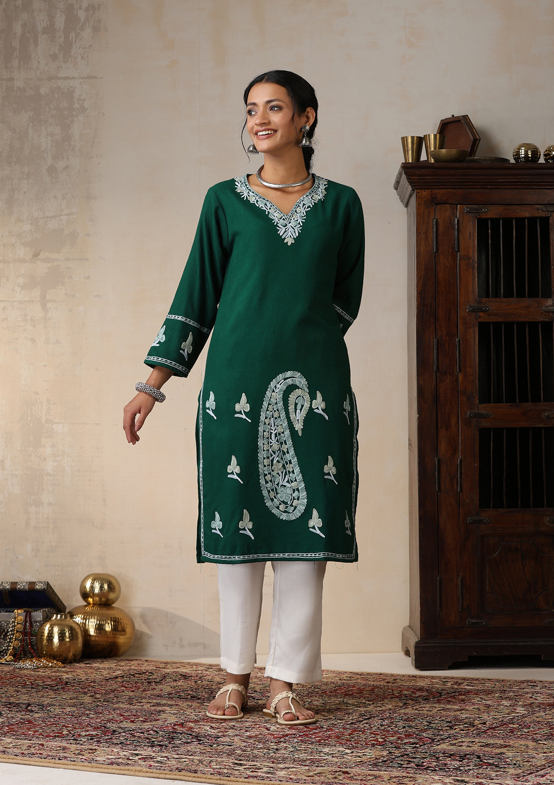 HOC Kashmiri Wool Aari Embroidered Solid Women's Long Kurta - Green