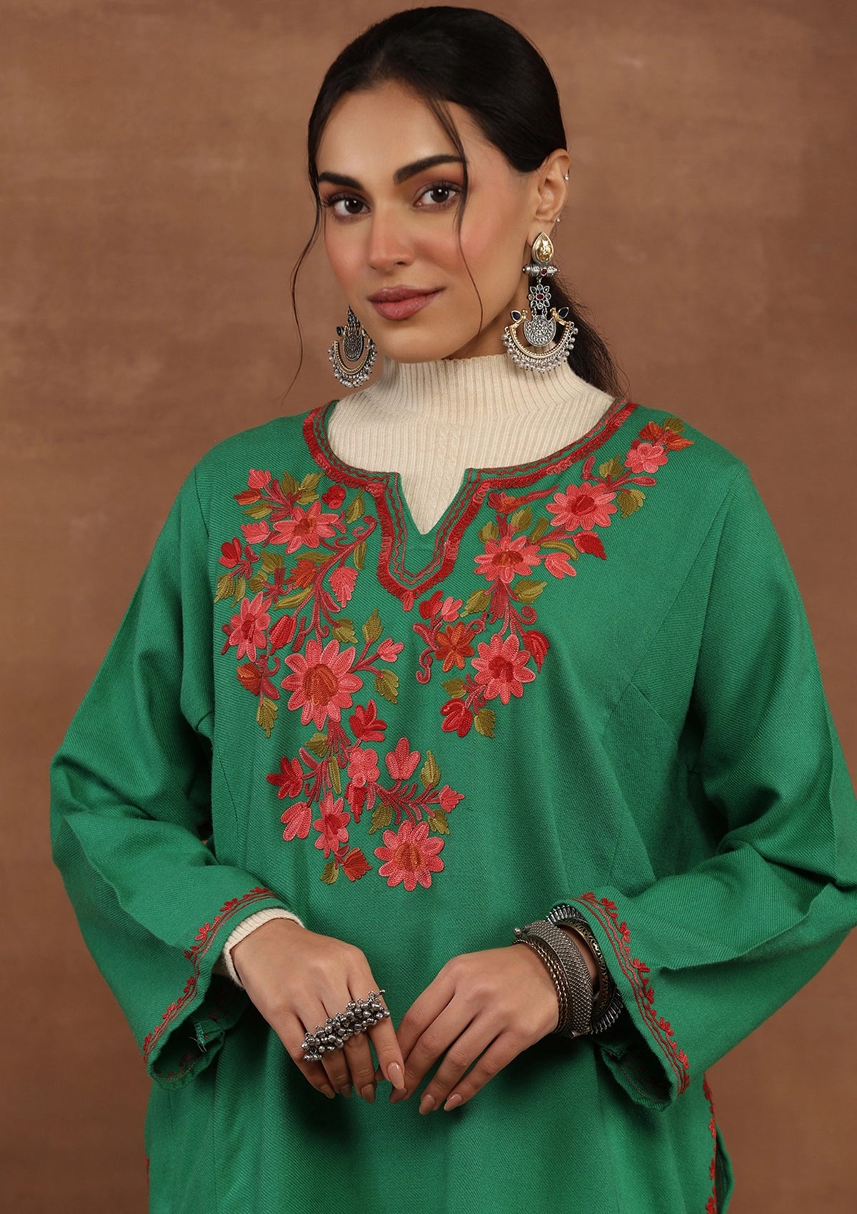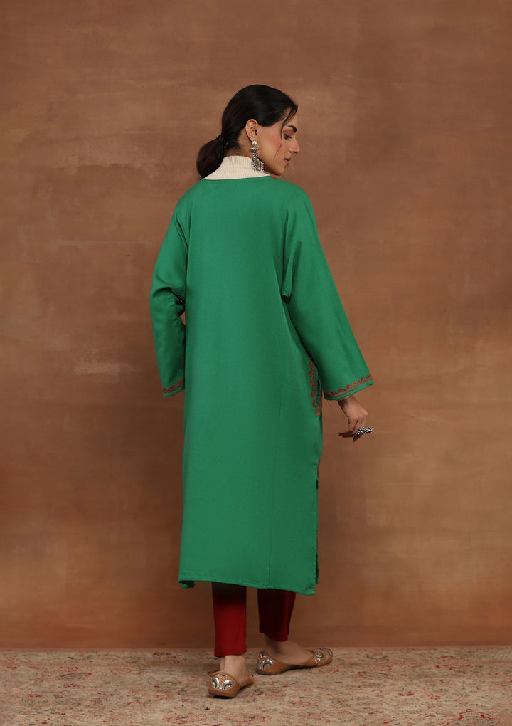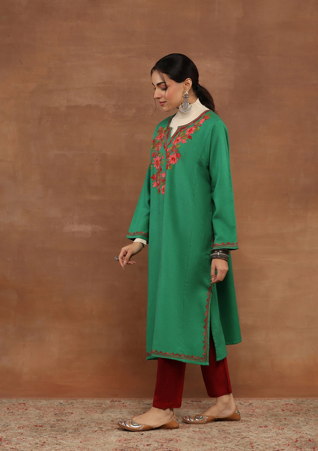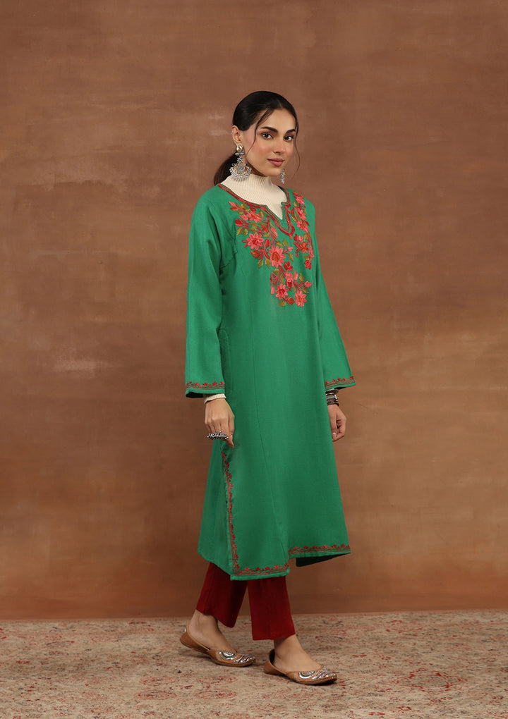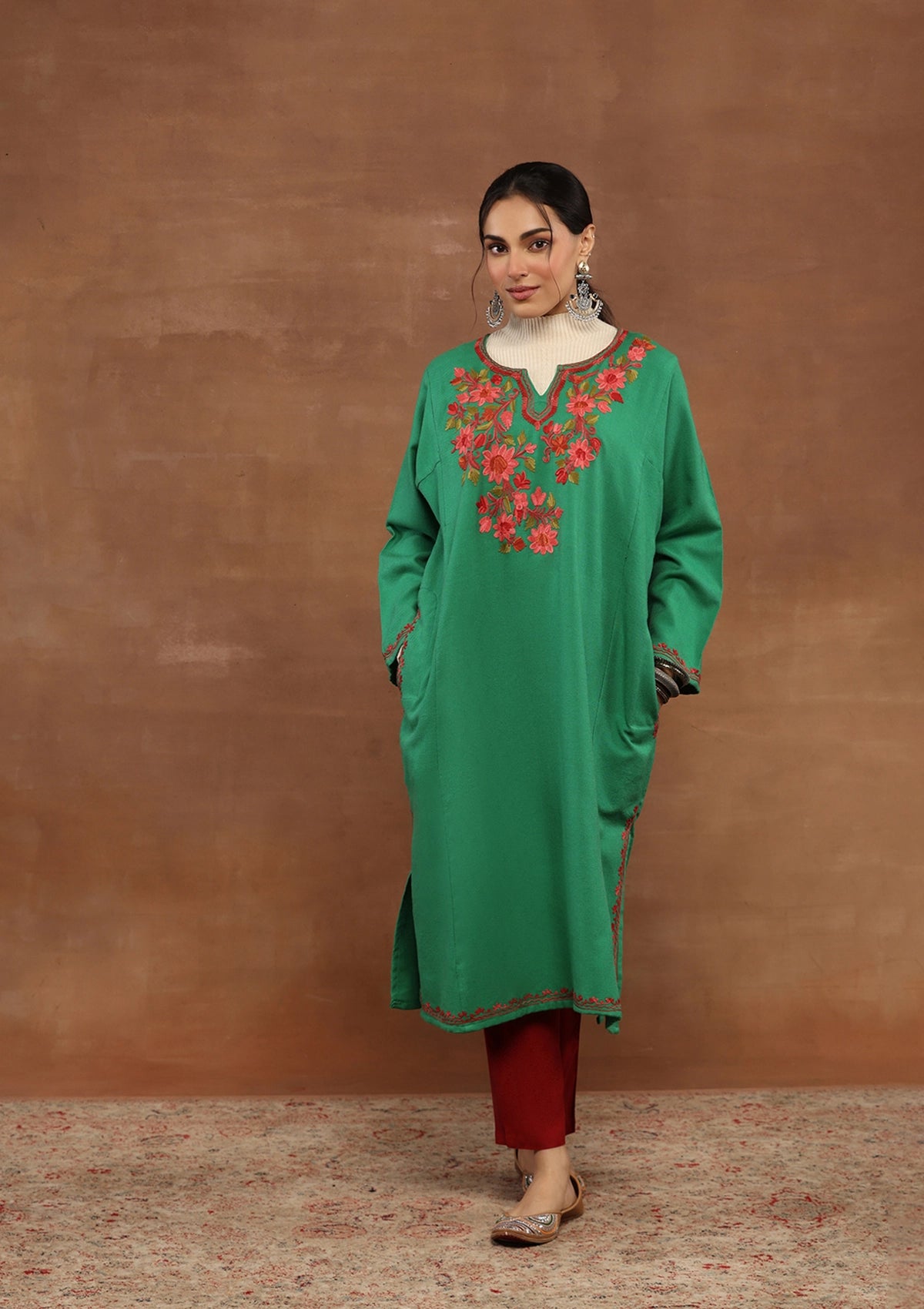 HOC Kashmiri Wool Aari Embroidered Solid Women's Phiran Kurta -Green