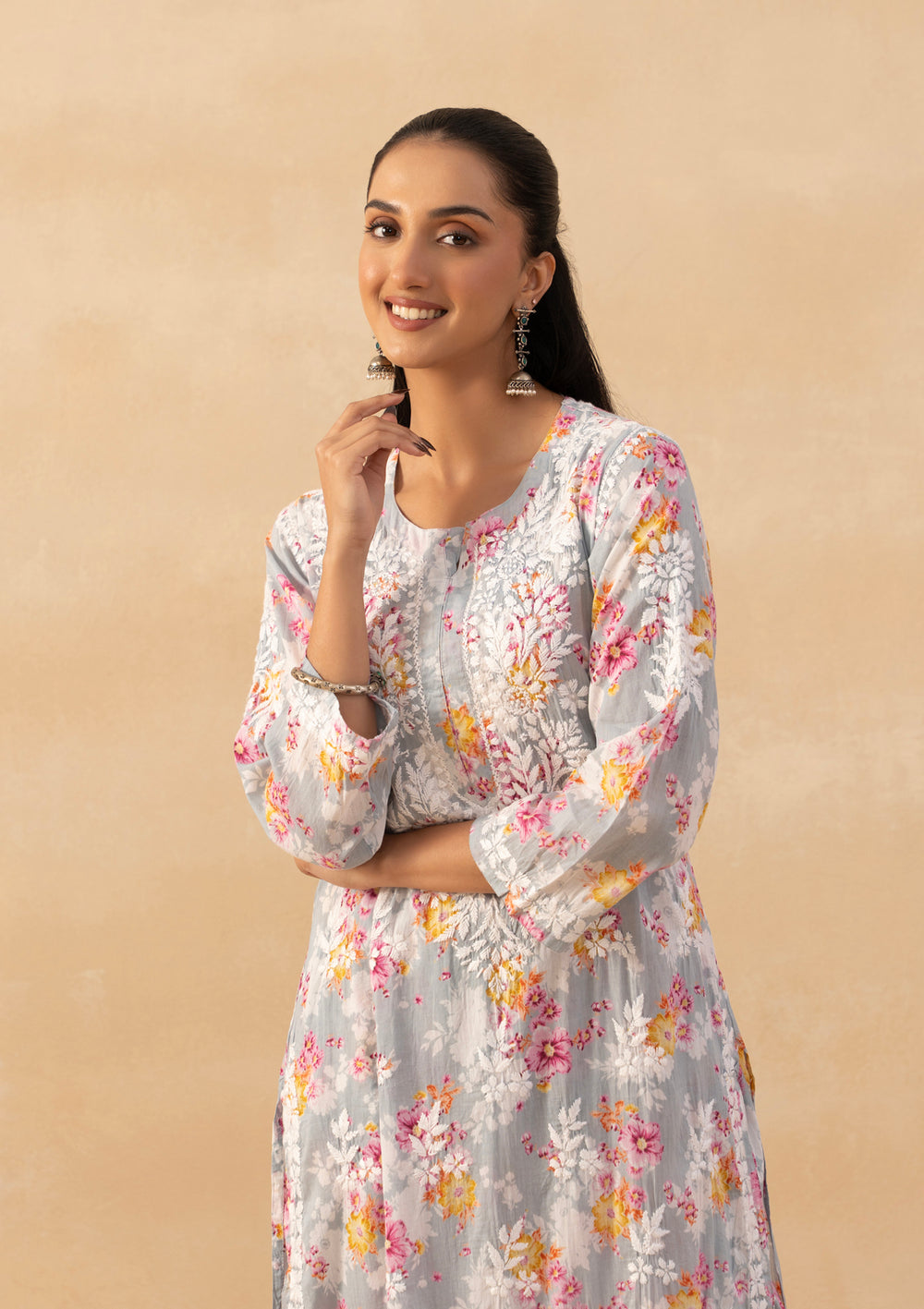 Mulmul Chikankari Printed Women's Kurta Set - Grey