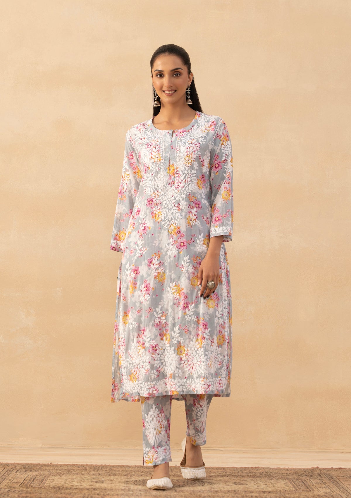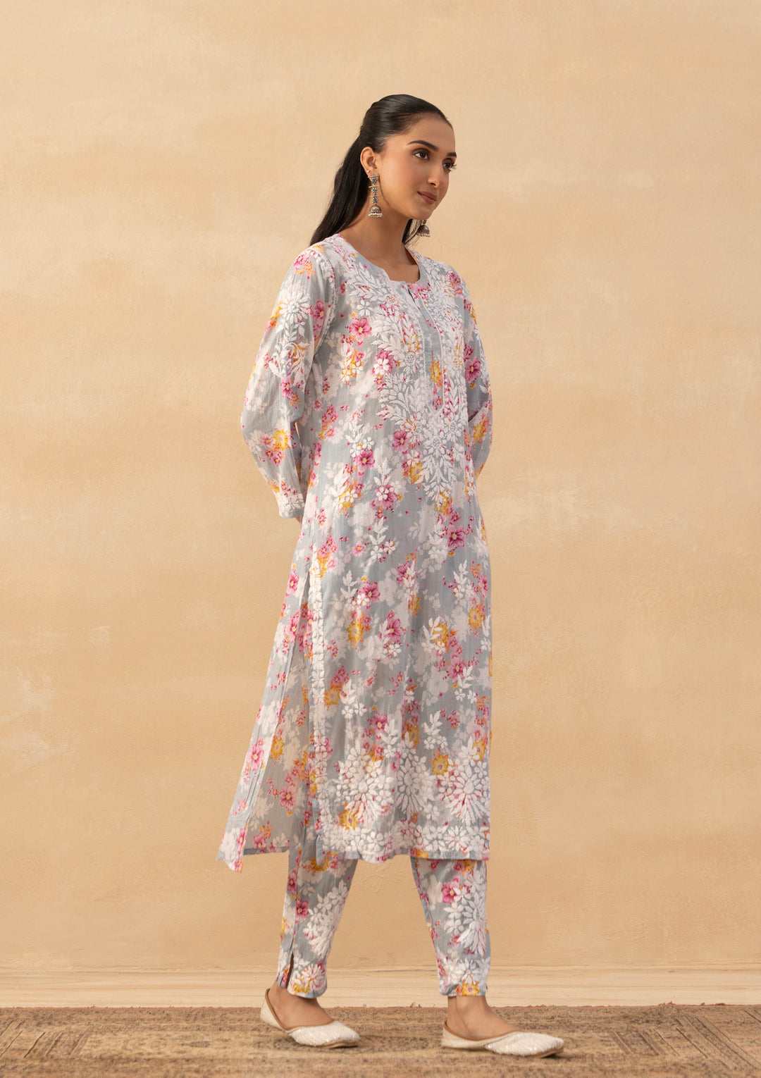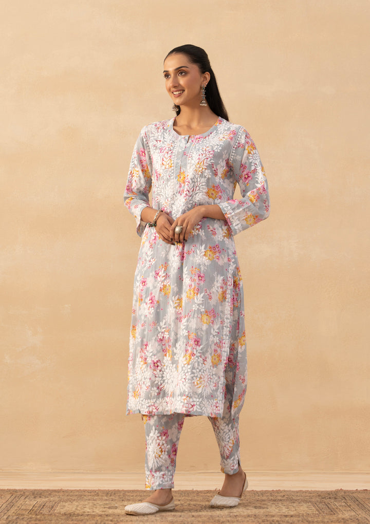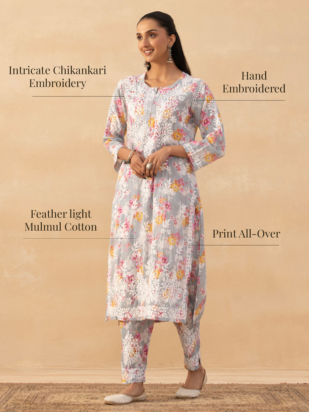 HOC Mulmul Chikankari Printed Women's 2 PC Long Kurta Set - Grey