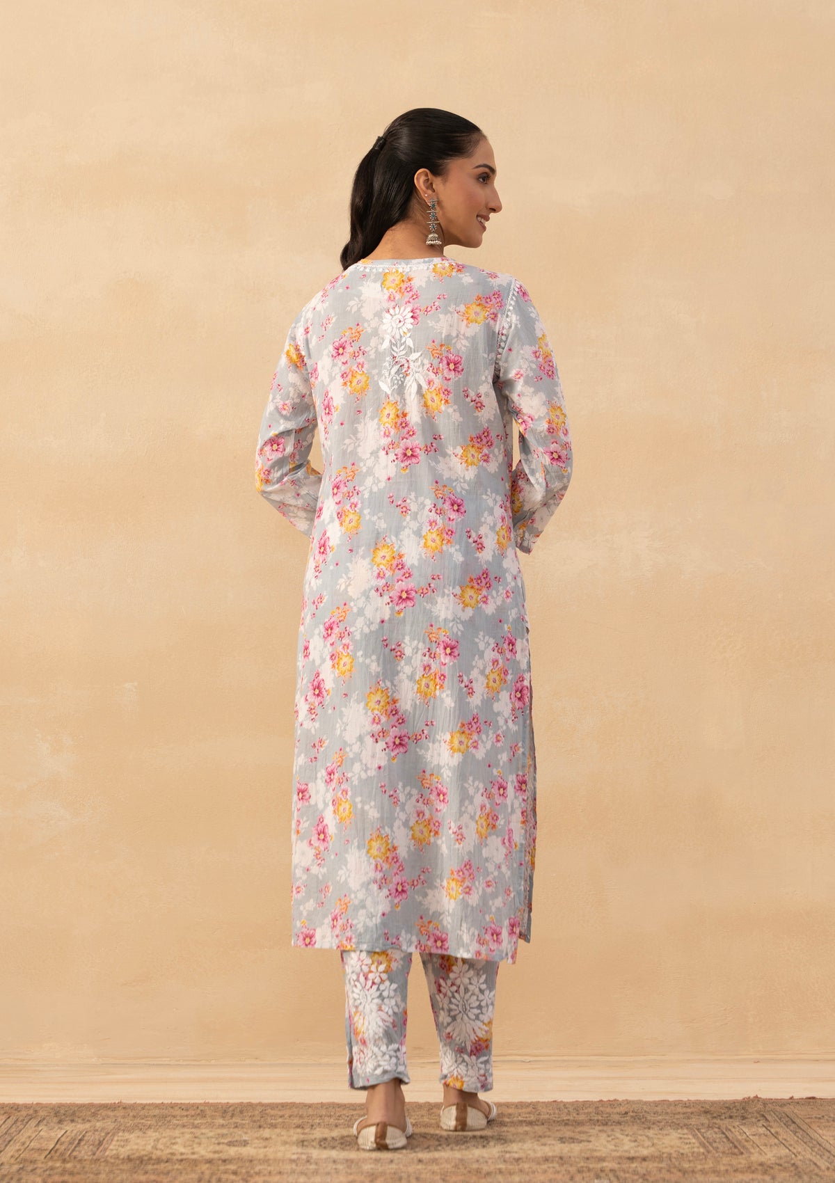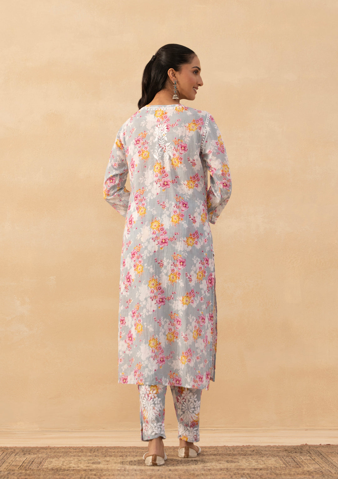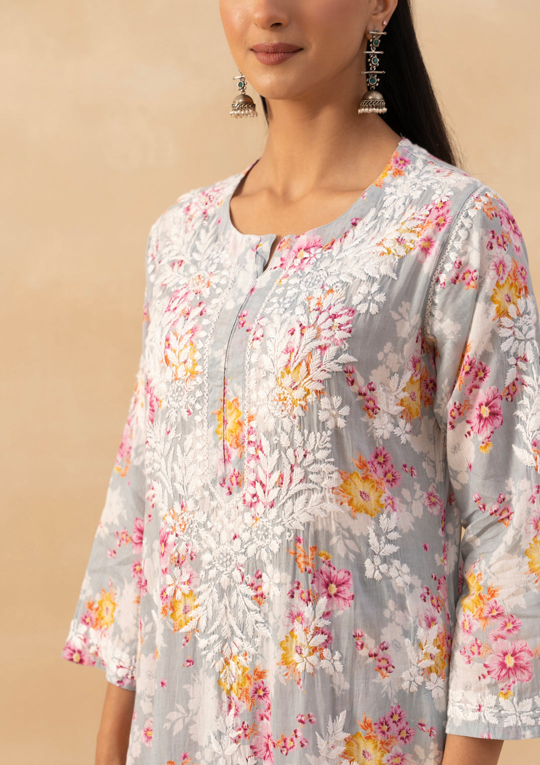 HOC Mulmul Chikankari Printed Women's 2 PC Long Kurta Set - Grey