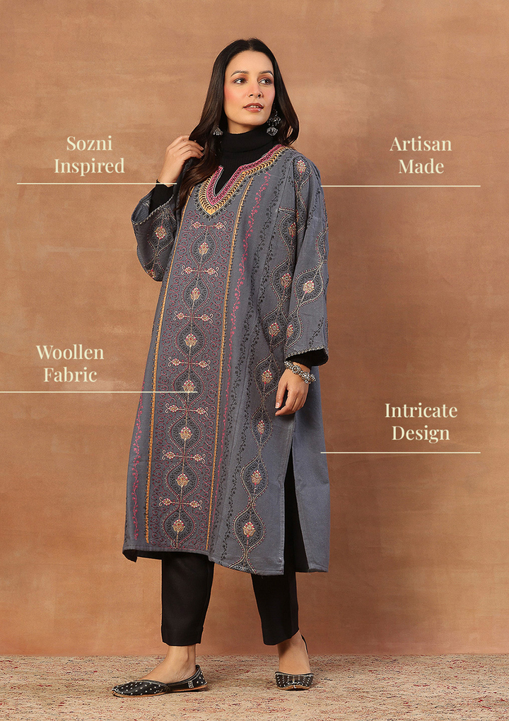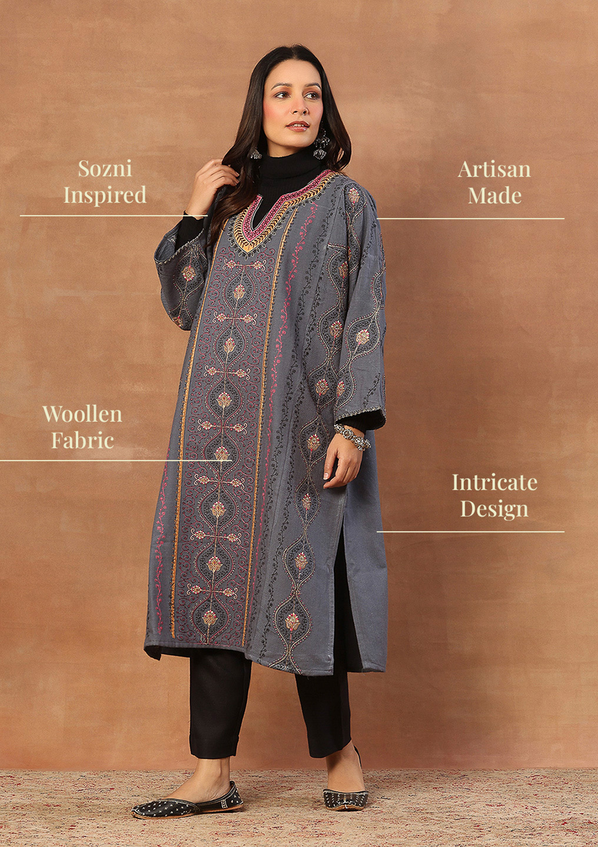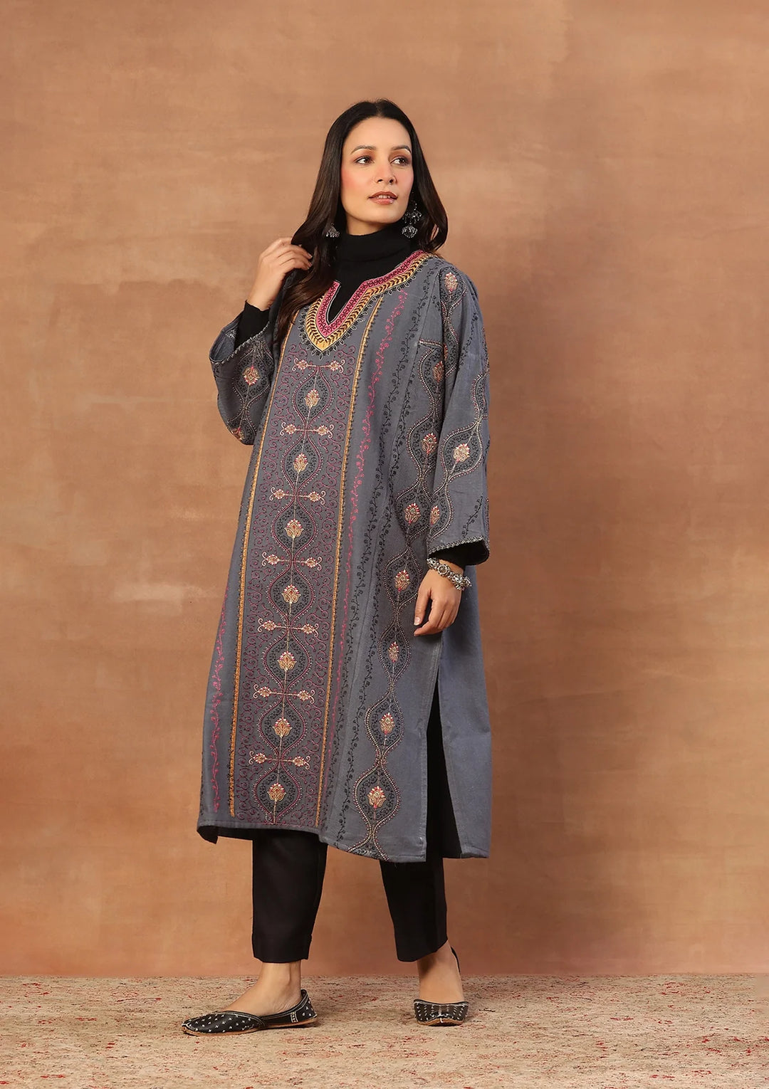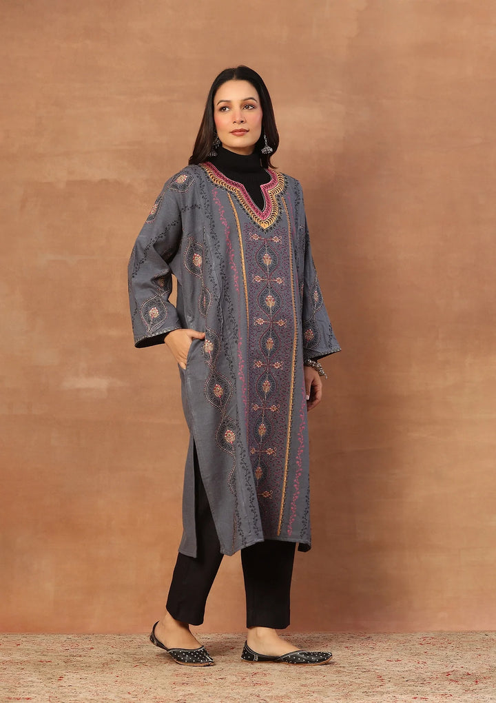 HOC Wool Sozni Inspired Solid Women's Long Phiran-Grey