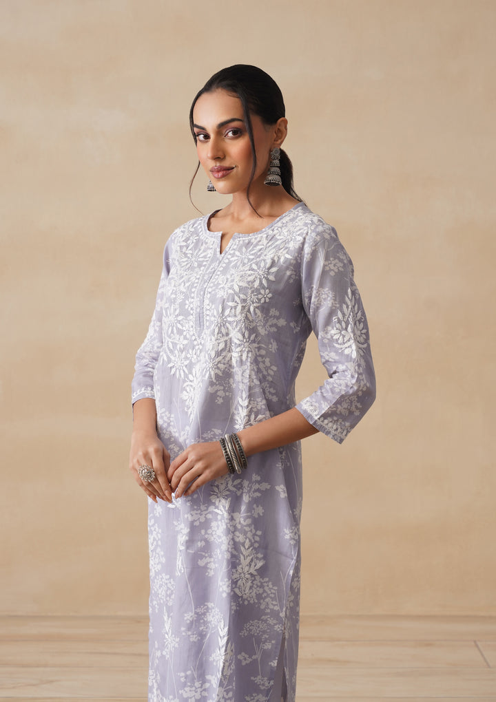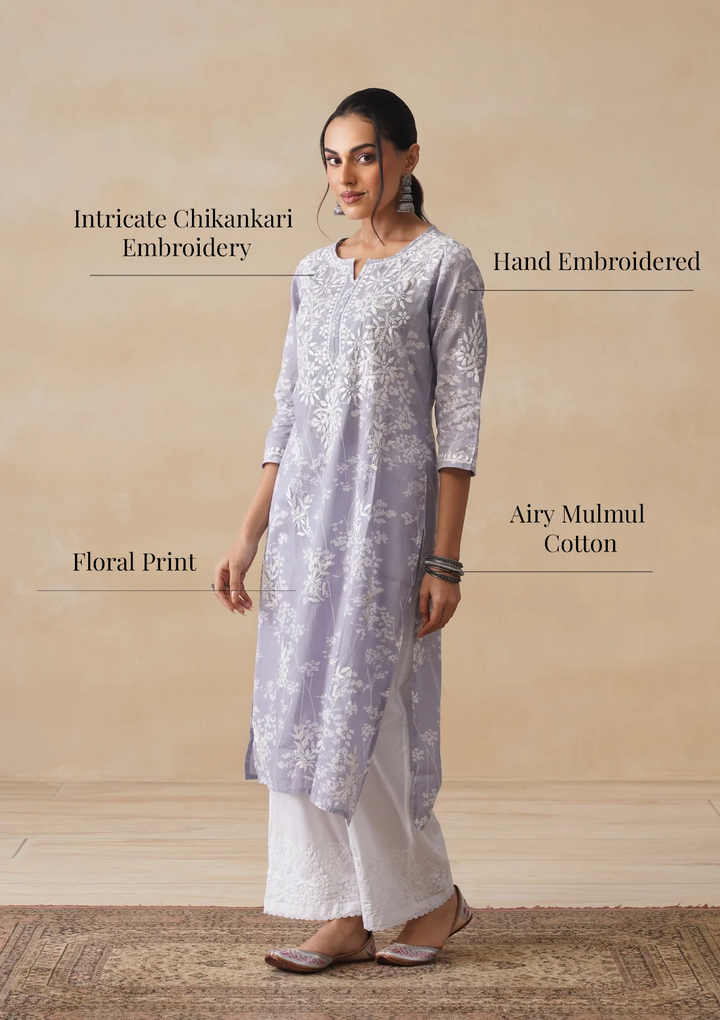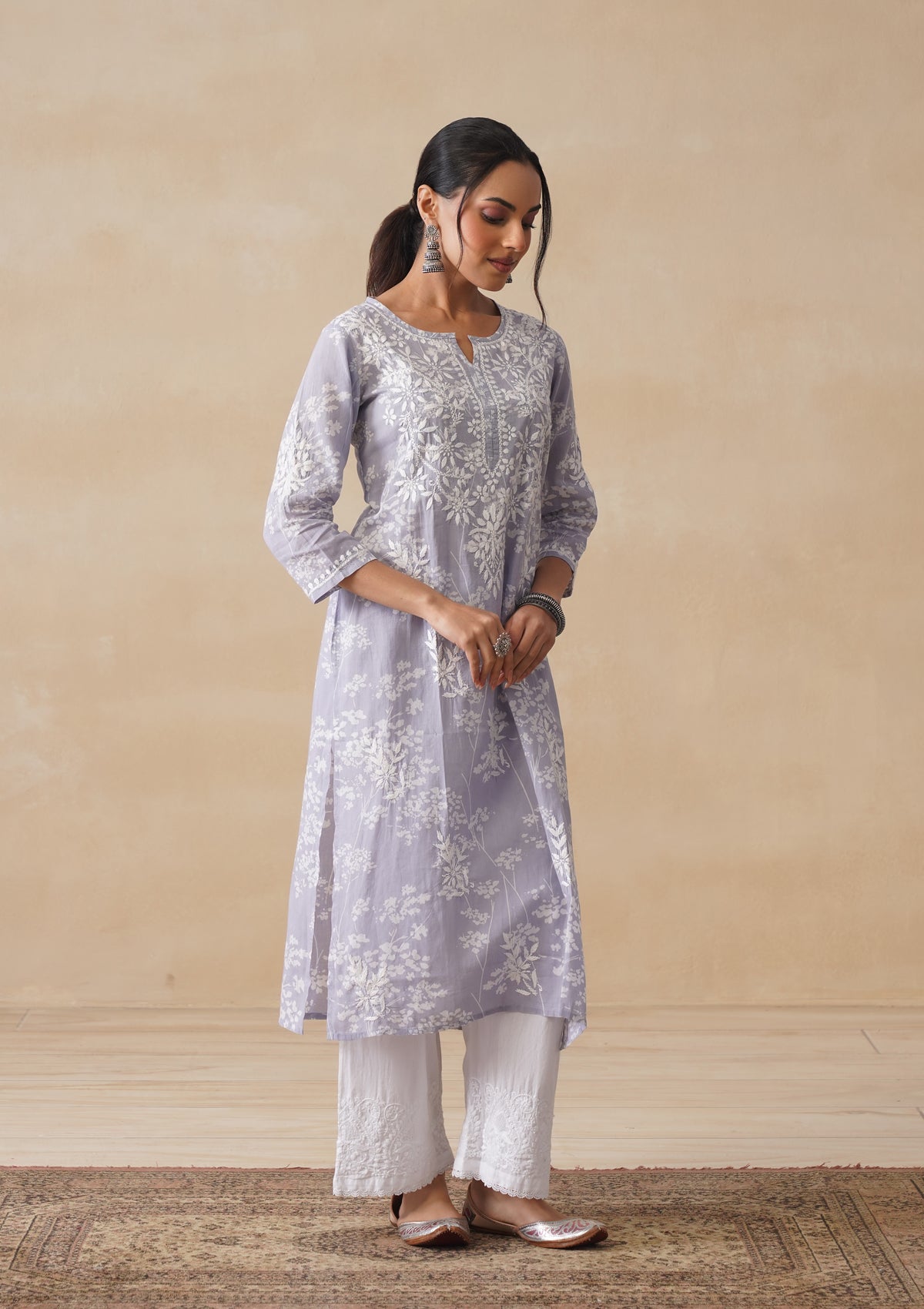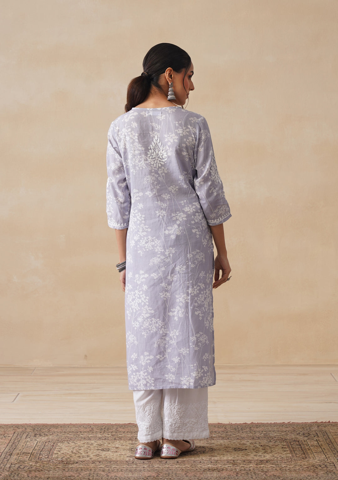 HOC Zainab Chikankari Mulmul Printed Straight Kurta -Grey