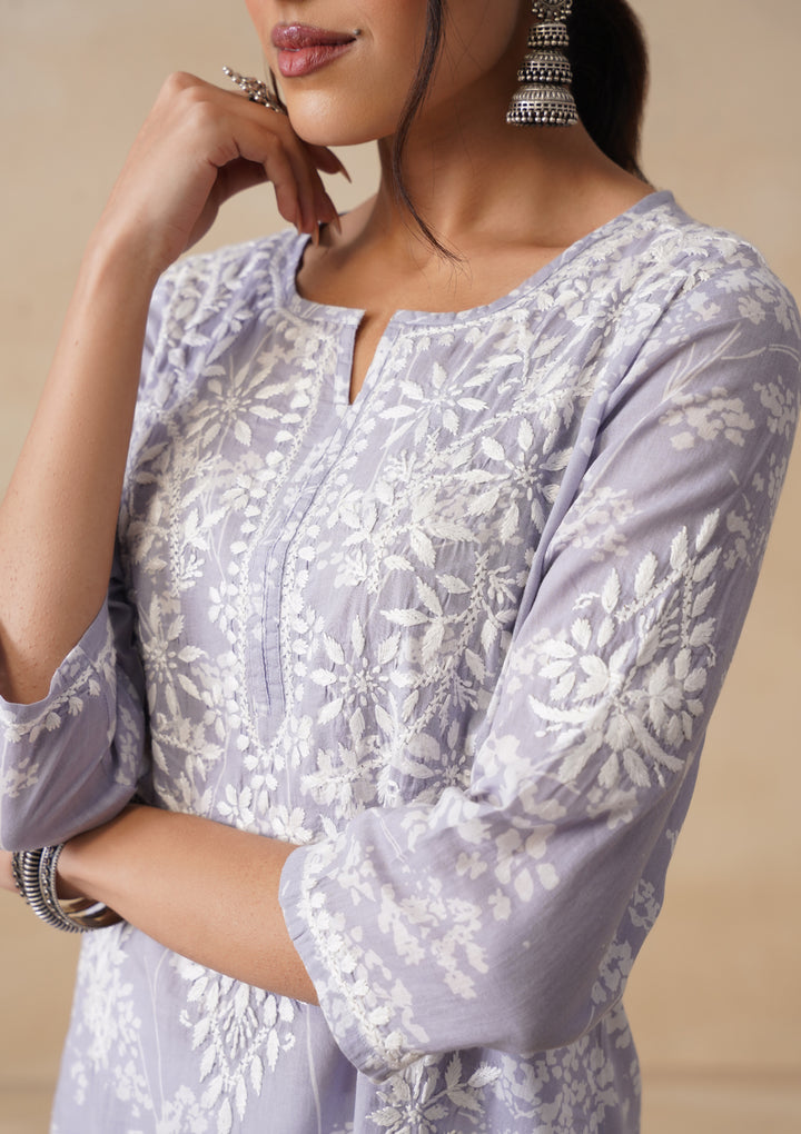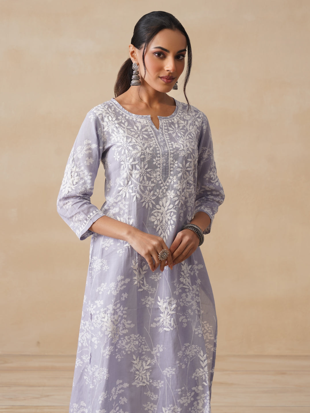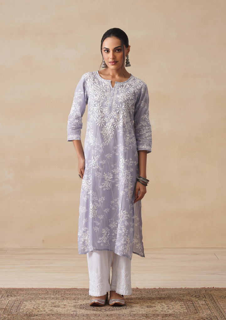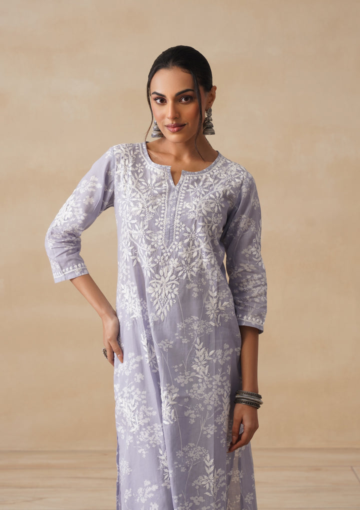 HOC Zainab Chikankari Mulmul Printed Straight Kurta -Grey