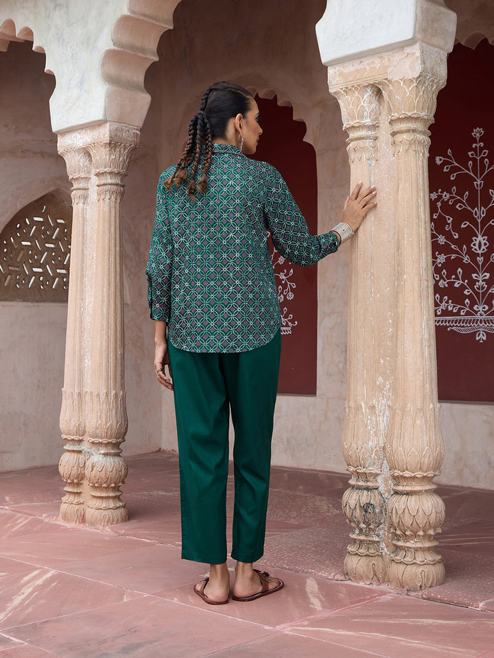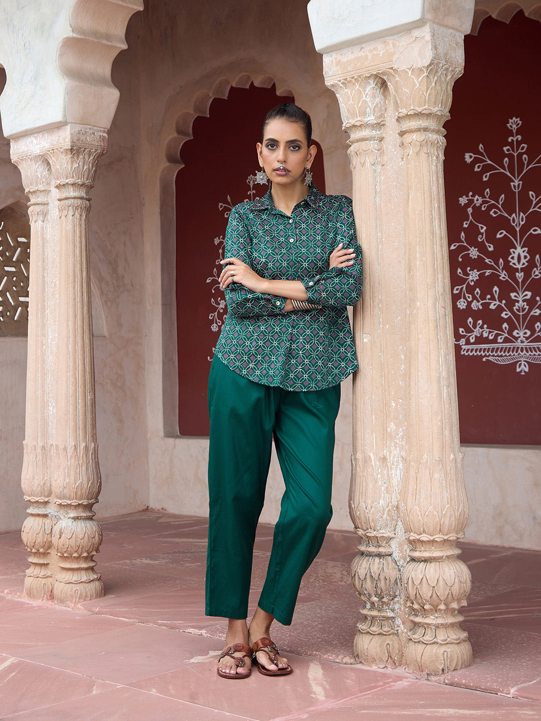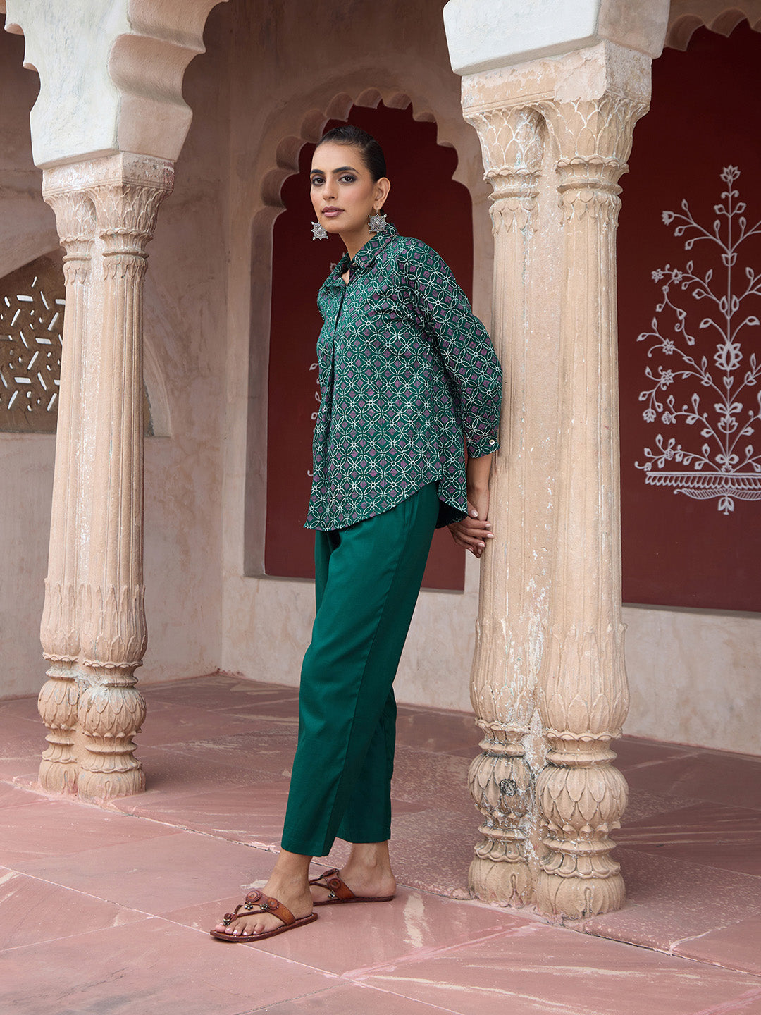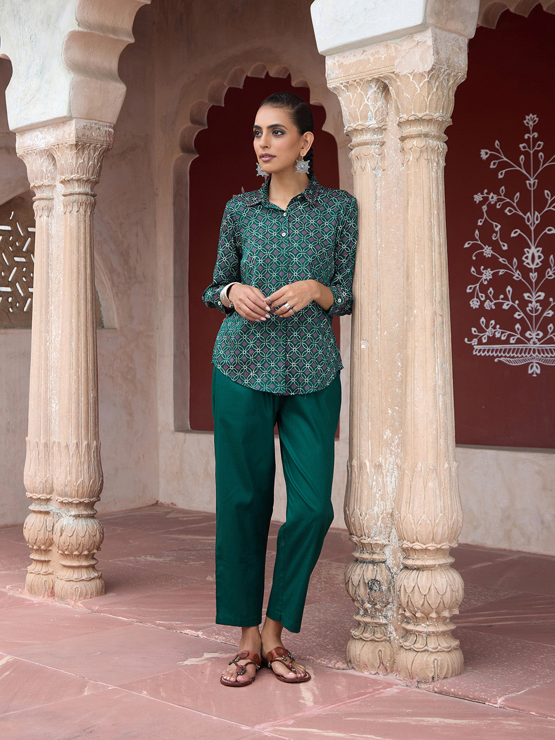 HOC Glazed Cotton Hand Block Printed with Hand Embroidery Women's 2 PC Co-ord Set - Dark Green