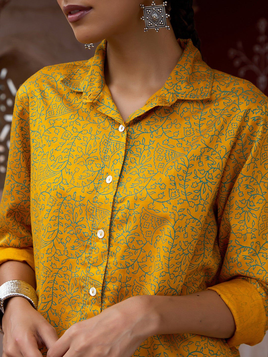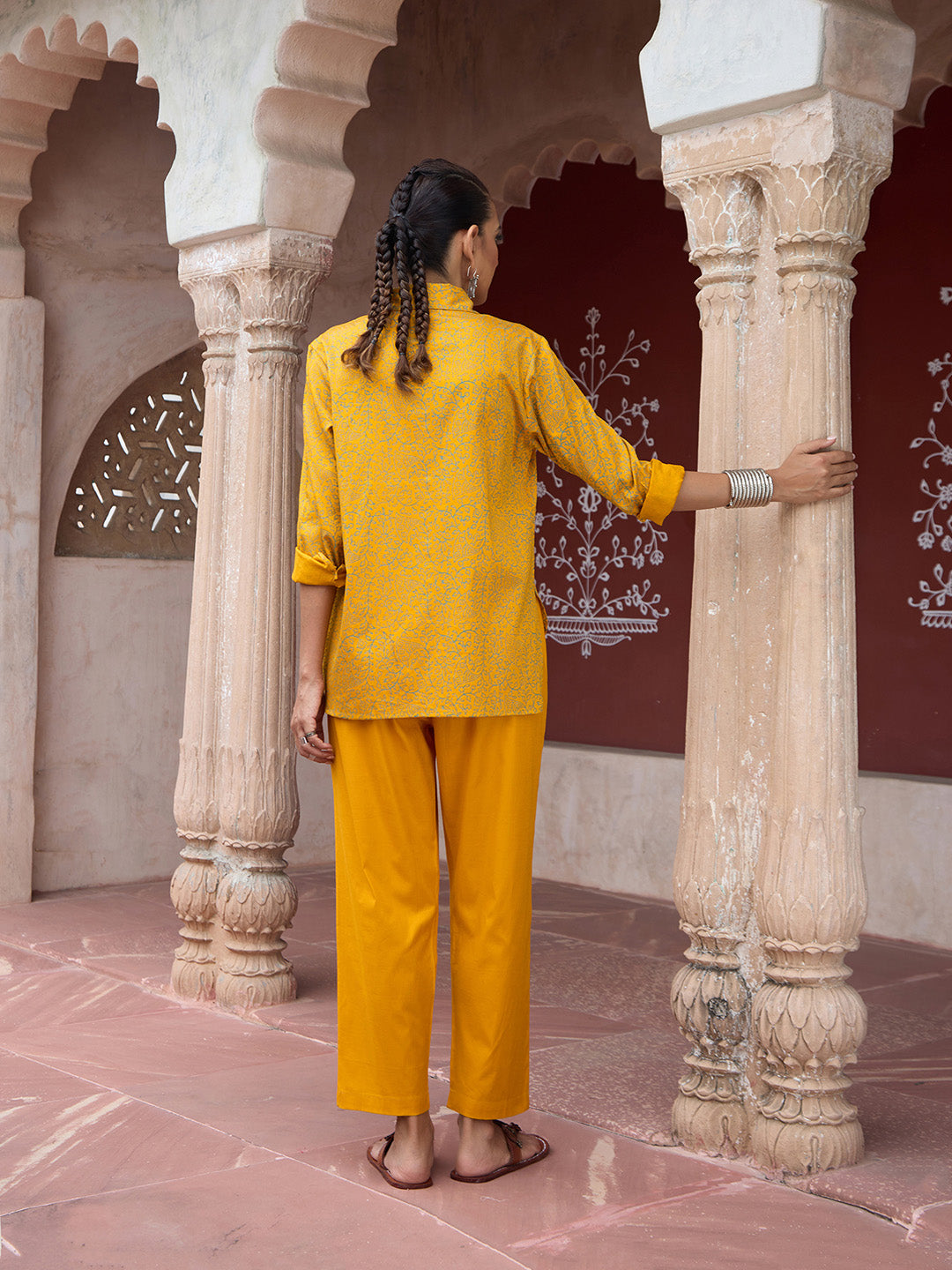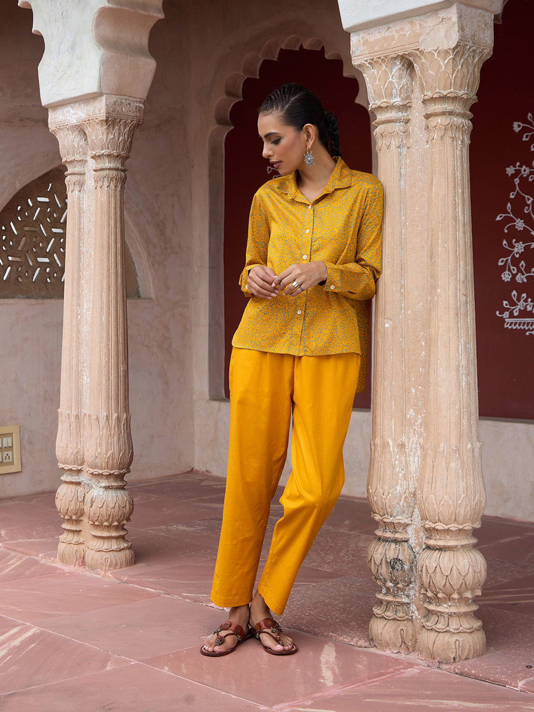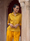 HOC Glazed Cotton Hand Block Printed with Hand Embroidery Women's 2 PC Co-ord Set - Mustard