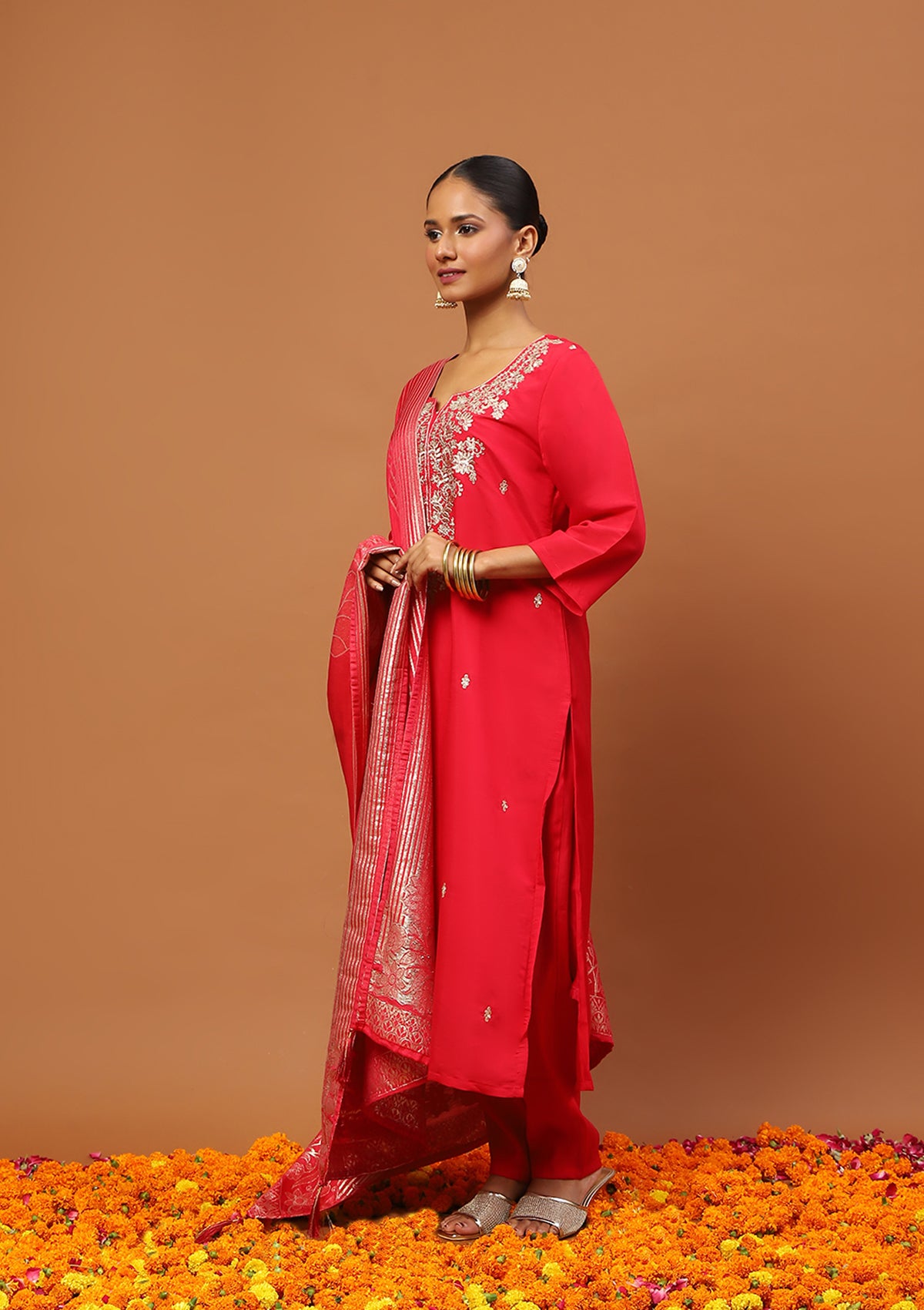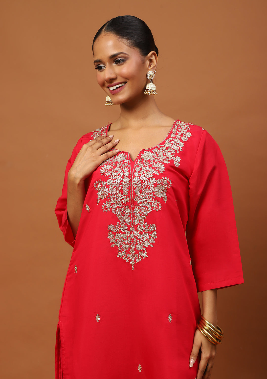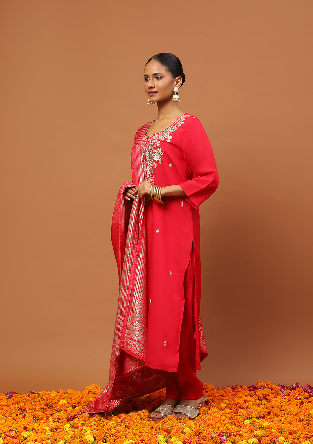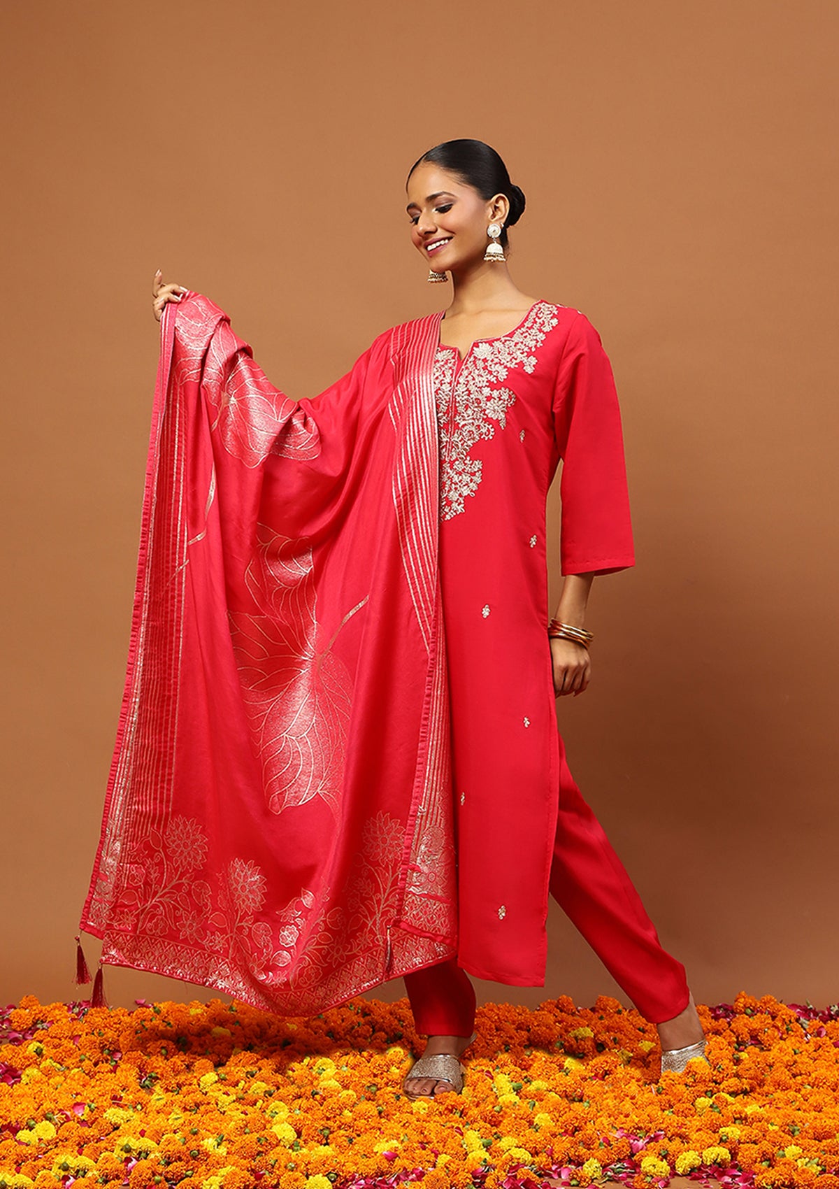 HOC Silk Blend Zari Embroidered With Sequins Solid Women's 3 PC Straight Kurta Set-Rose Pink