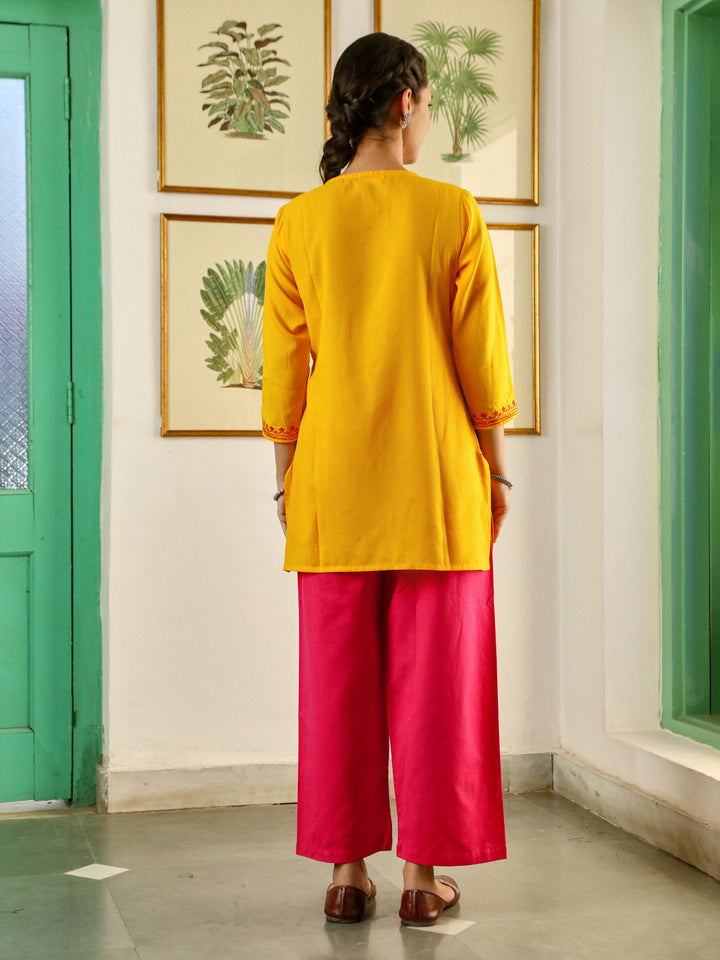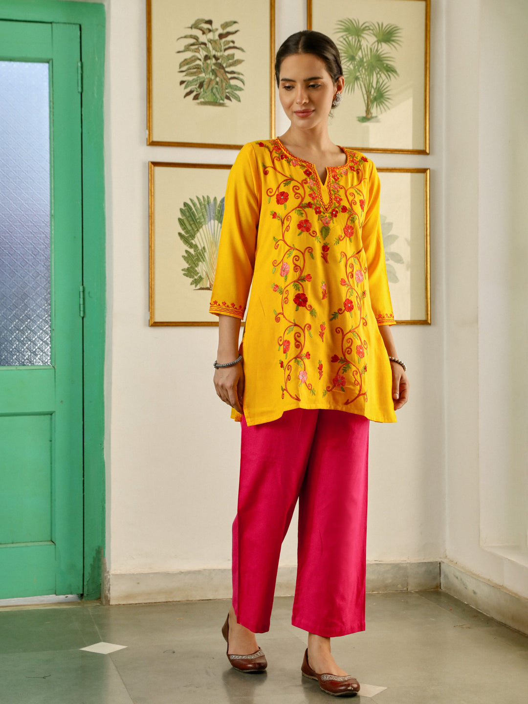 HOC Aari Embroidered Cotton Solid Women's Short Kurta - Yellow