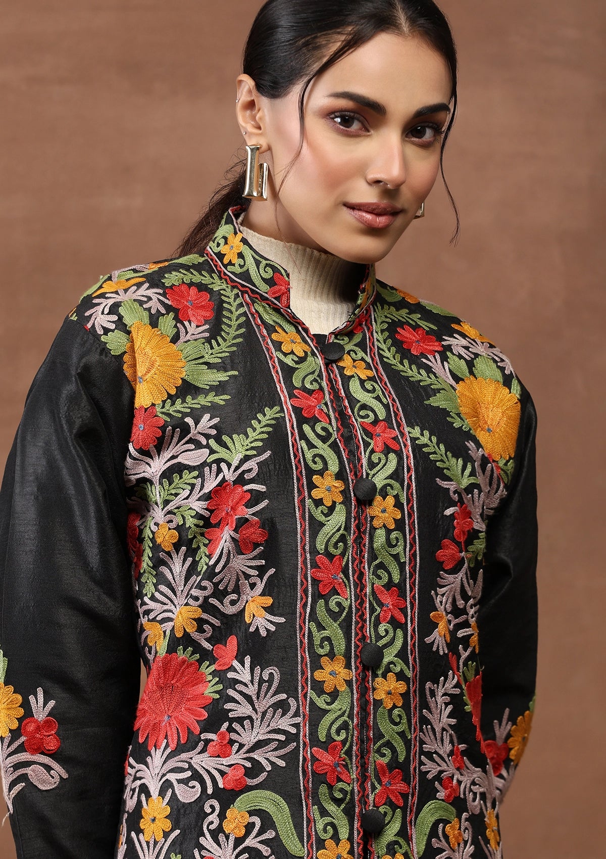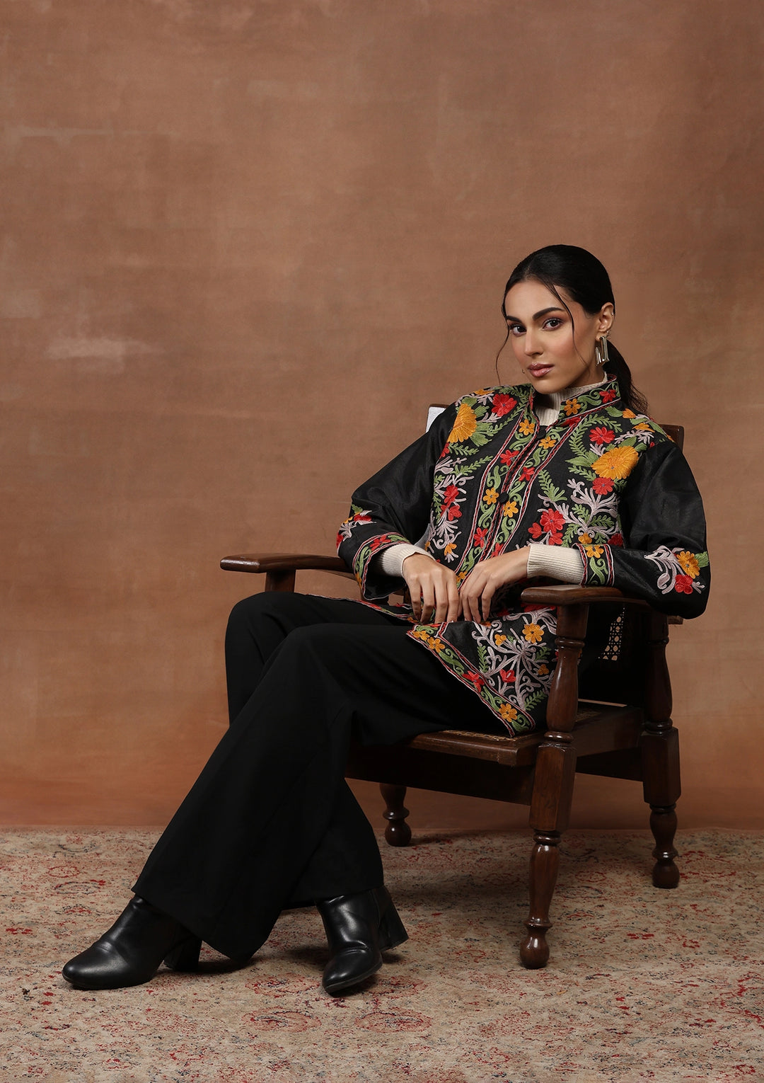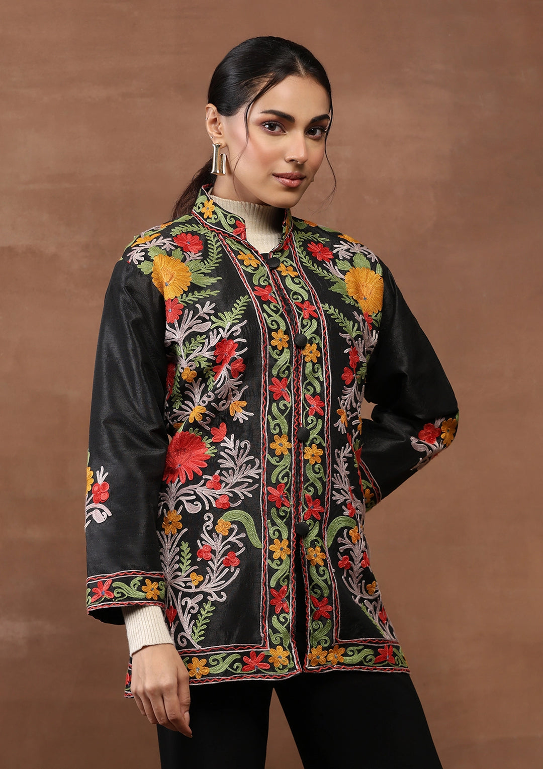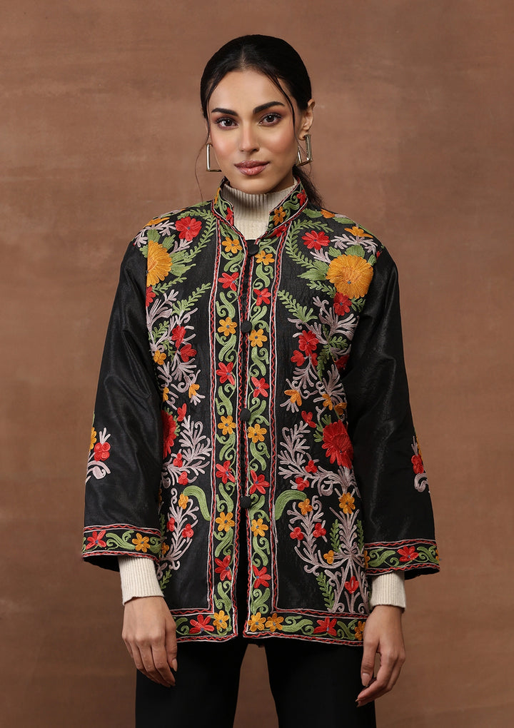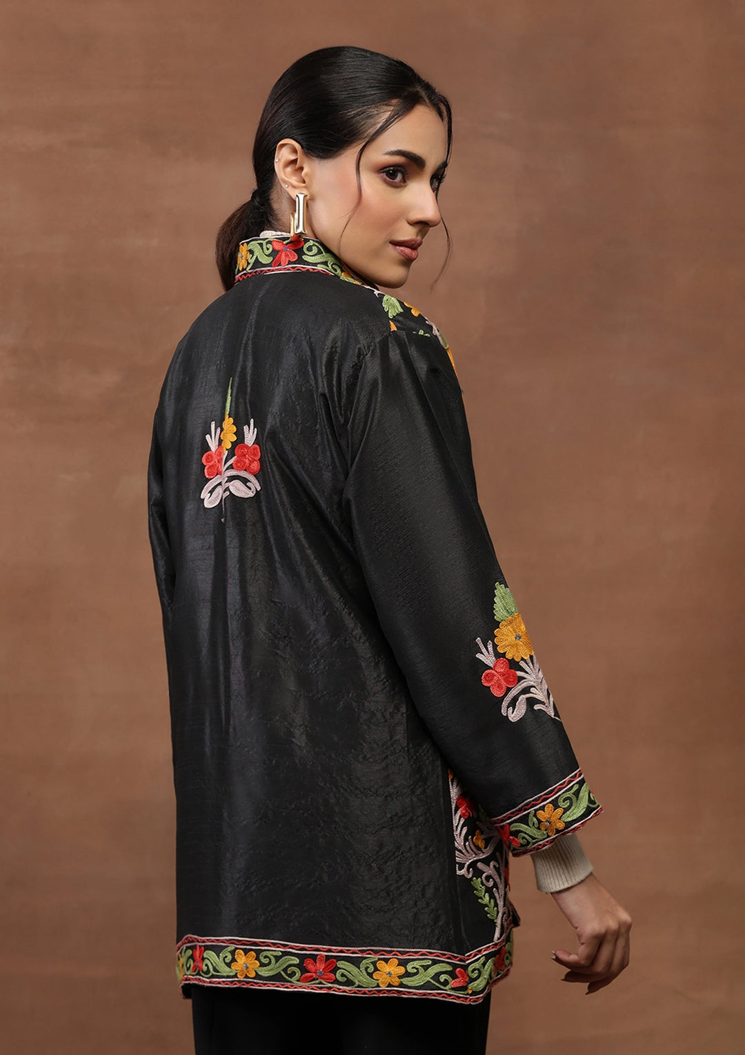 HOC Kashmiri Art Silk Aari Embroidered Solid Women's Jacket-Black