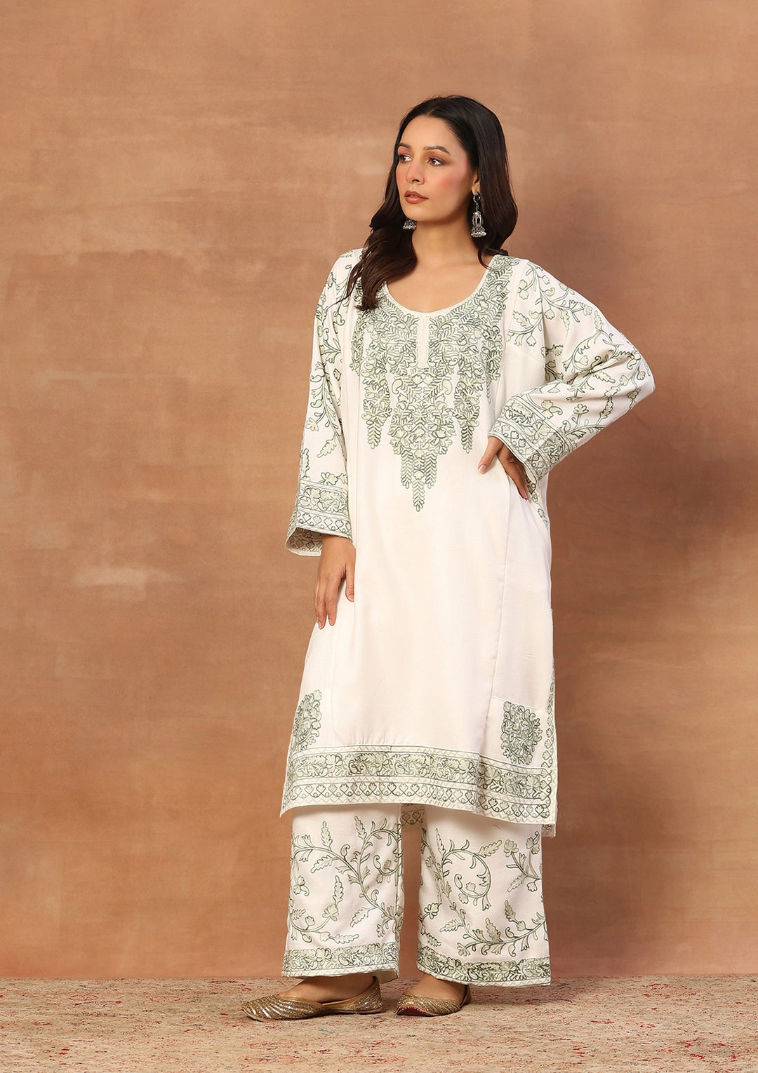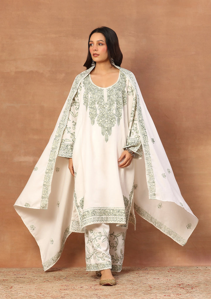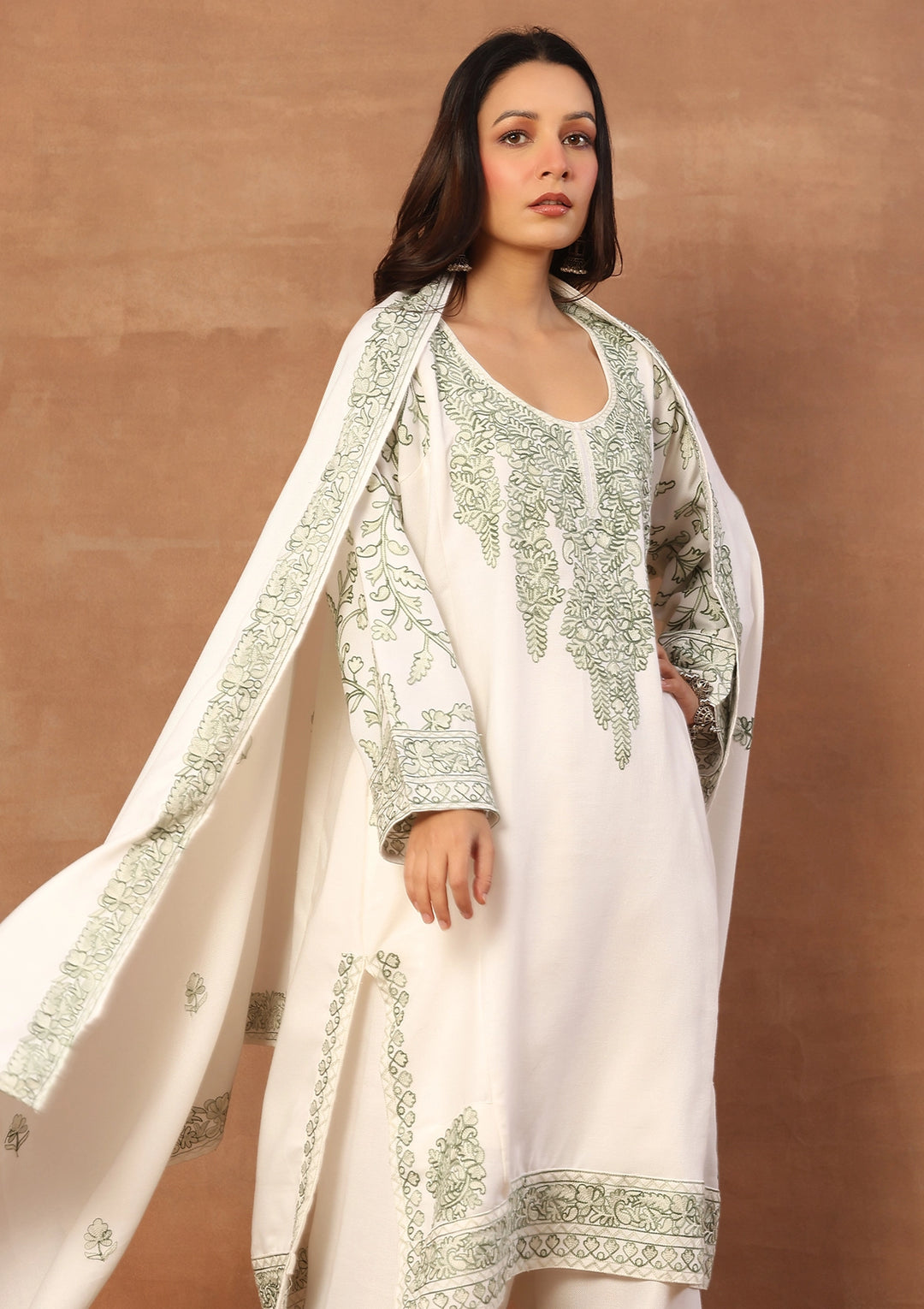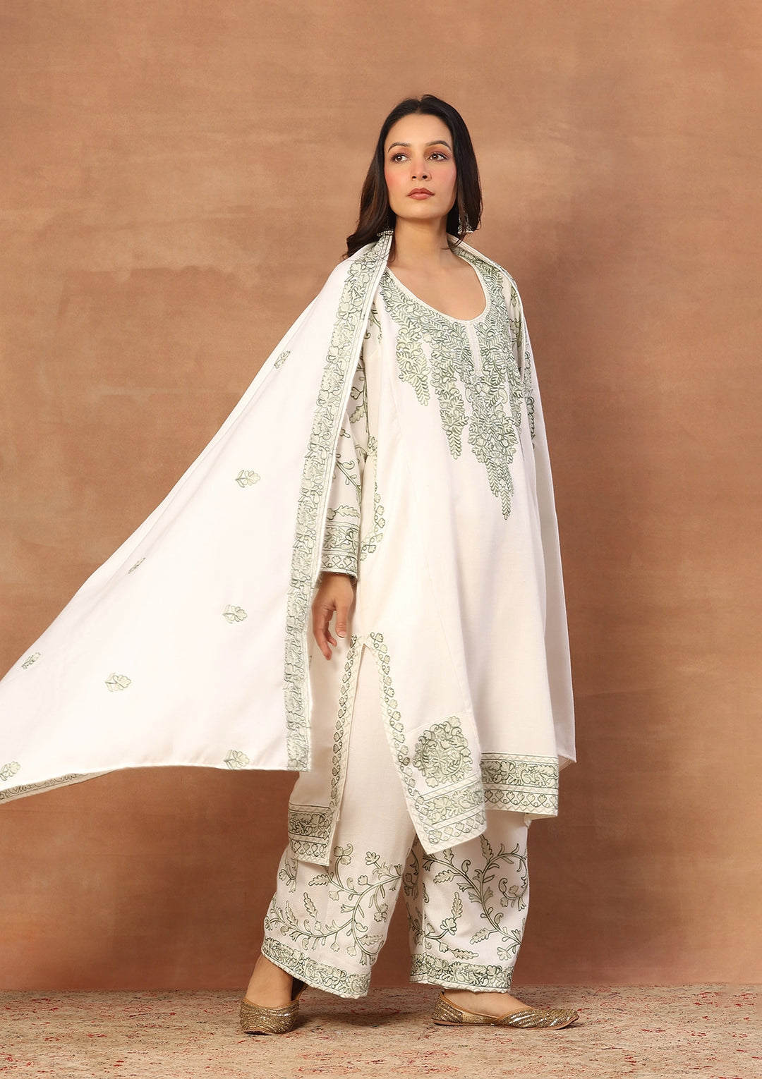 HOC Kashmiri Wool Aari Embroidered Solid Women's 3 PC Long Phiran Set - White