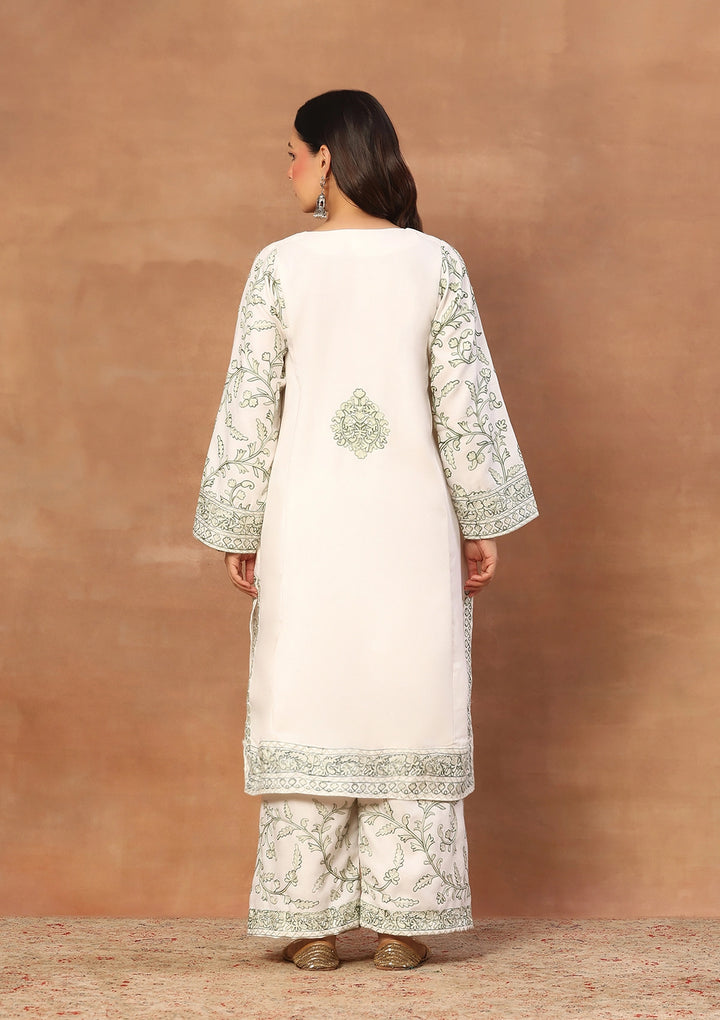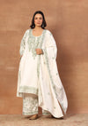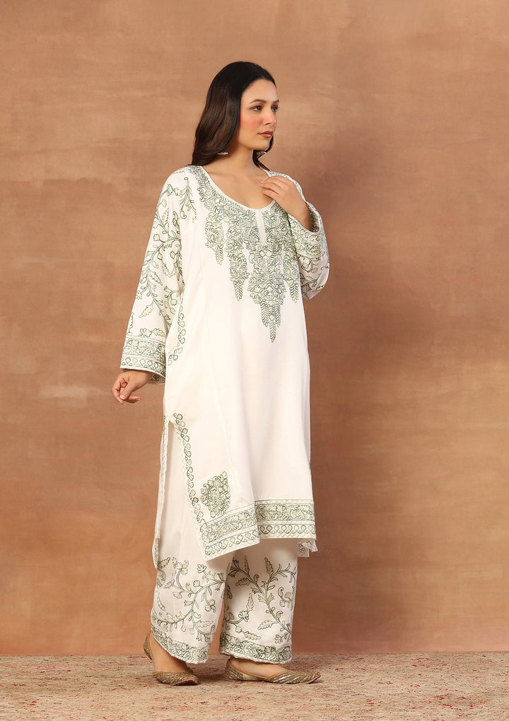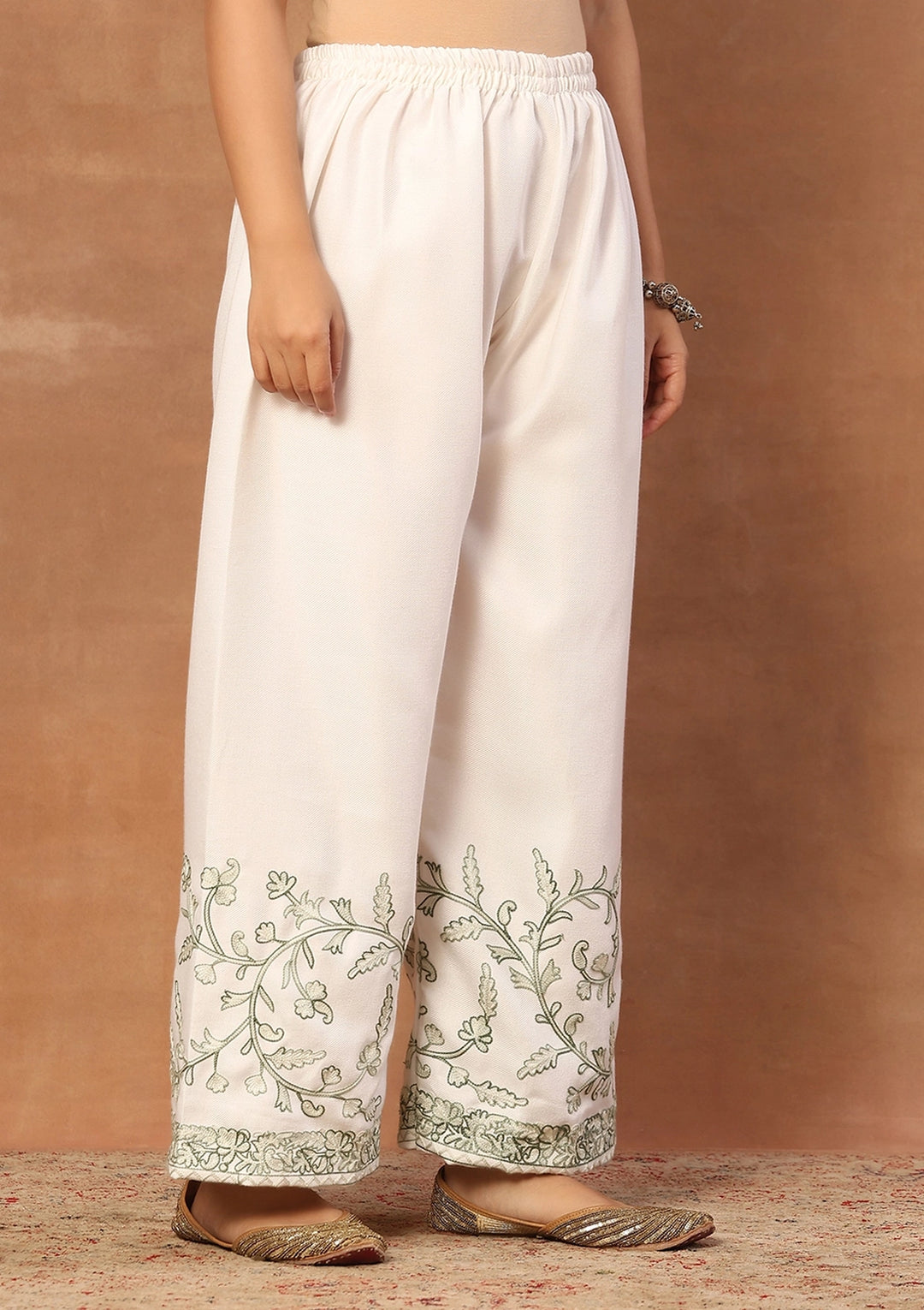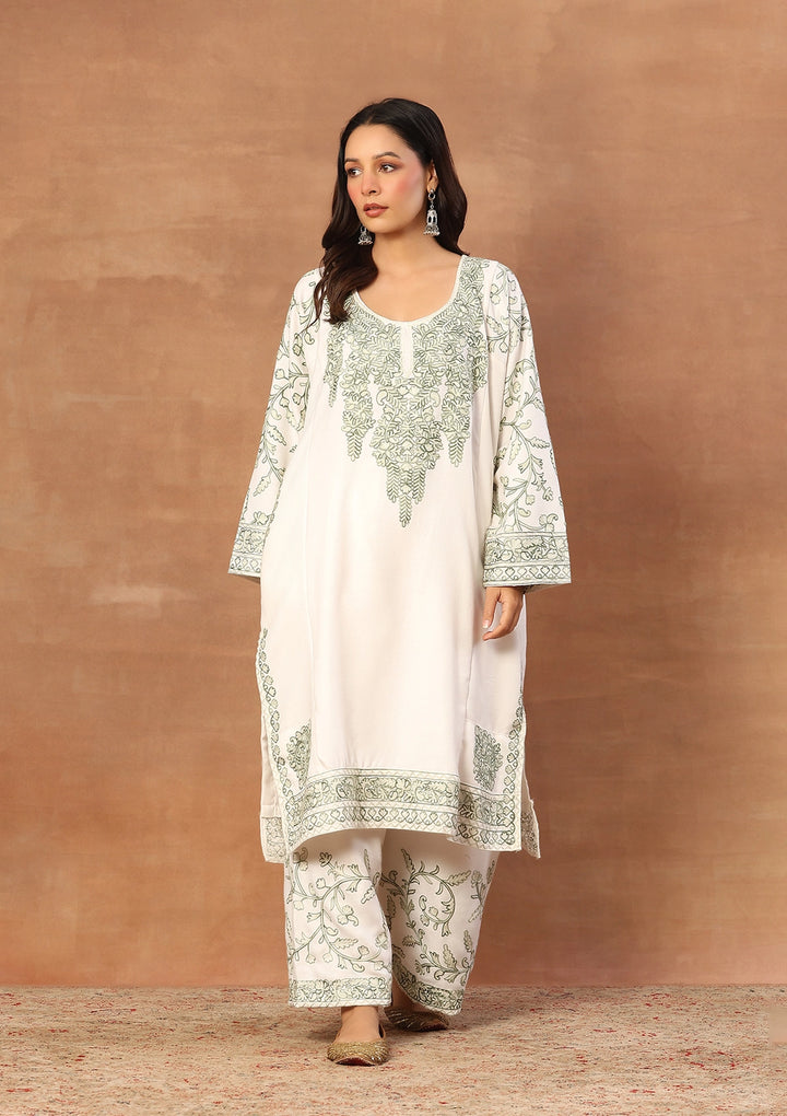 HOC Kashmiri Wool Aari Embroidered Solid Women's 3 PC Long Phiran Set - White