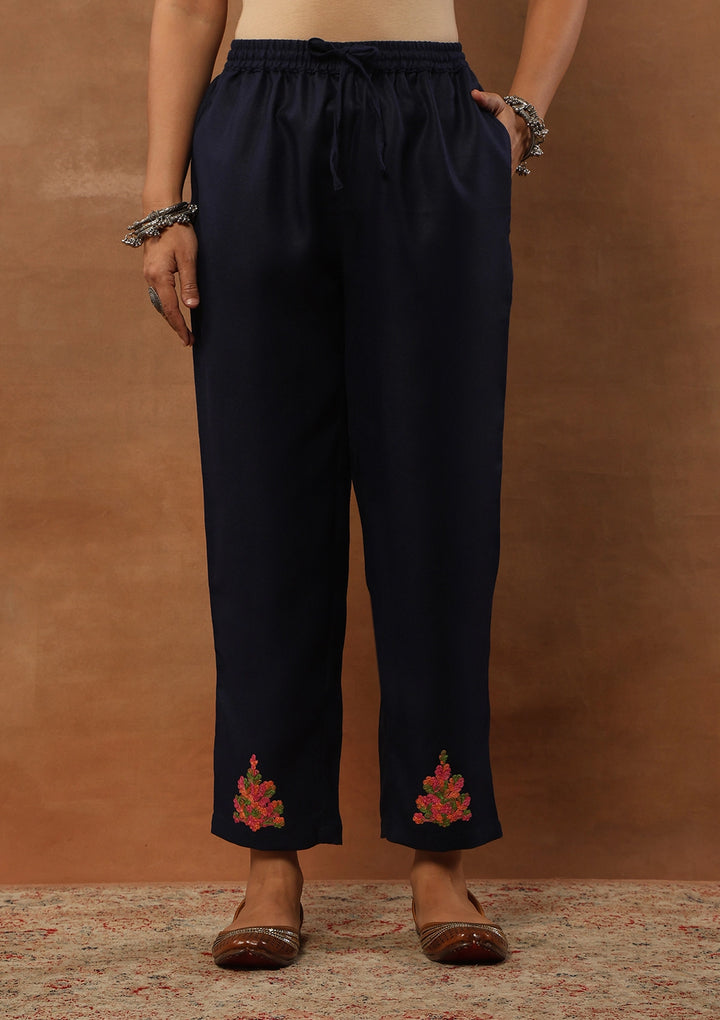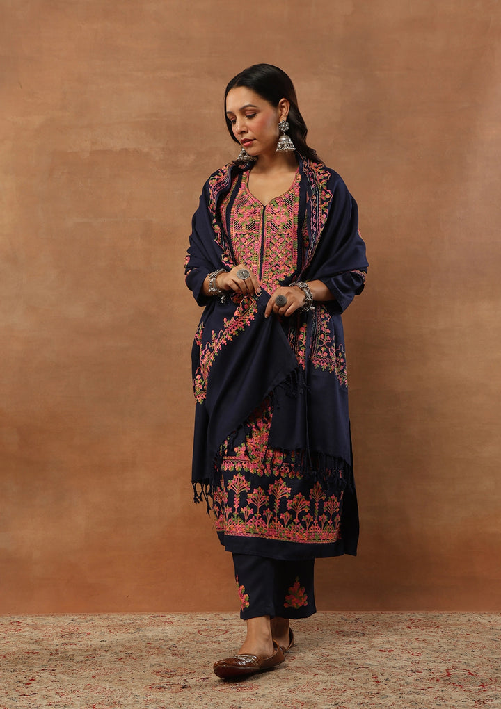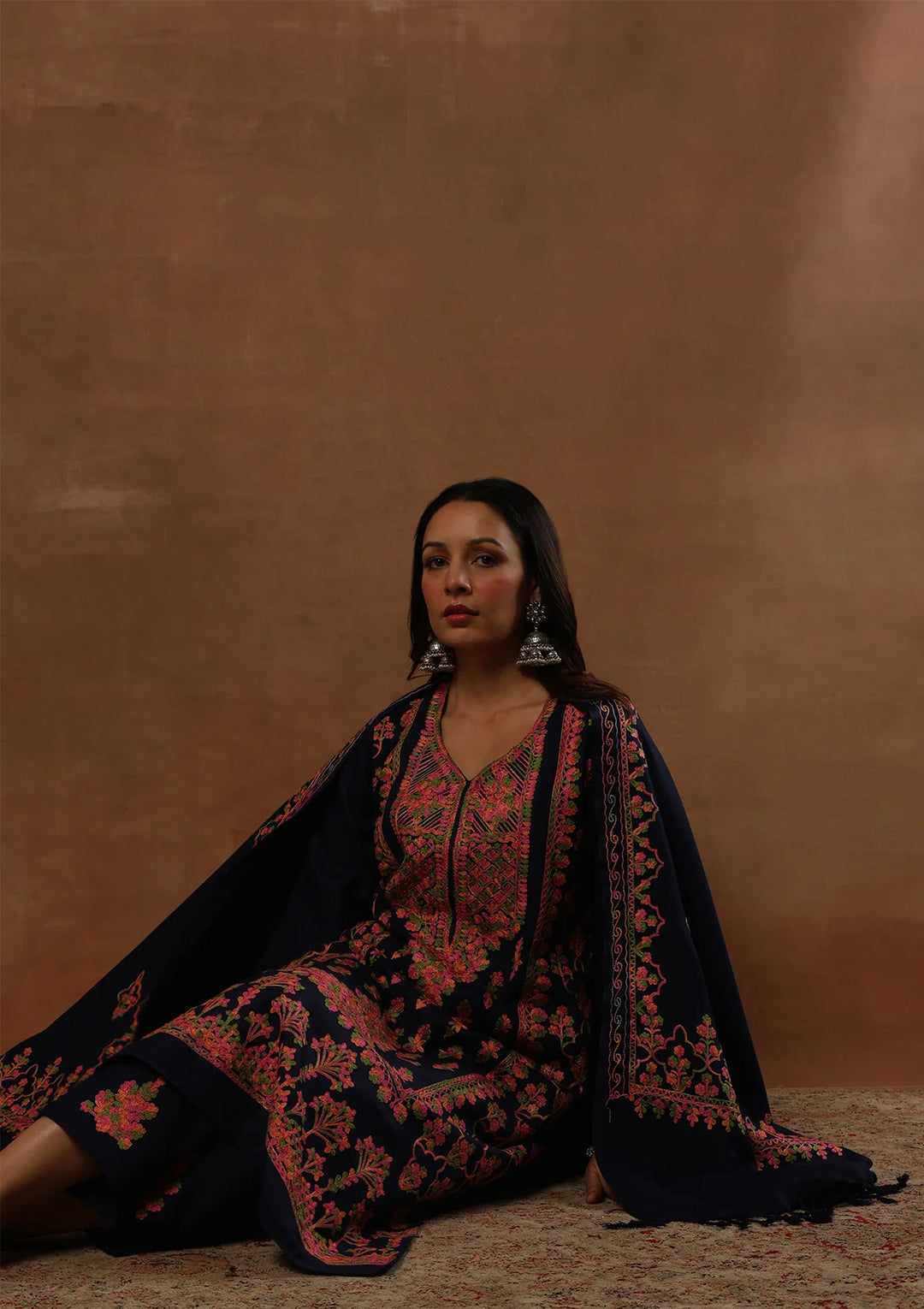 HOC Kashmiri Wool Aari Embroidered Straight Kurta Set with Dupatta-Blue