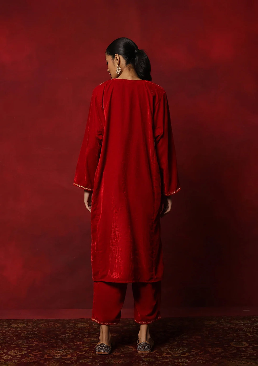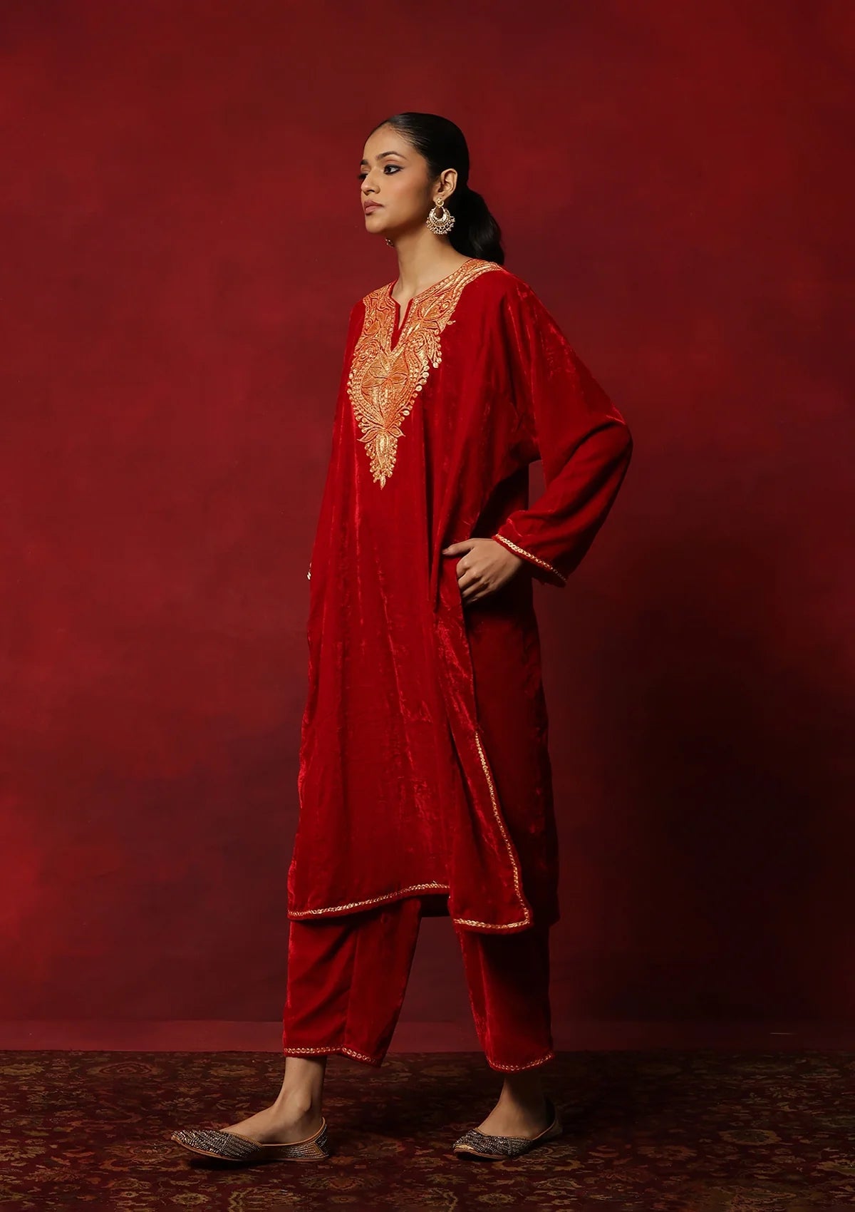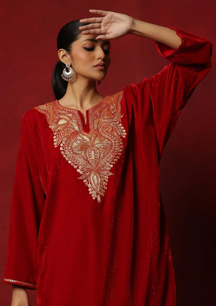 HOC Velvet Tilla Embroidered Solid Women's 2 Pc Phiran Set -Red