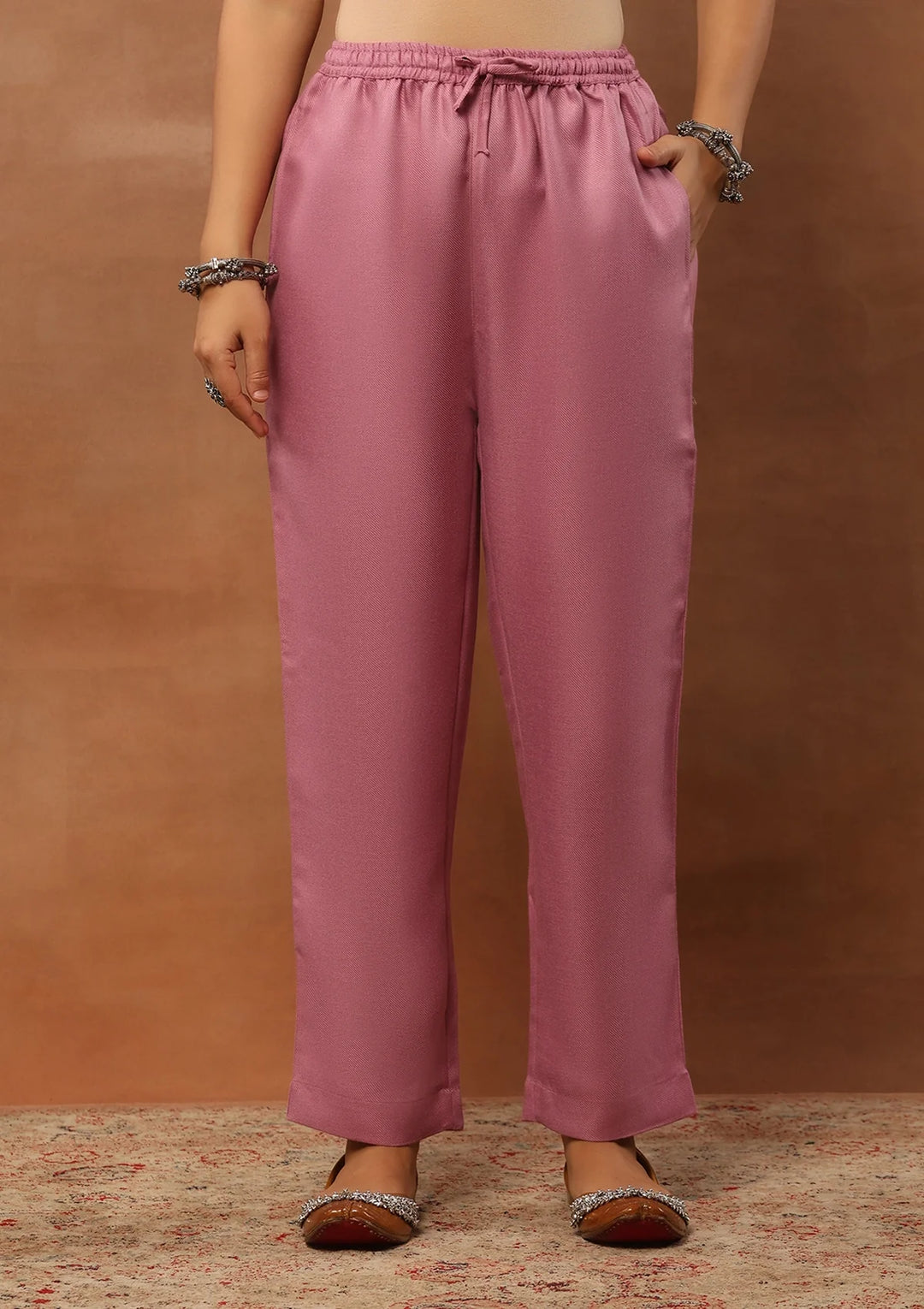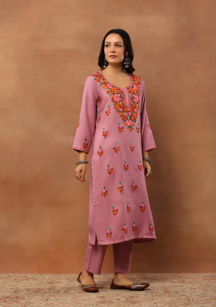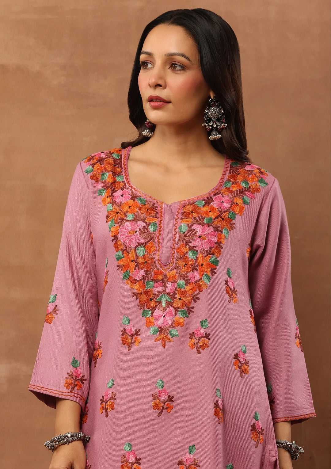 HOC Wool Aari Embroidered Solid Women's 2 Pc Long Kurta Set - Lavender