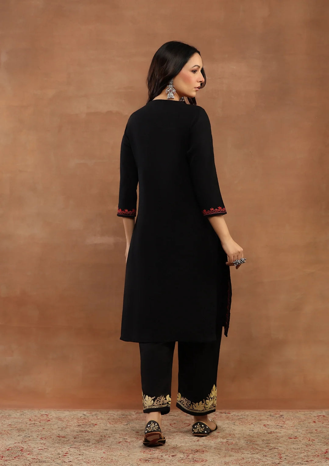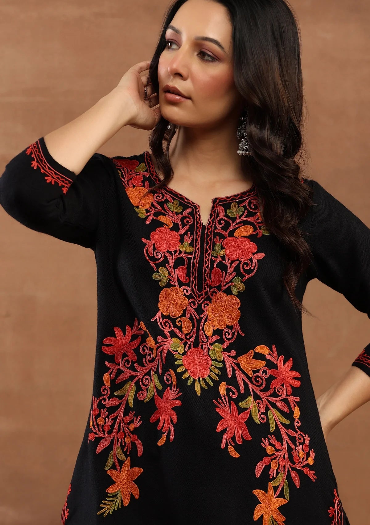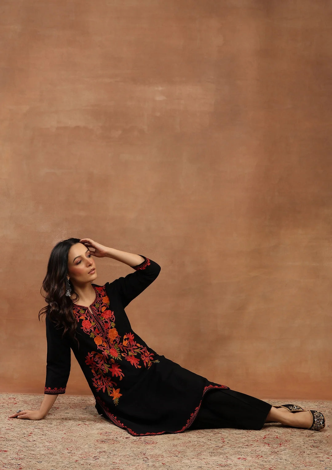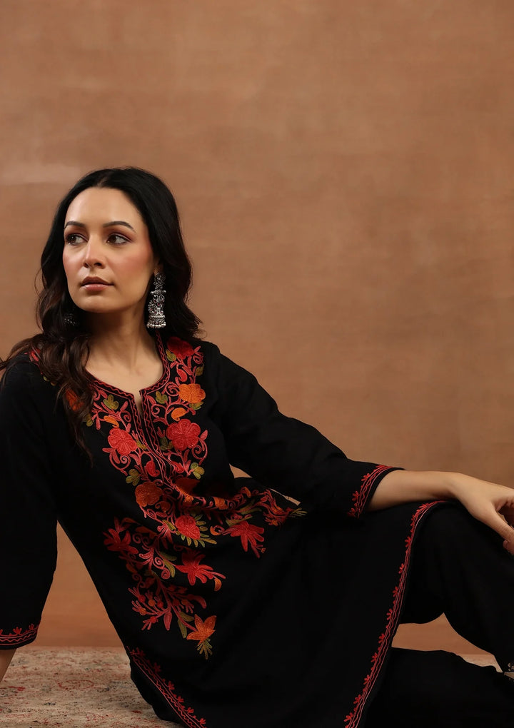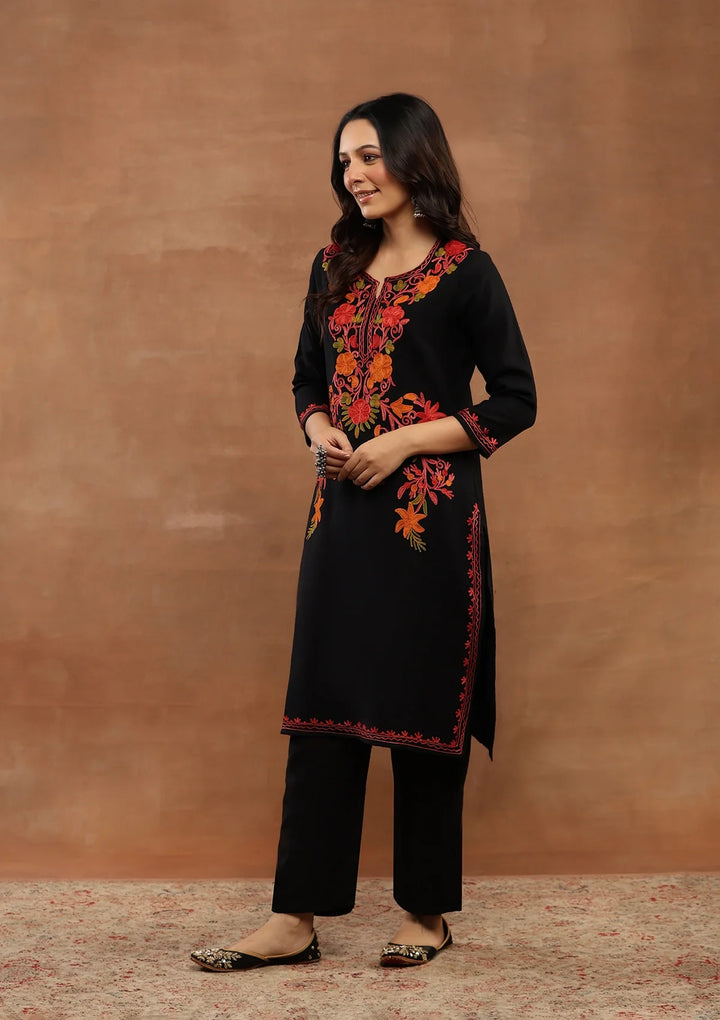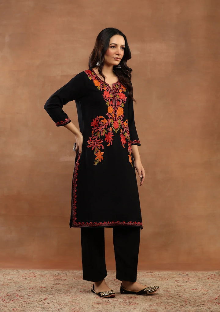 HOC Wool Aari Embroidered Solid Women's Long Kurta -Black