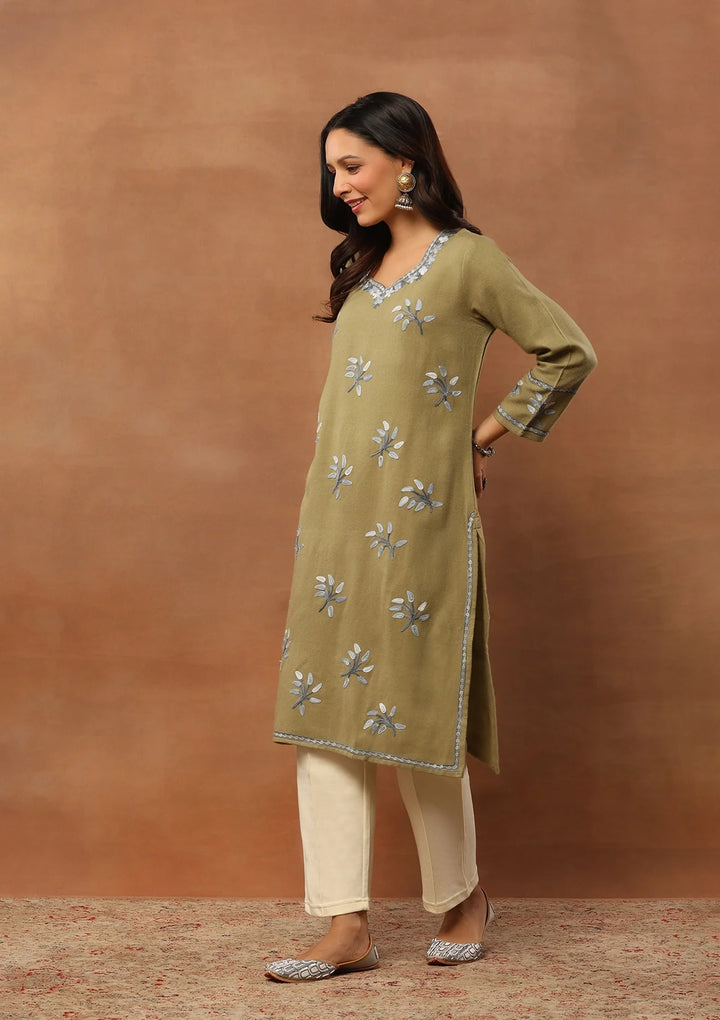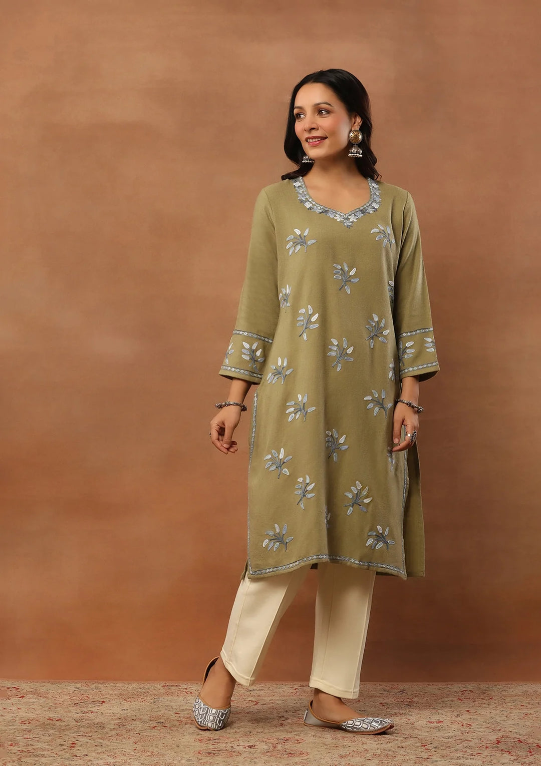 HOC Wool Aari Embroidered Solid Women's Long Kurta - Olive