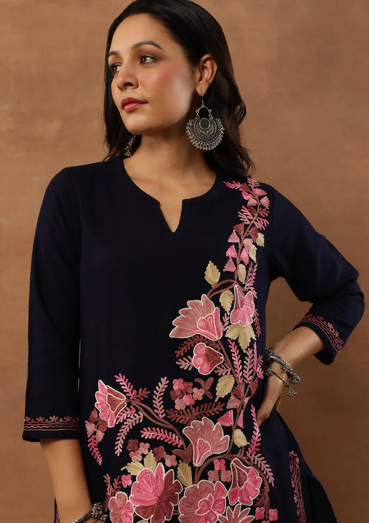 HOC Wool Aari Embroidered Solid Women's Short Kurta - Navy Blue