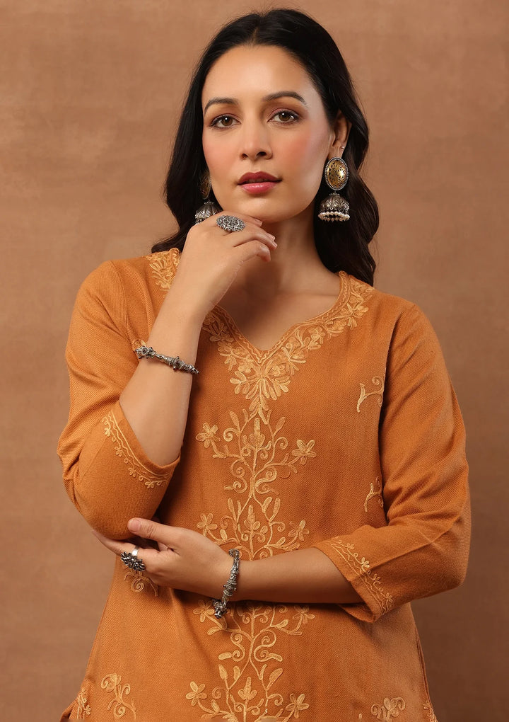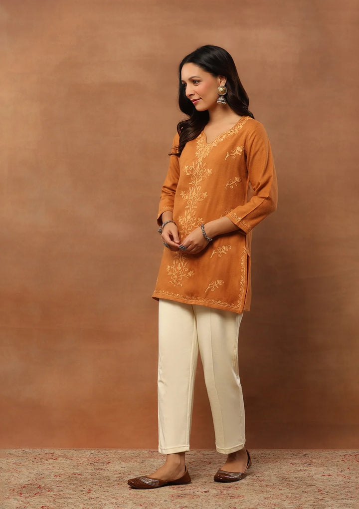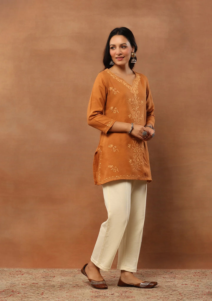 HOC Wool Aari Embroidered Solid Women's Short Kurta - Rust