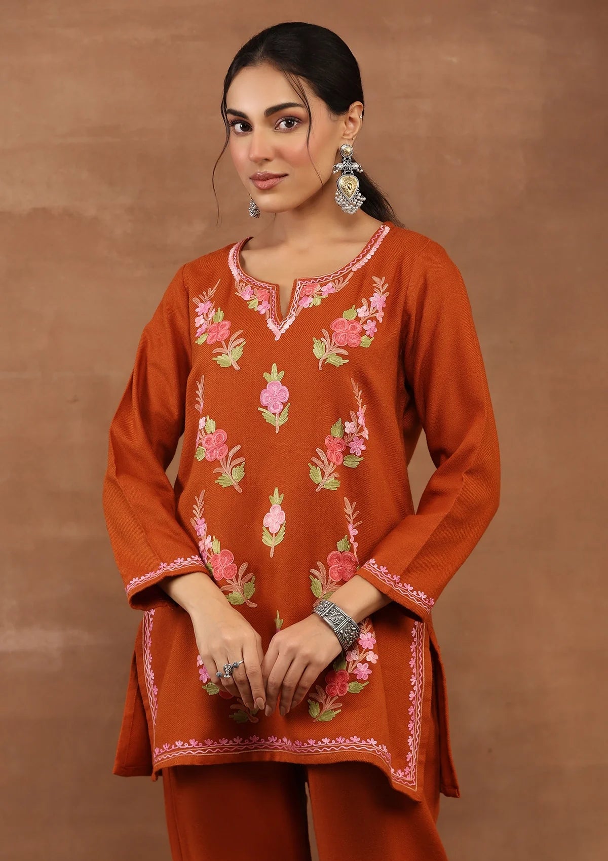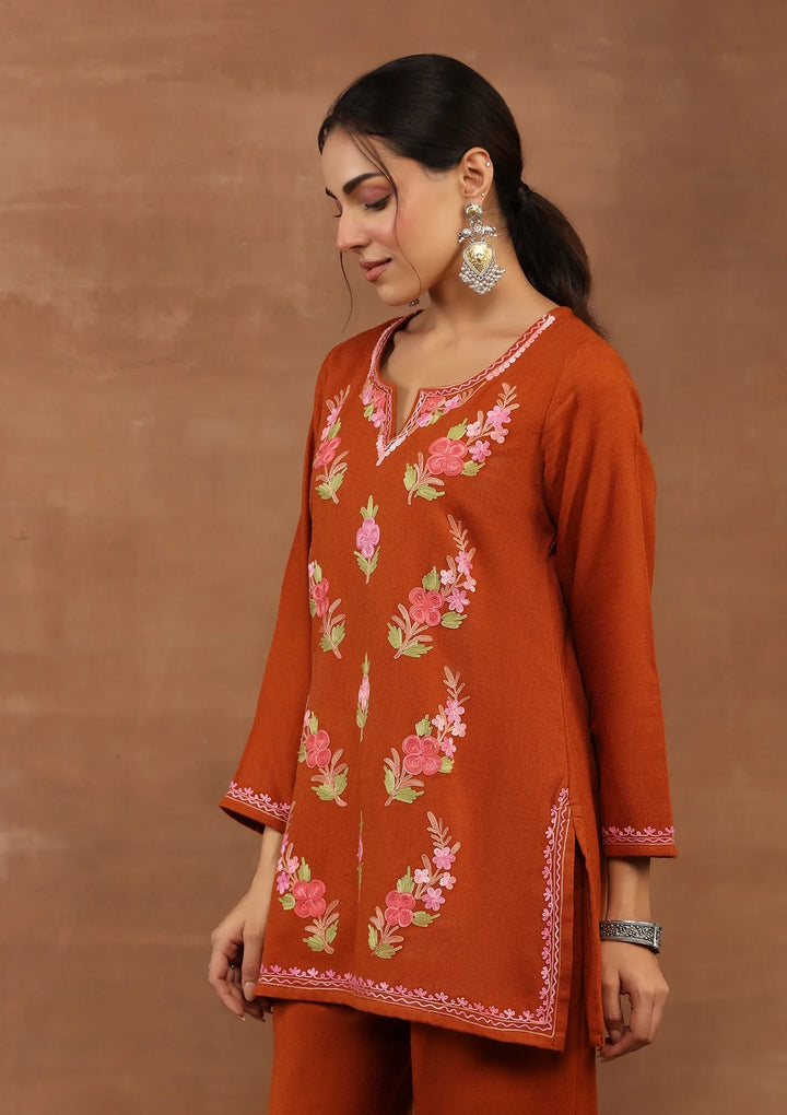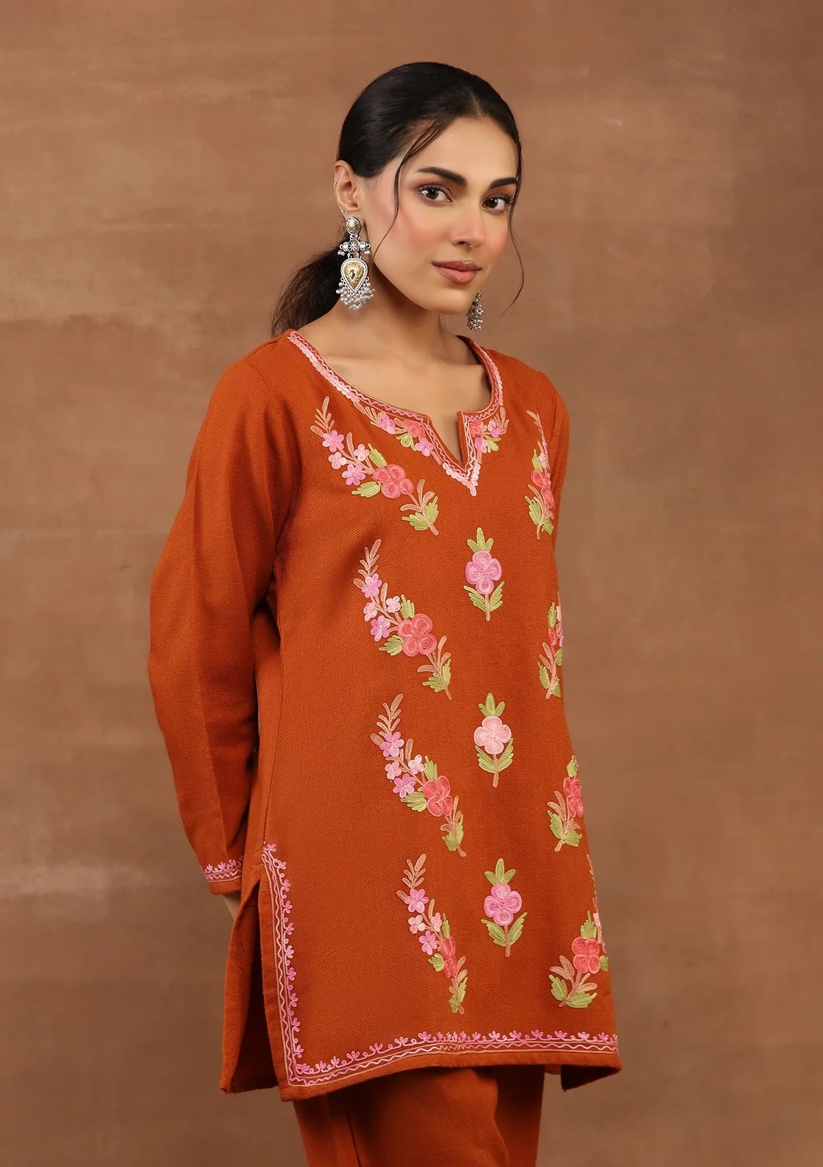 HOC Wool Aari Embroidered Solid Women's Short Kurta-Rust