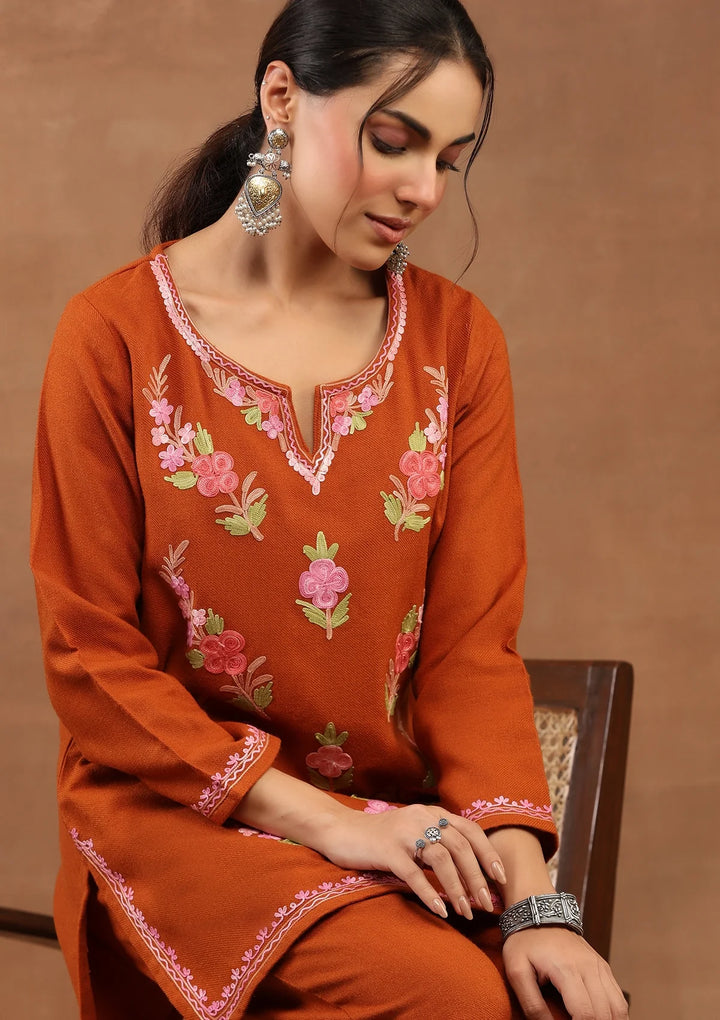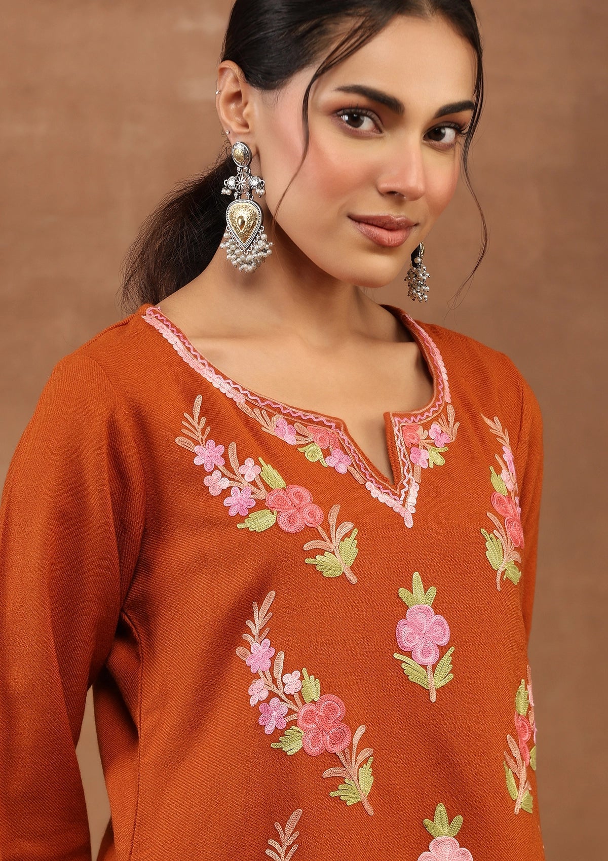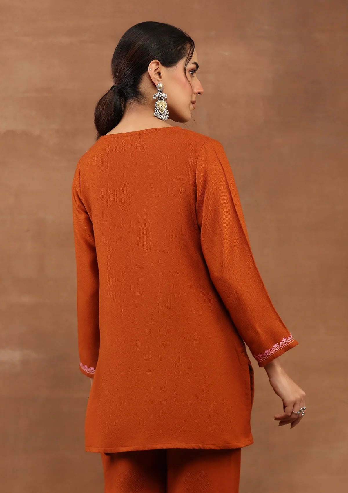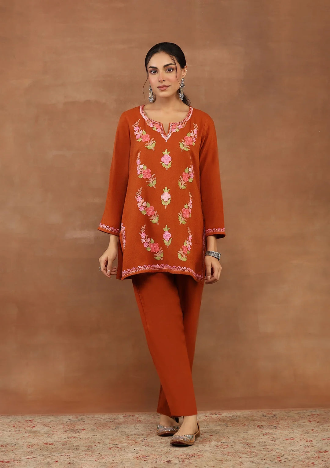 HOC Wool Aari Embroidered Solid Women's Short Kurta-Rust