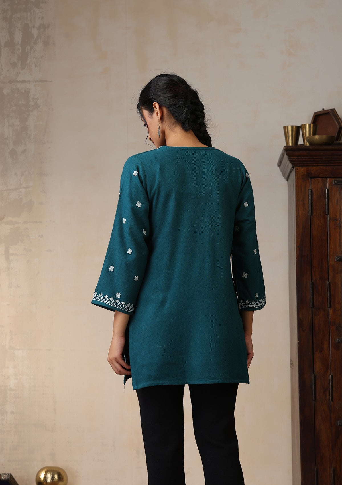 HOC Wool Aari Embroidered Solid Women's Short Kurta - Teal