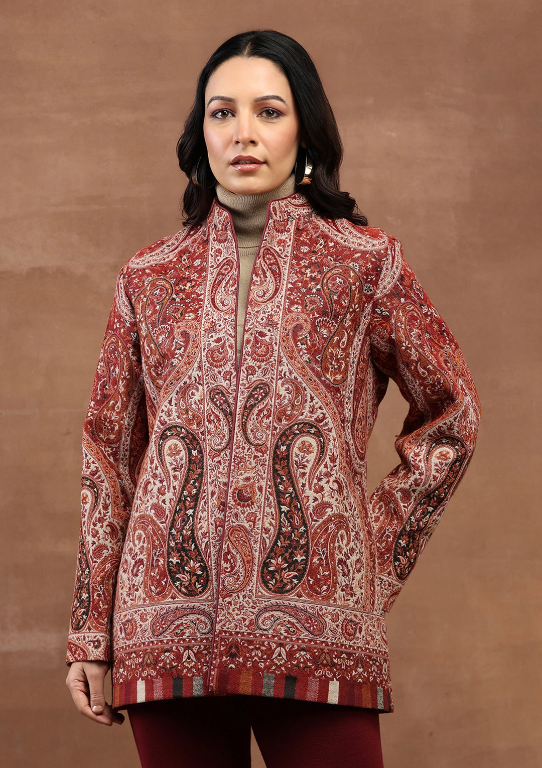 HOC Banarasi Mul Chanderi Chikankari Solid Women's 4PC Angrakha Kurta Set - Wine