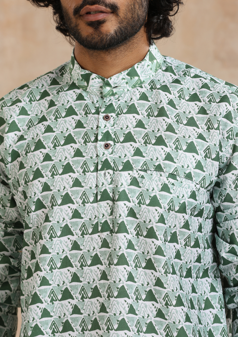 This printed green short kurta for men is made from a premium poly-cotton blend. The lightweight fabric and comfortable silhouette make this green kurta for men a must-have for anyone looking to make a dapper fashion statement.