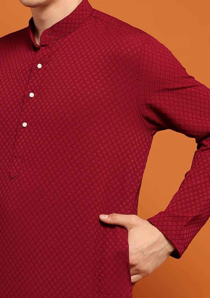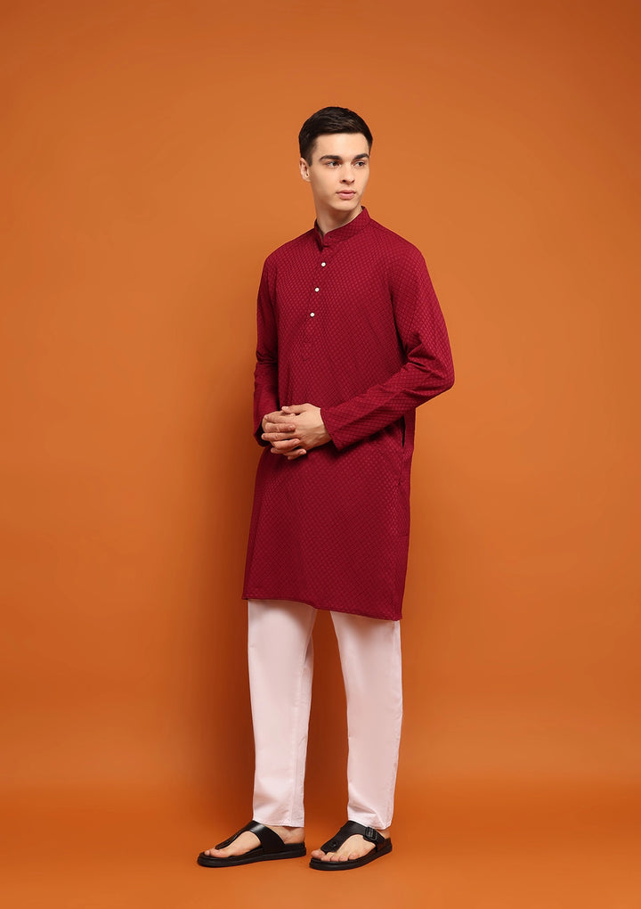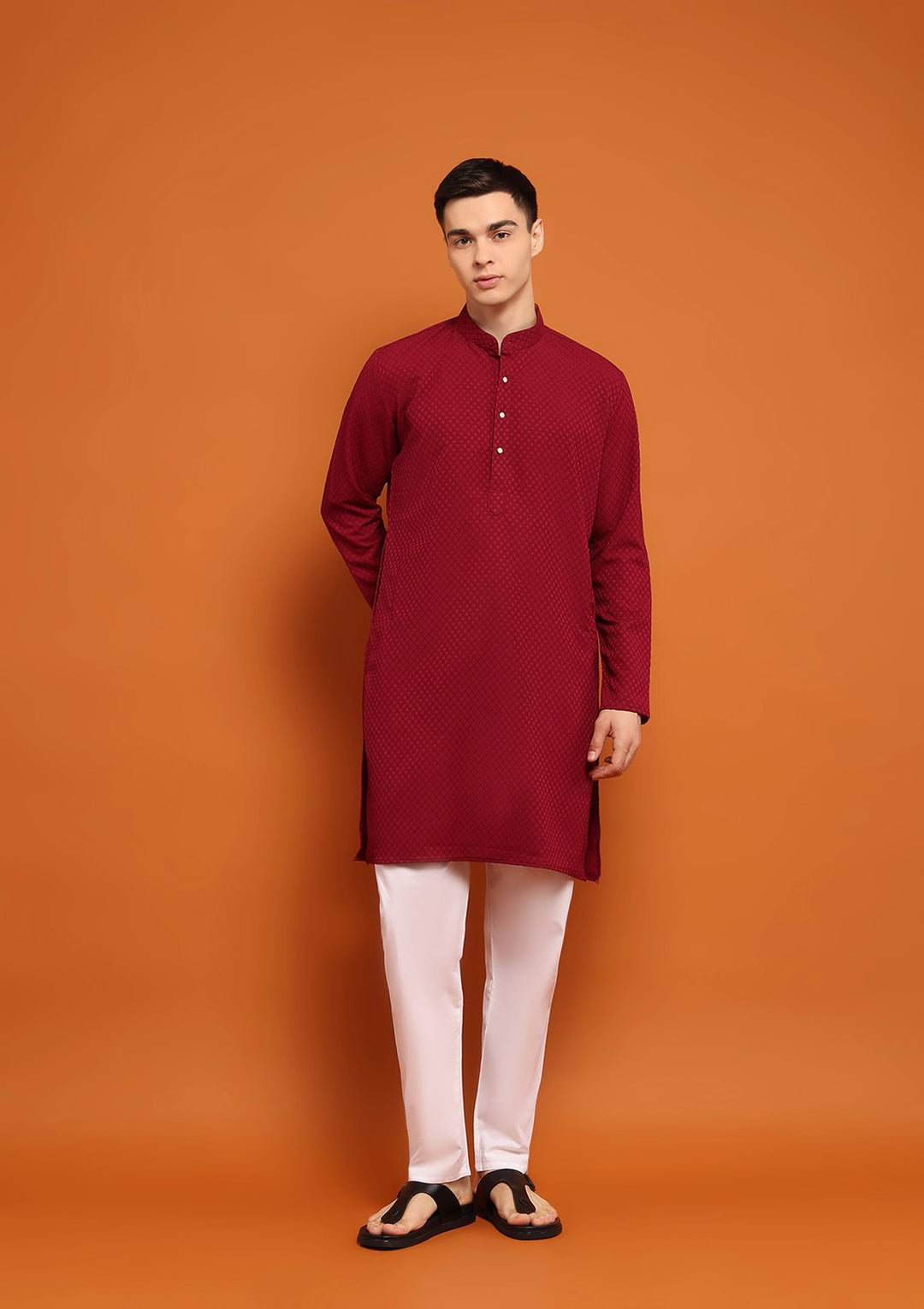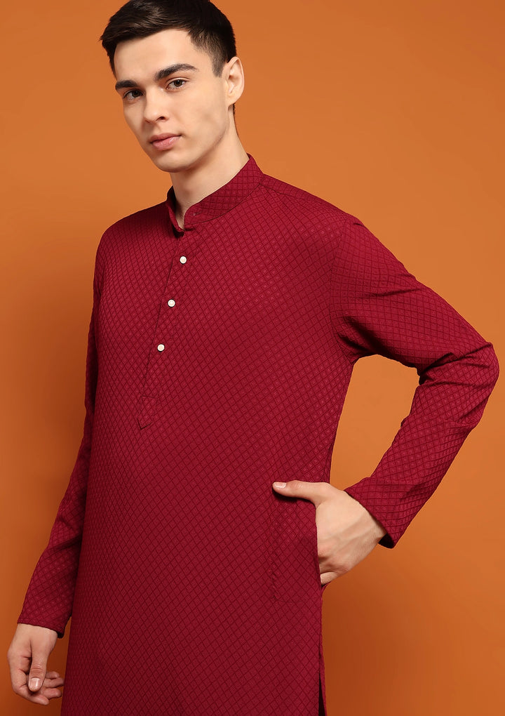 HOC Dobby Textured Solid Men's Long Kurta - Maroon