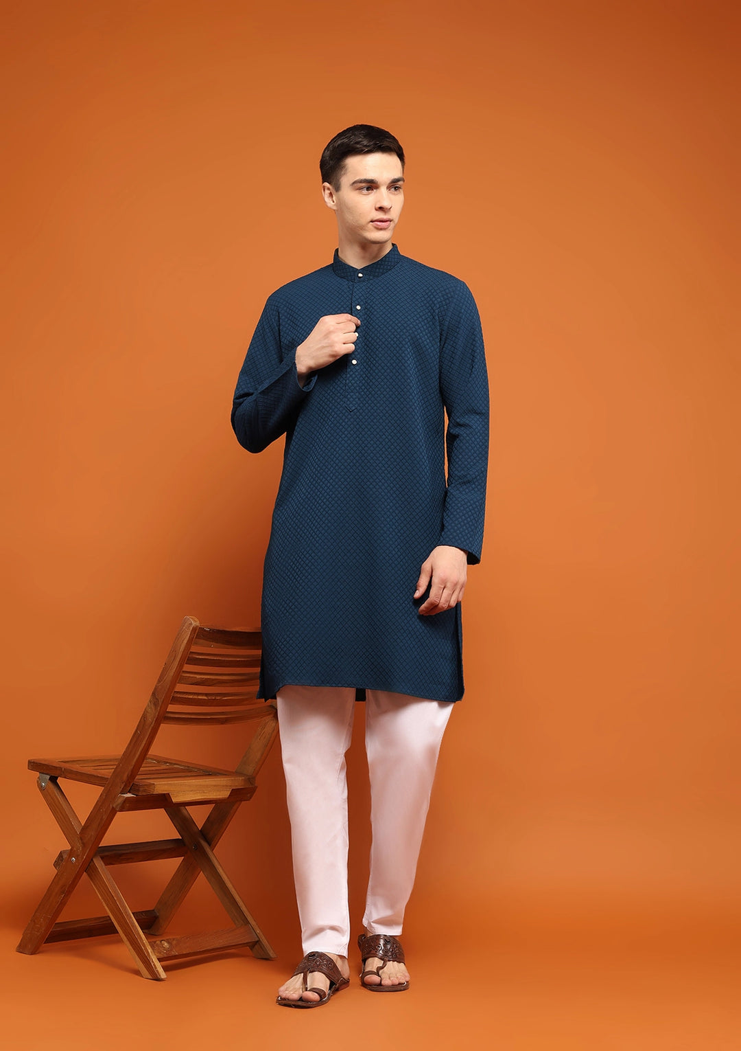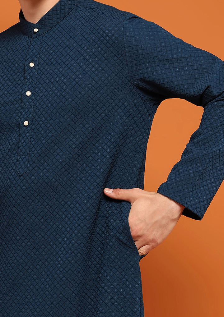 HOC Dobby Textured Solid Men's Long Kurta - Navy Blue