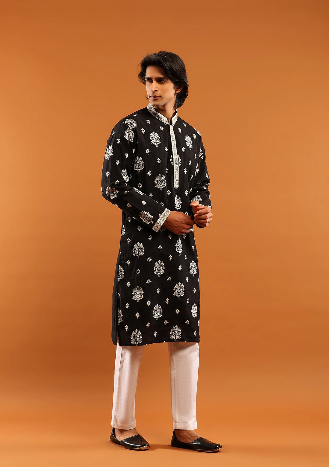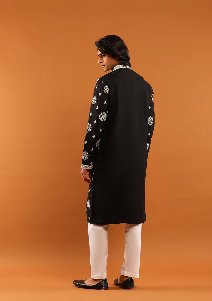 HOC Poly Silk Zari Embroidered Solid Men's Long Kurta- Black