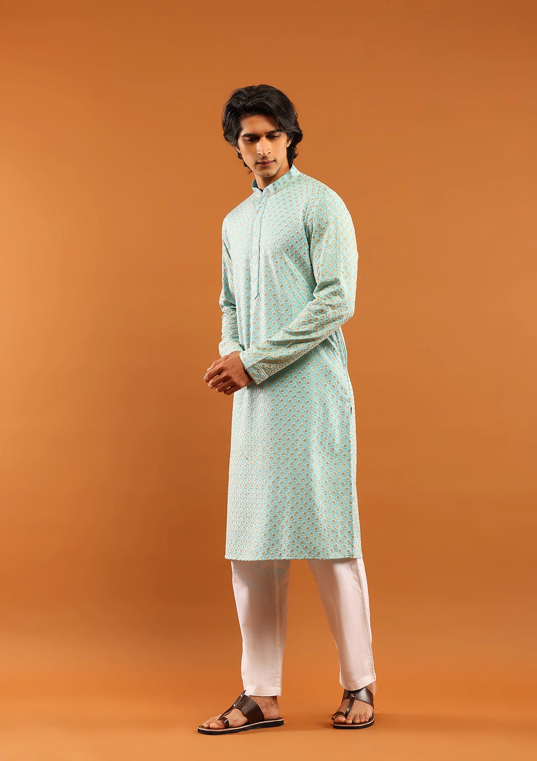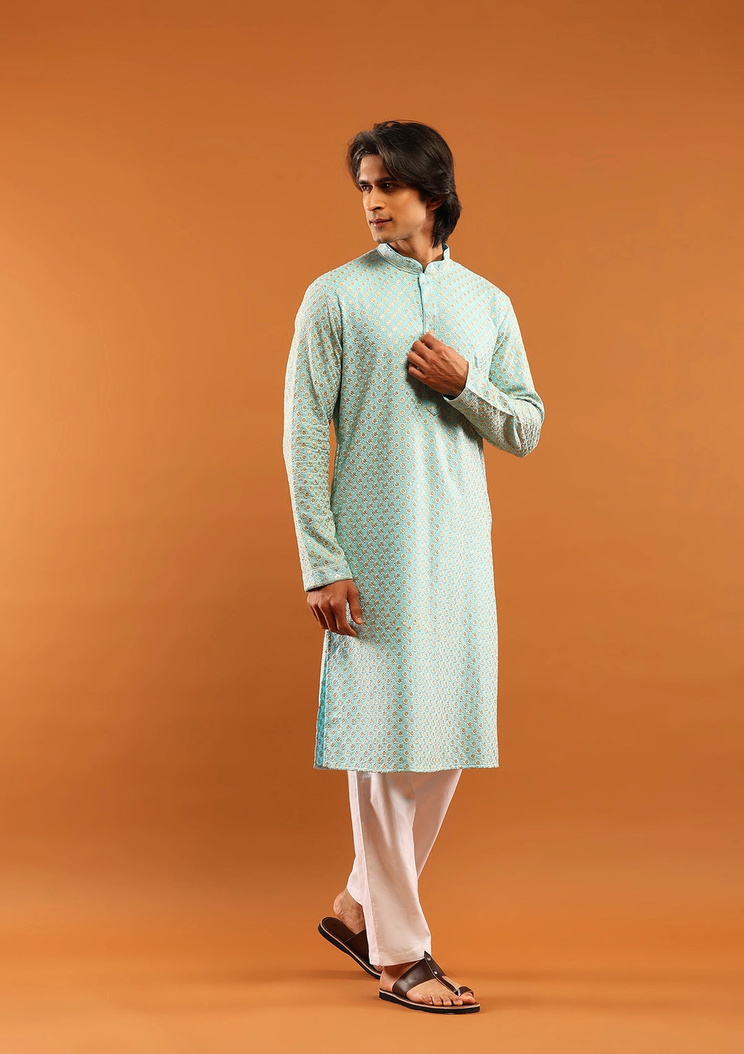 HOC Rayon Embroidered With Sequins Solid Men's Long Kurta- Aqua Blue