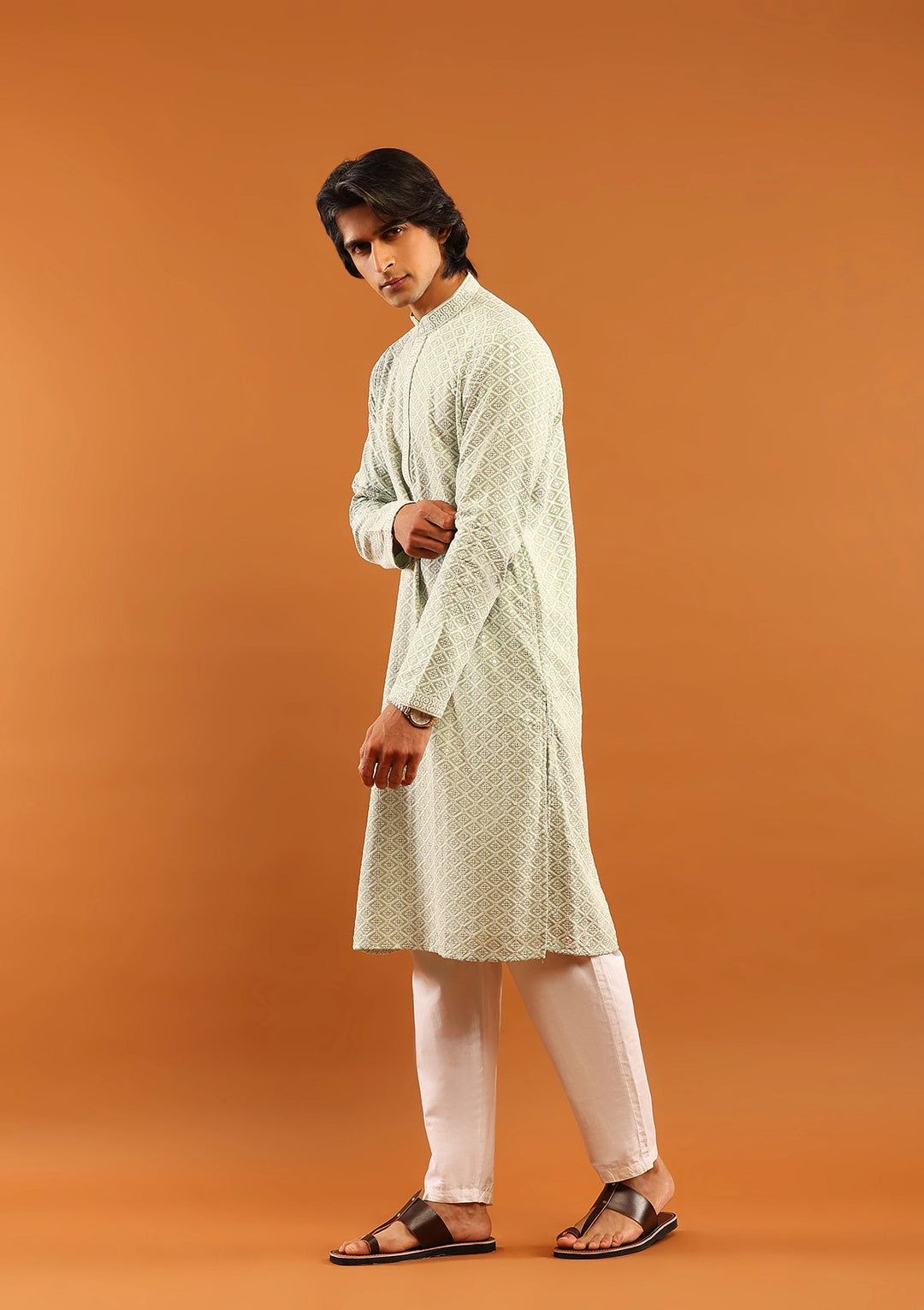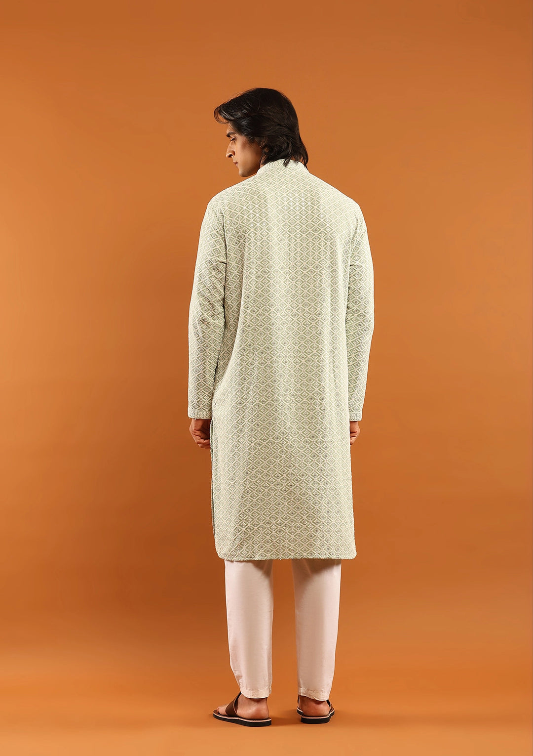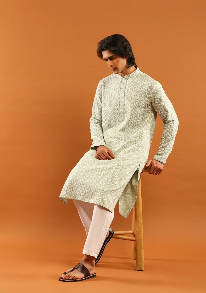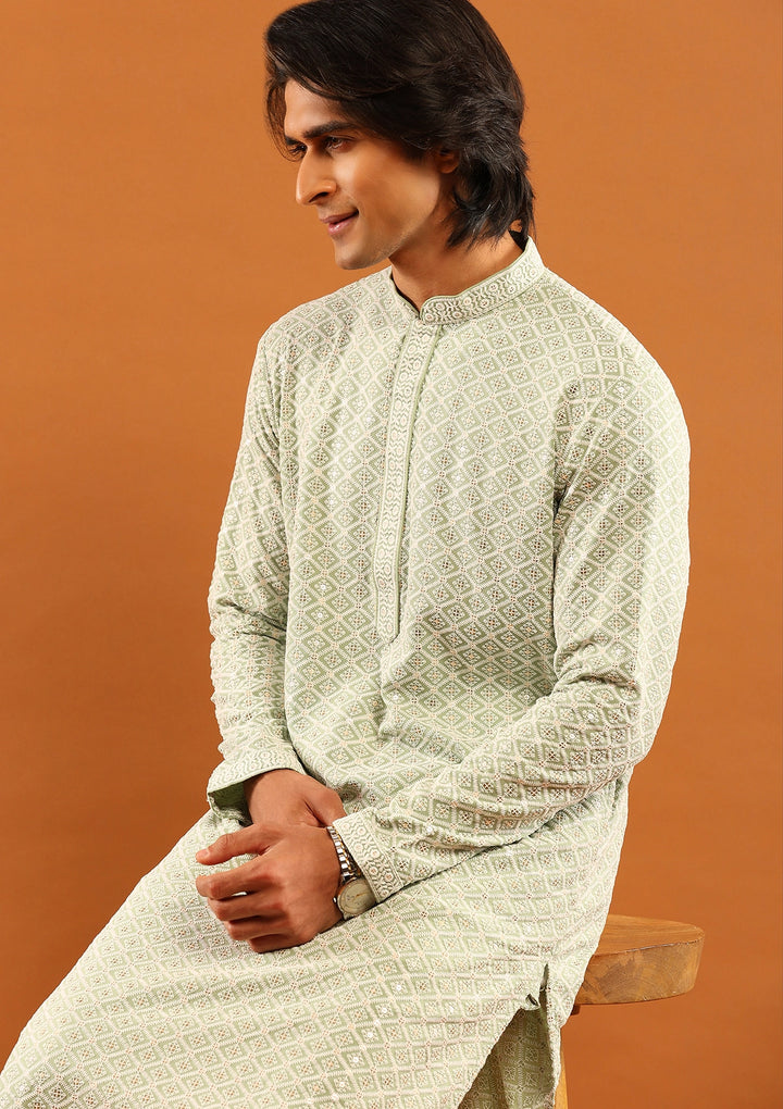 HOC Rayon Embroidered With Sequins Solid Men's Long Kurta- Pista Green