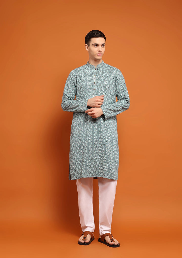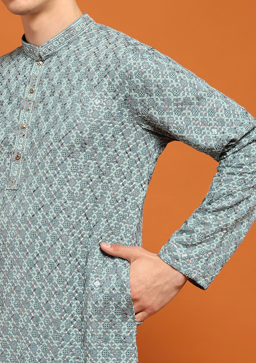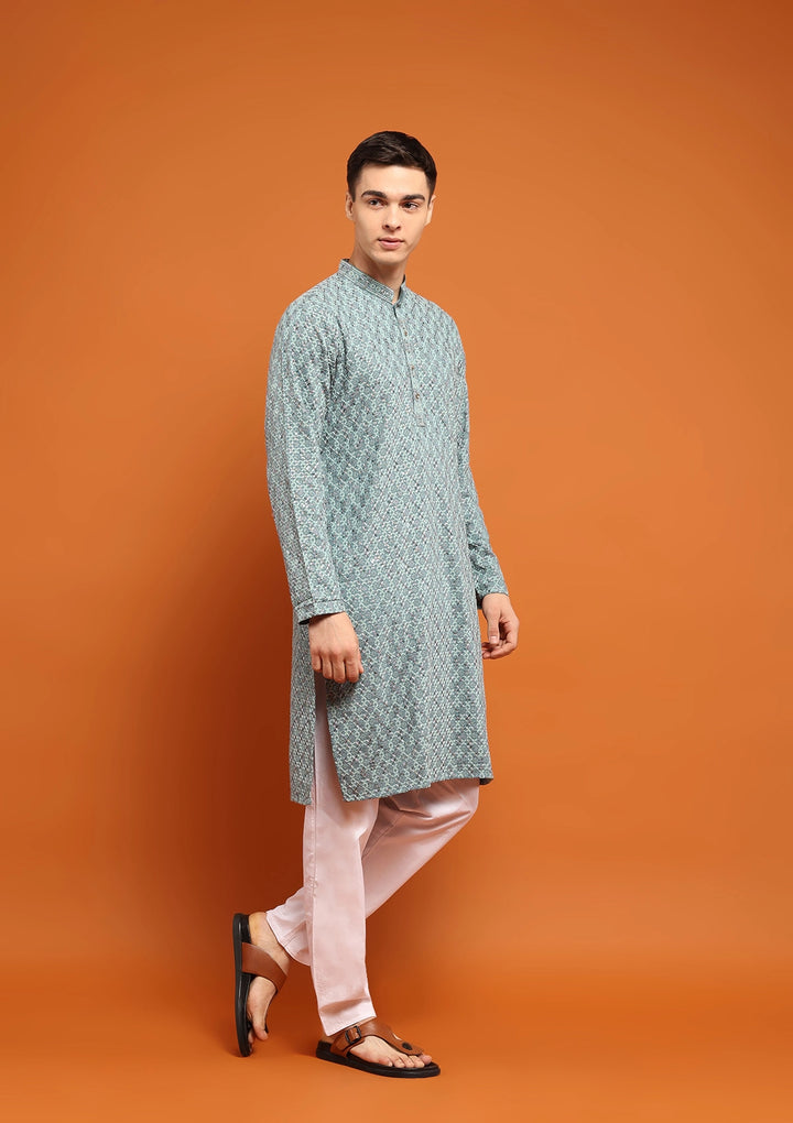 HOC Rayon Embroidered With Sequins Solid Men's Long Kurta- Seafoam Green