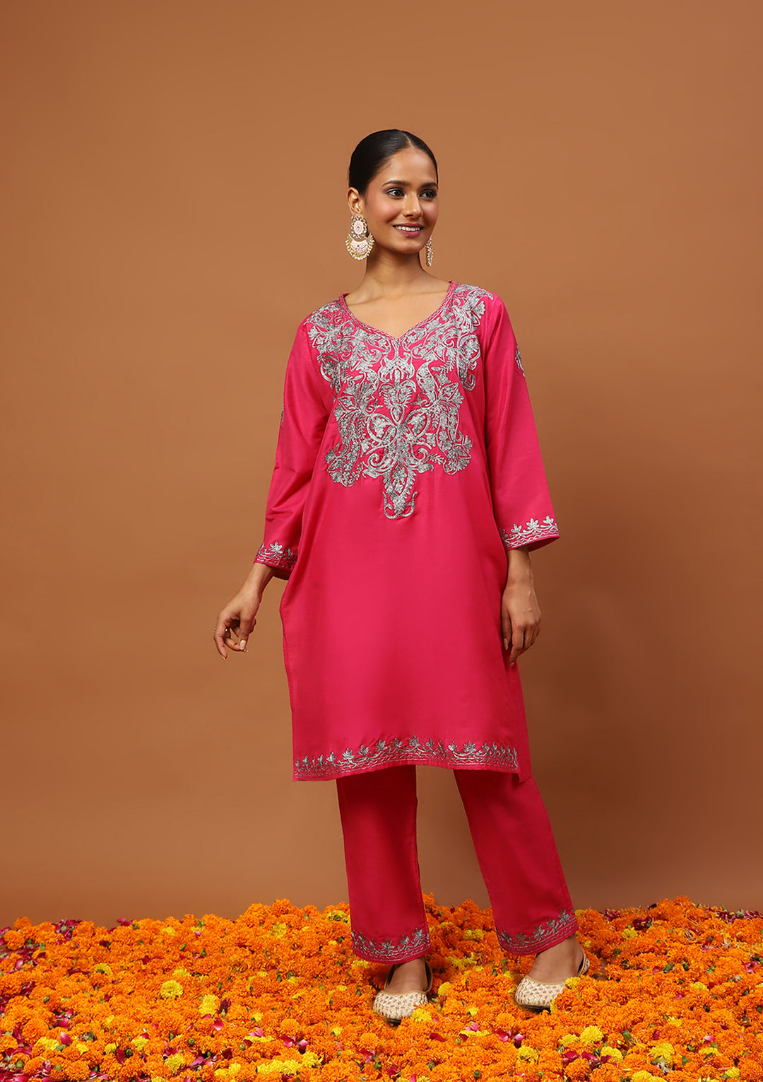 HOC Art Silk Embroidered Zari Solid Women's 2 PC Knee Kurta Set - Magenta