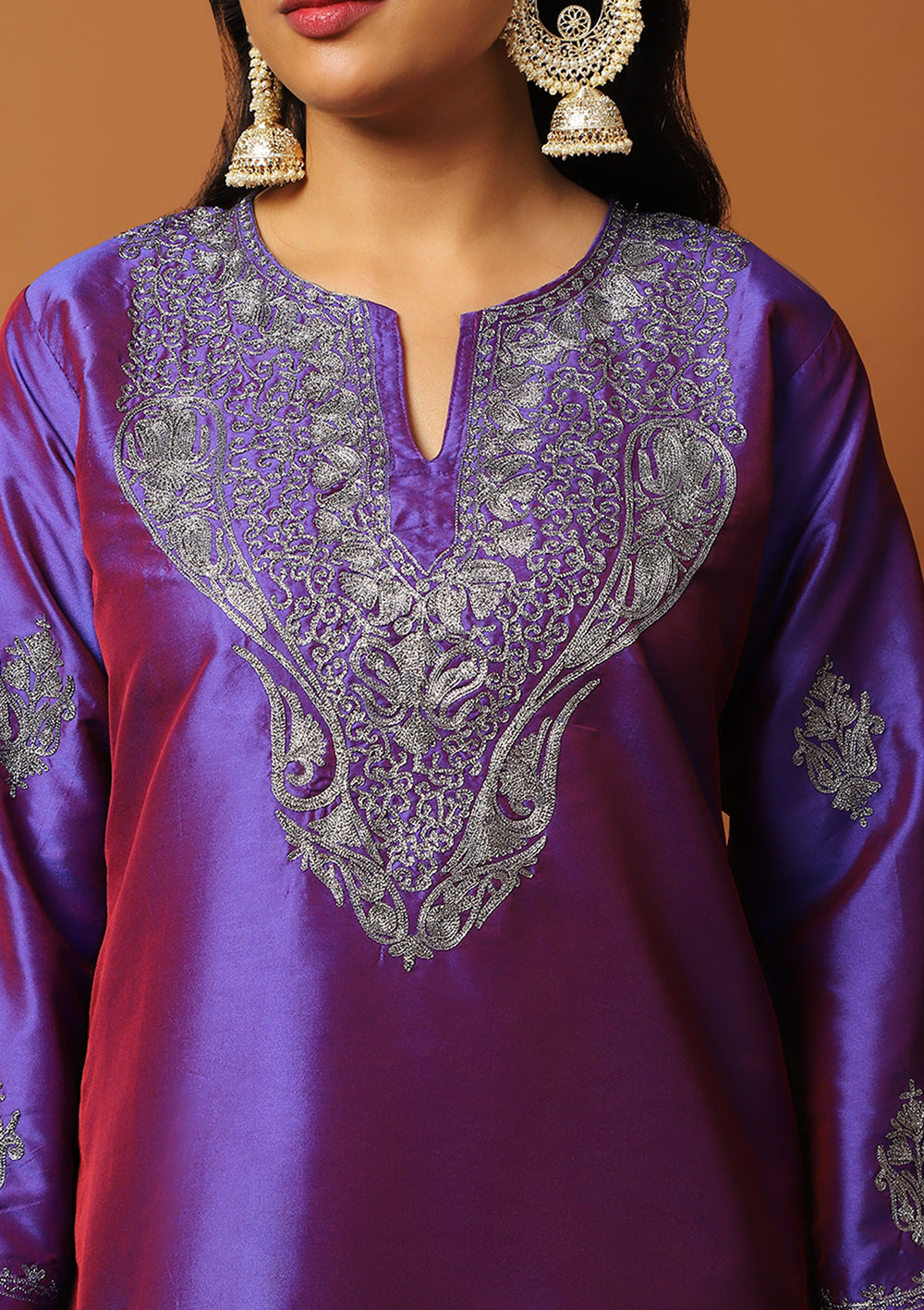 HOC Art Silk Embroidered Zari Solid Women's 2 PC Knee Length Kurta Set - Purple