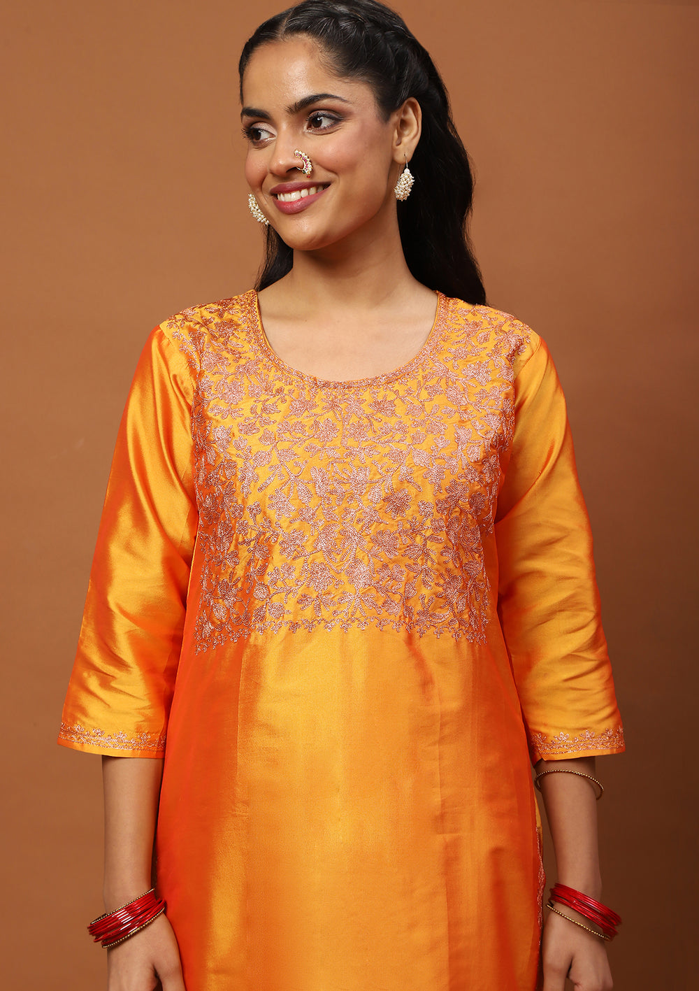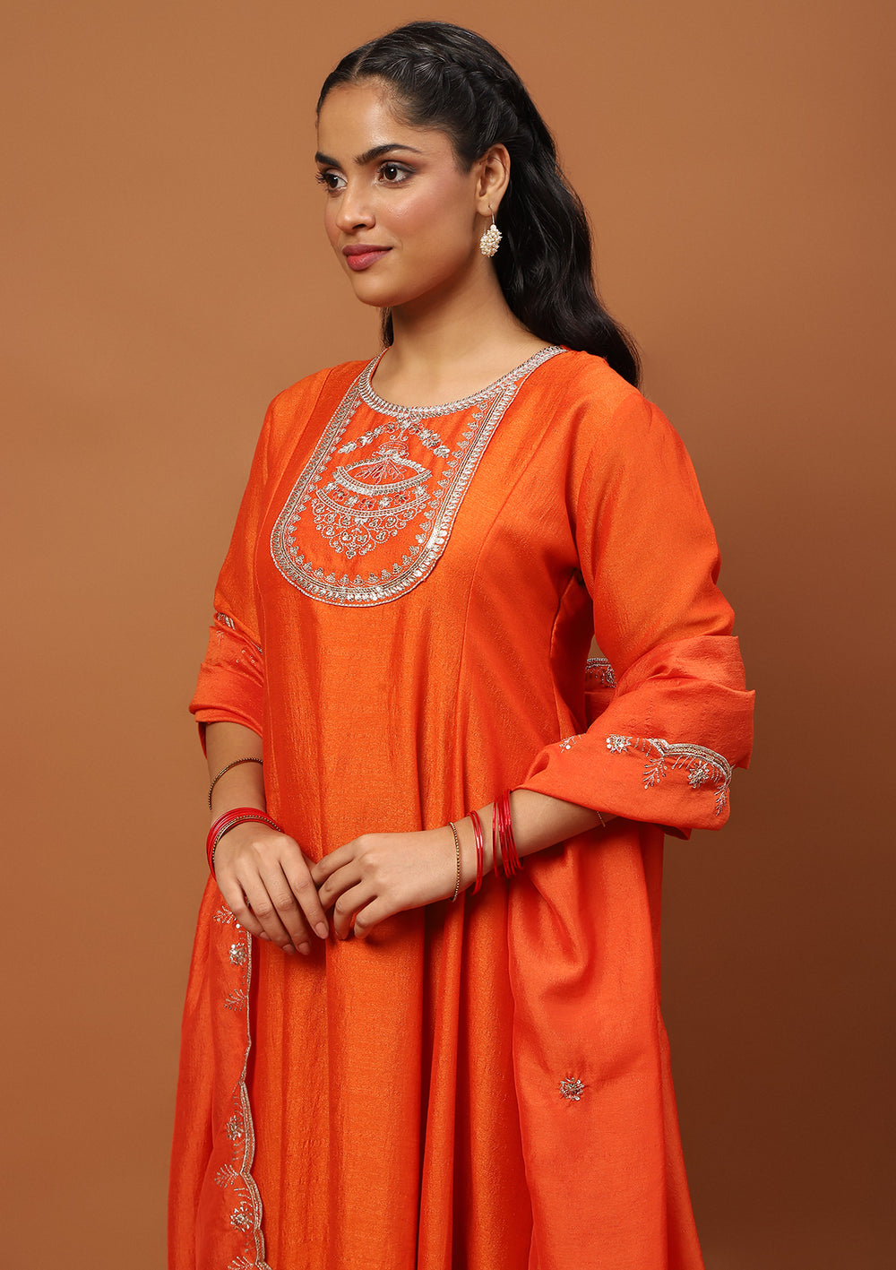 HOC Silk Blend Zari Embroidered With Sequins Solid Women's 3PC Anarkali Kurta Set-Orange