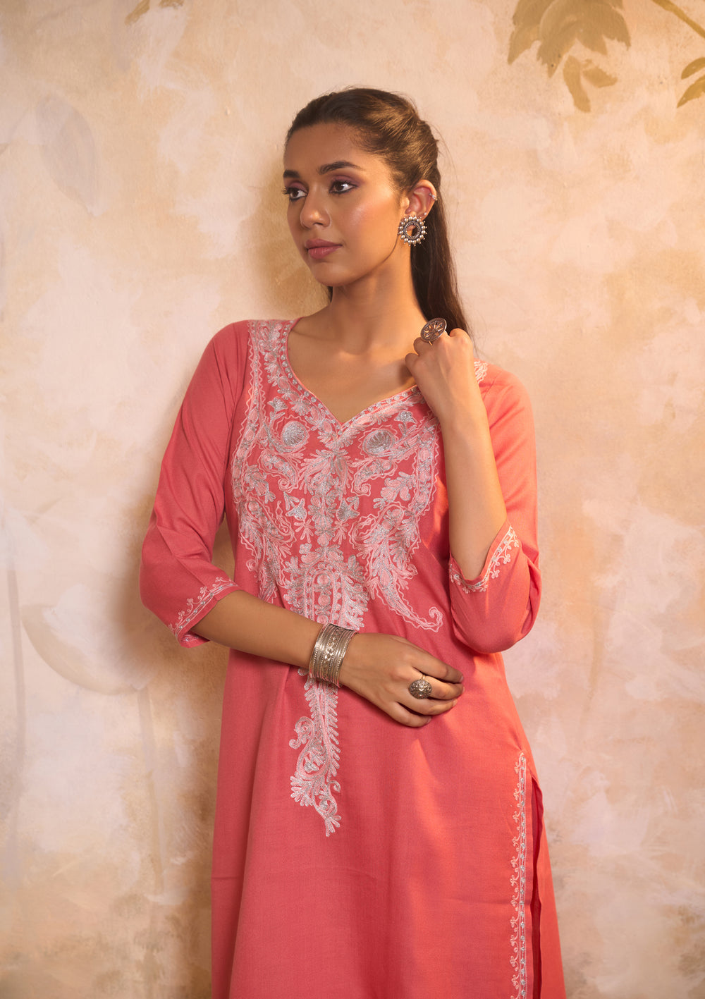 HOC Silk Blend Zari Embroidered With Sequins Solid Women's 3 PC Straight Kurta Set-Rose Pink