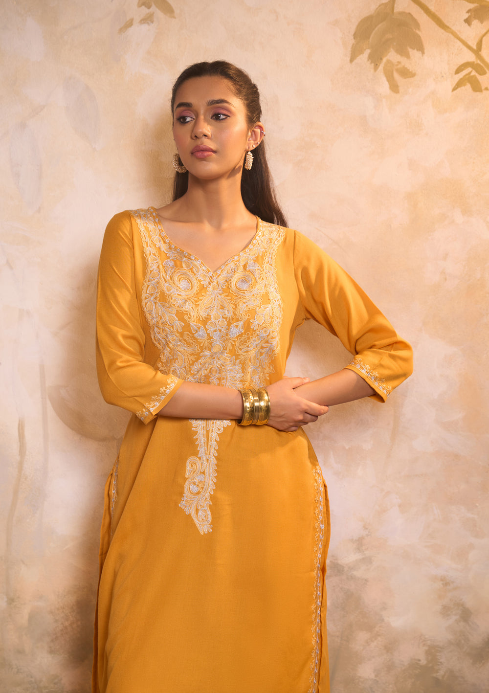 HOC Cotton Embroidered Aari With Zari Work Solid Women's 2 PC Long Kurta Set - Yellow