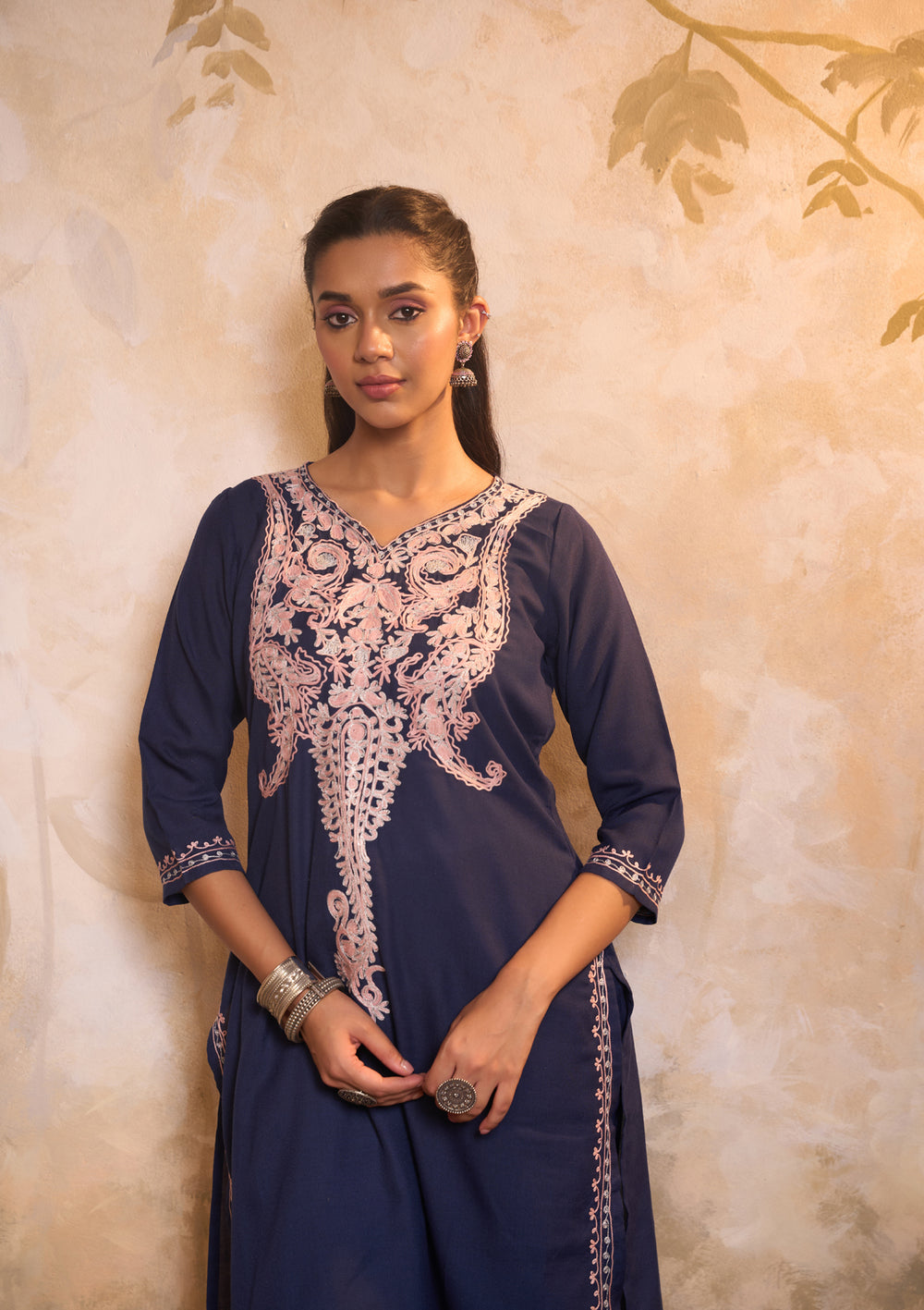 HOC Cotton Embroidered Aari With Zari Work Solid Women's 2 PC Long Kurta Set - Navy Blue
