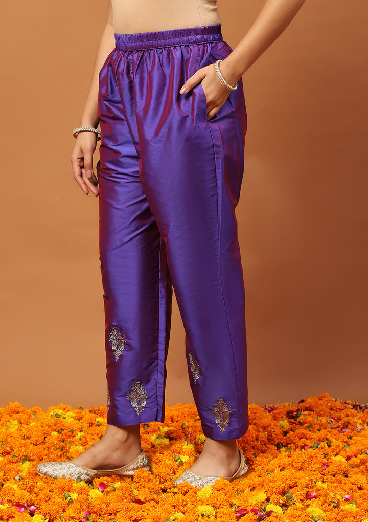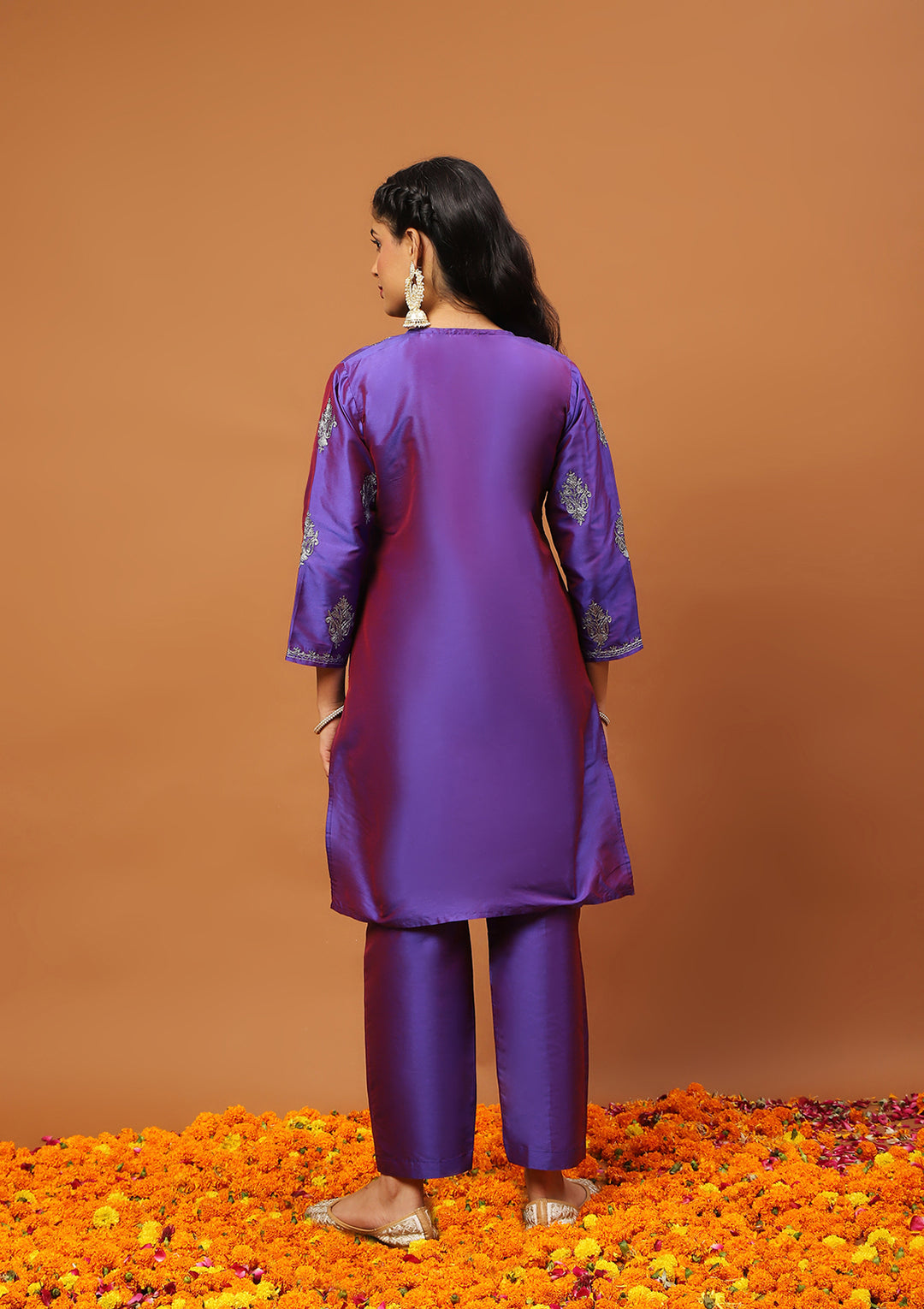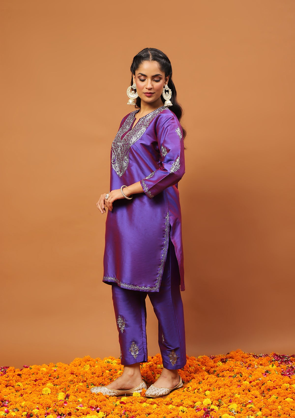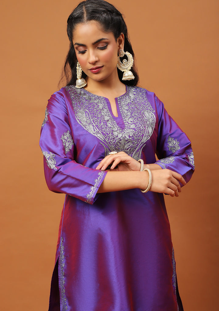 HOC Art Silk Embroidered Zari Solid Women's 2 PC Knee Length Kurta Set - Purple