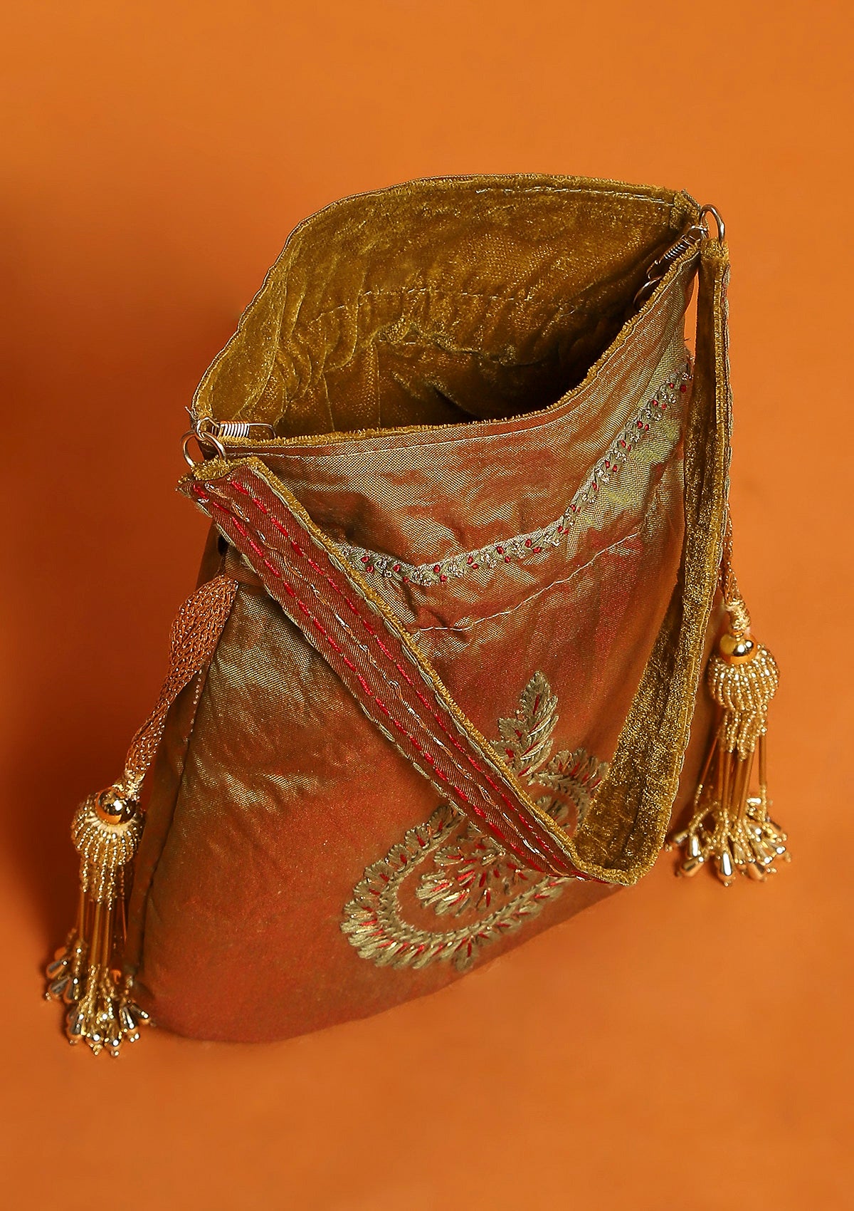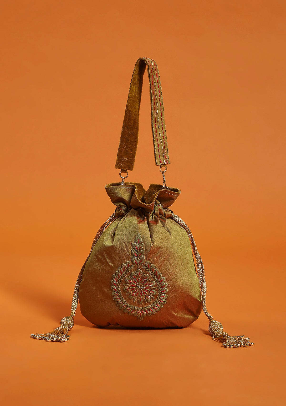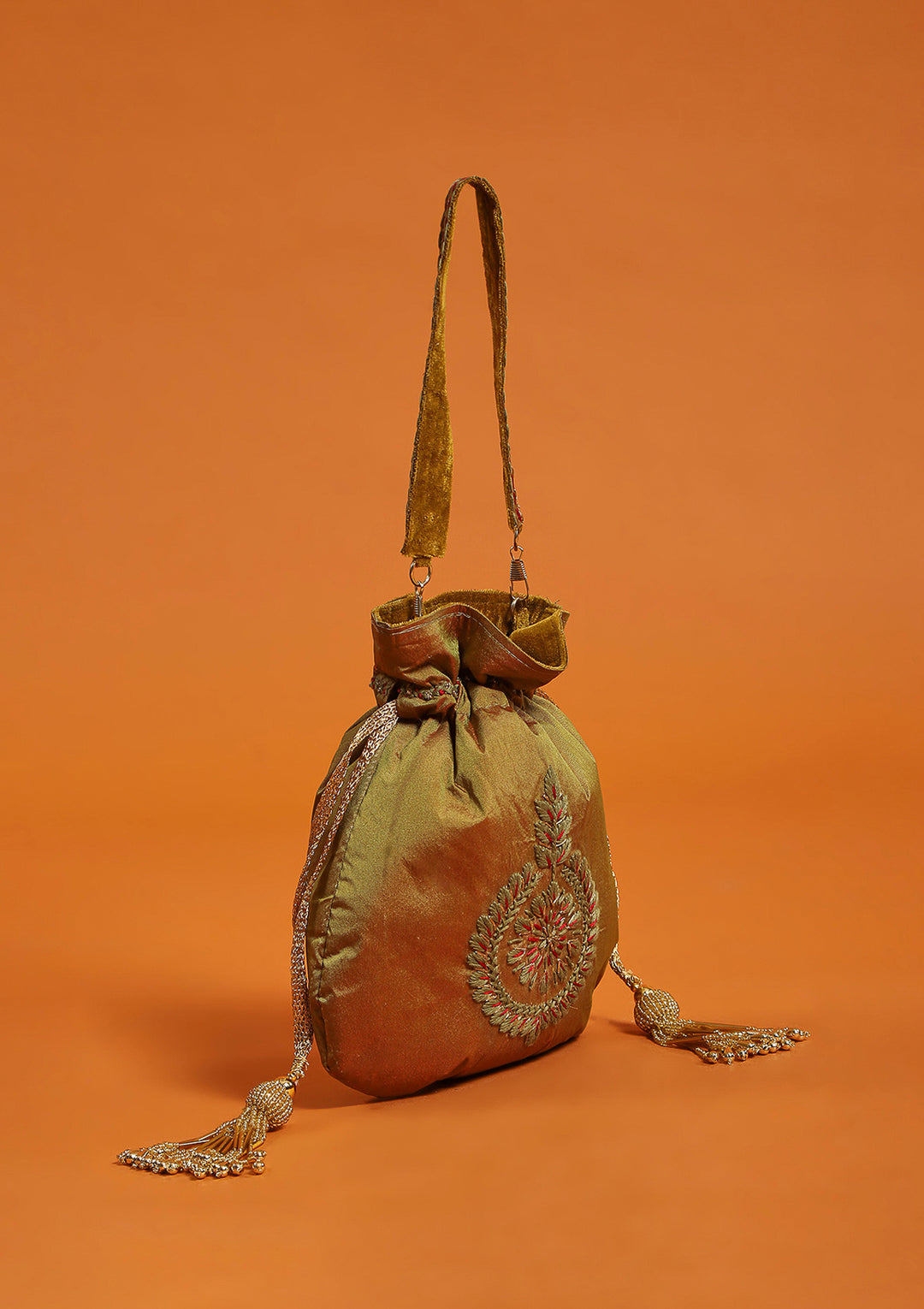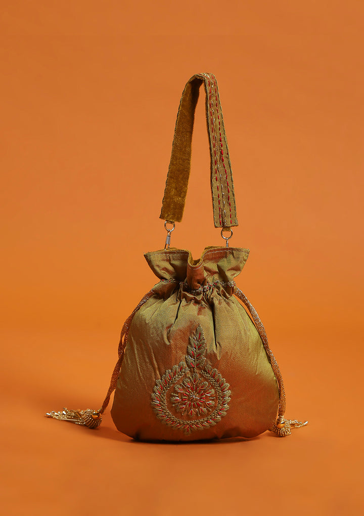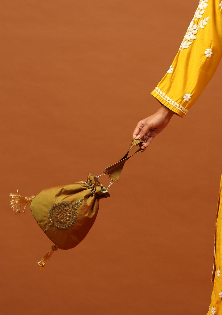 HOC Silk Chikankari Potli with Zari work -Olive Green