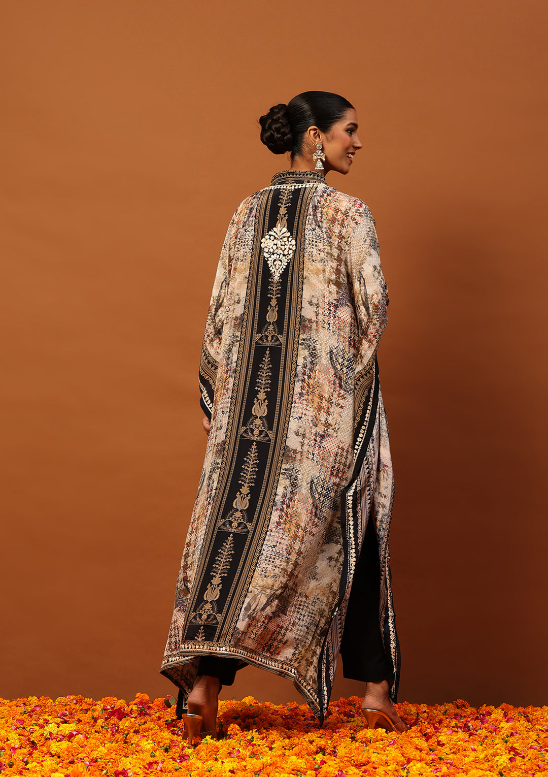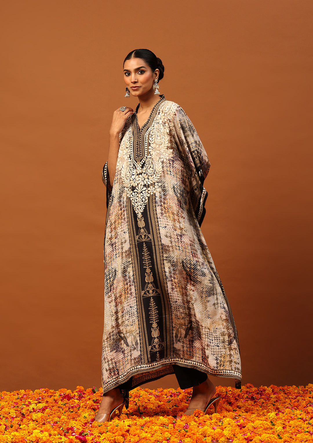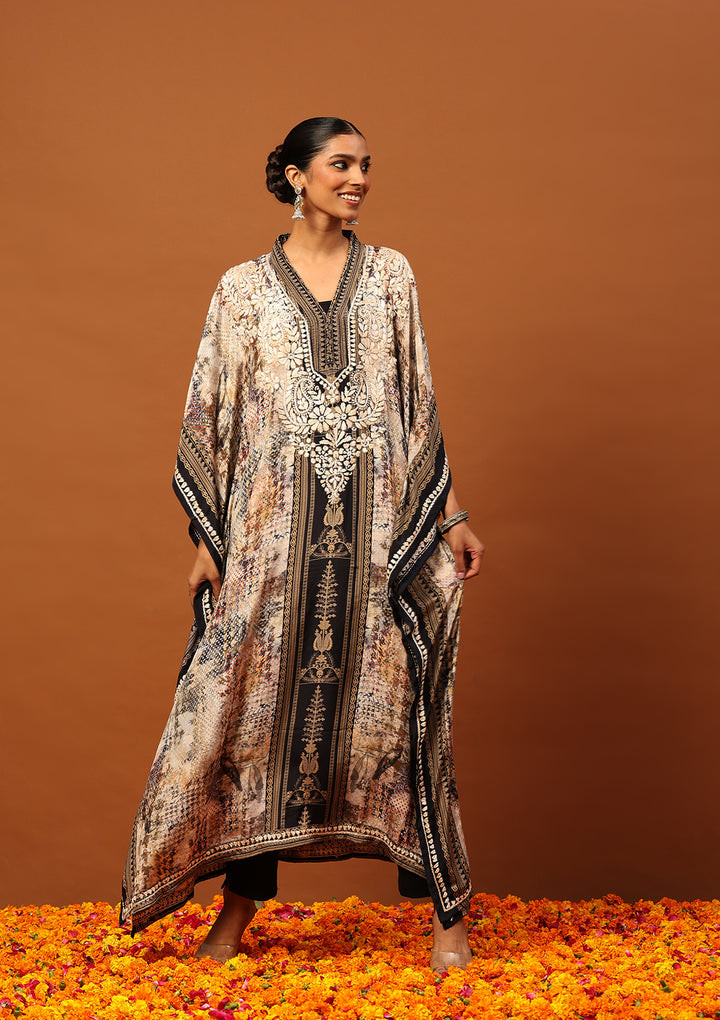 HOC Crepe Chikankari Printed Women's Kaftan -Brown