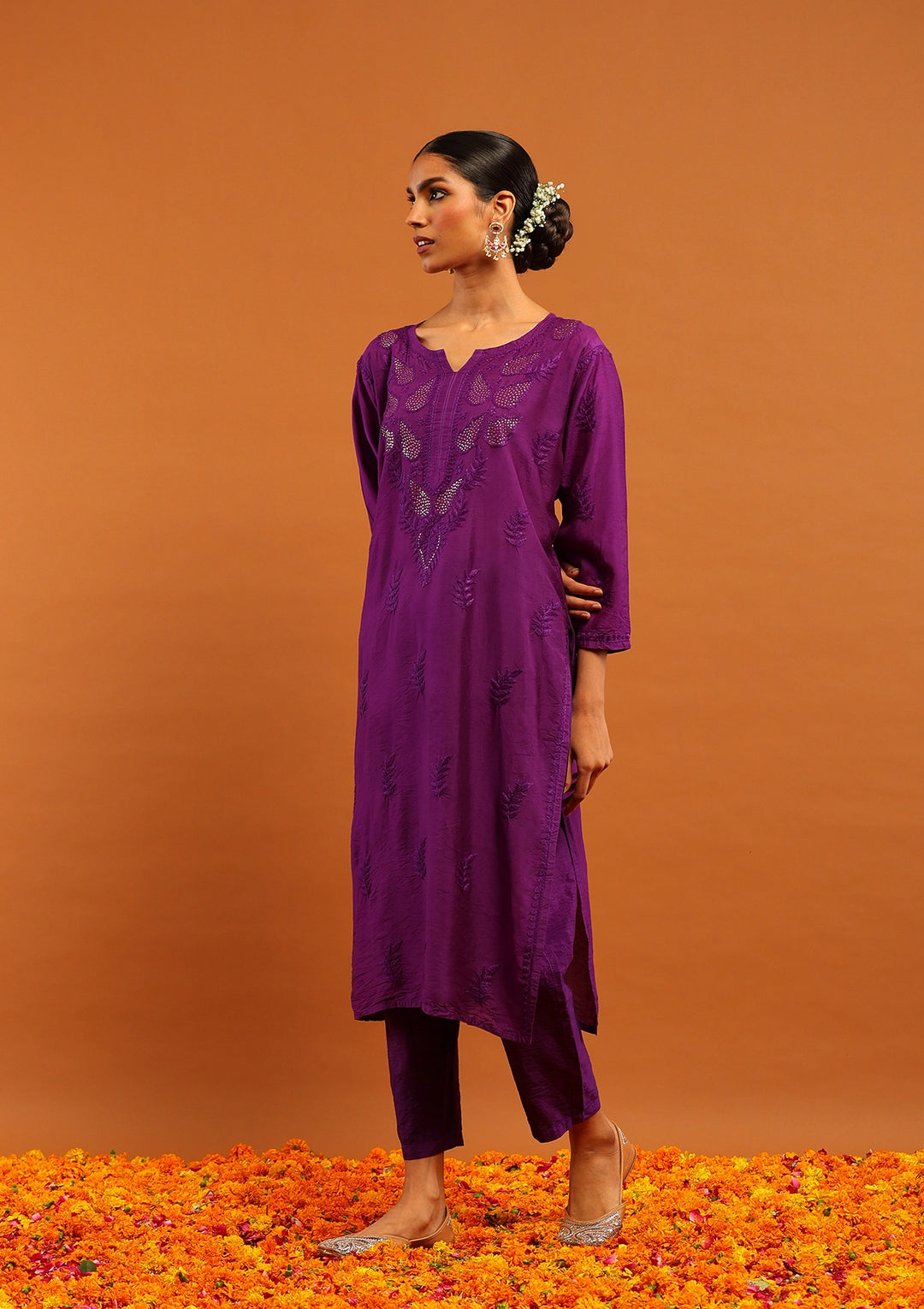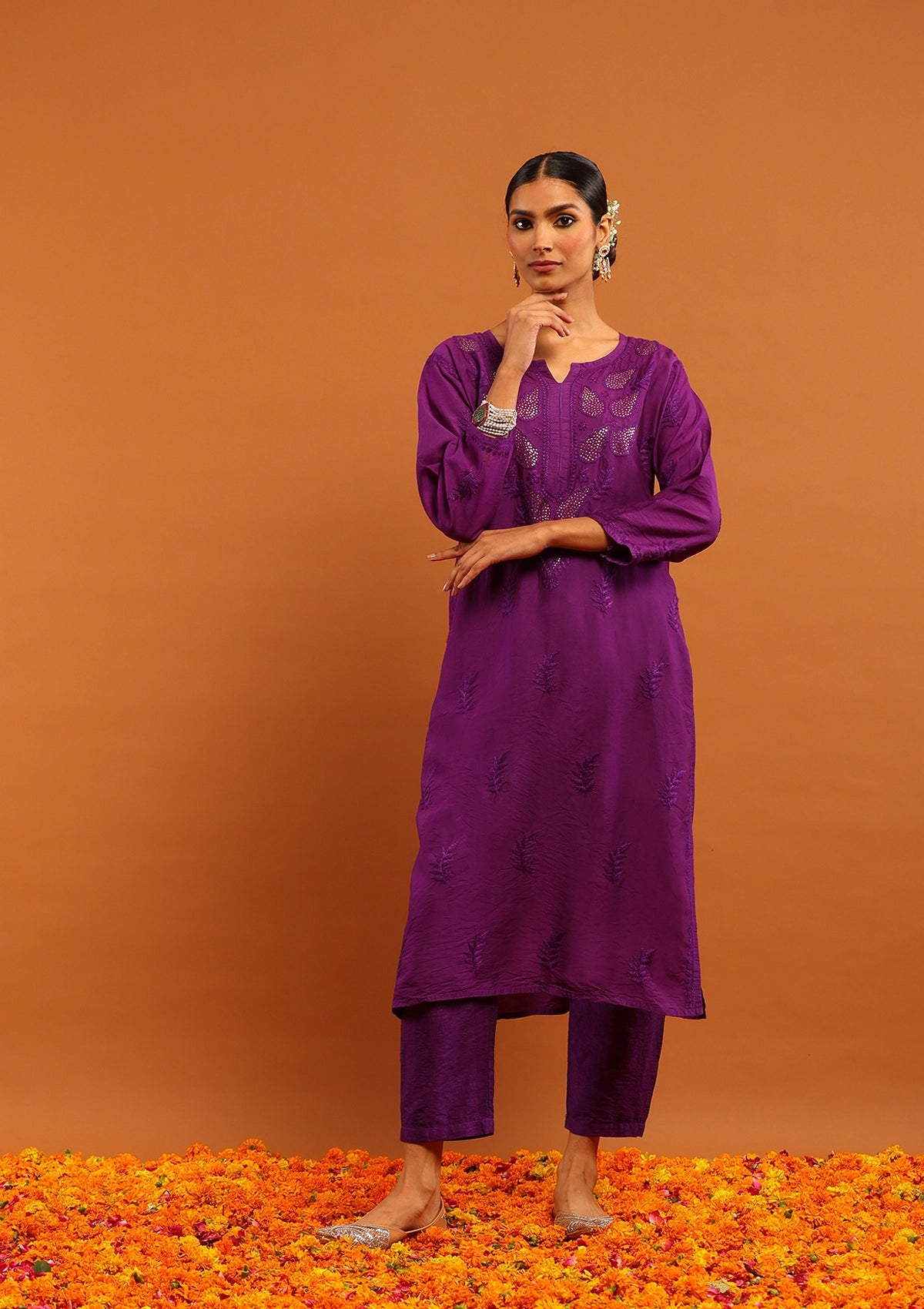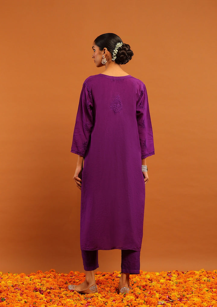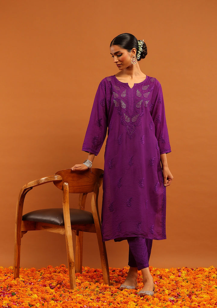 Karisma Chanderi Chikankari with Mukaish Solid Women's 2 PC Long Kurta Set- Purple
